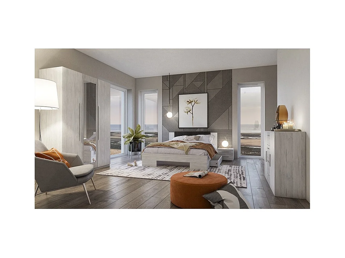 Cama de adulto 160x200 com gavetas integradas - Coleção FLOYD. Cor cinza com efeito de madeira