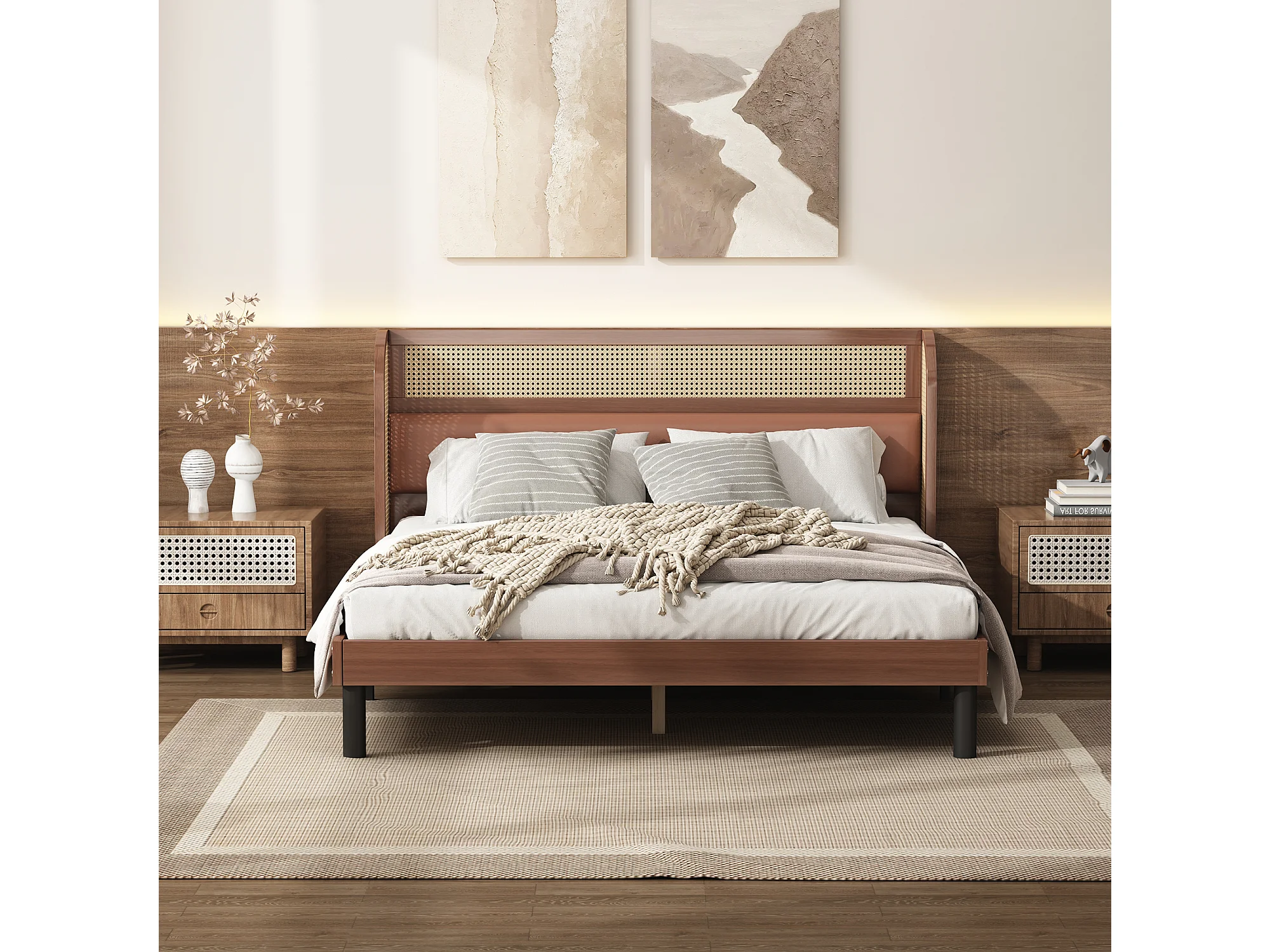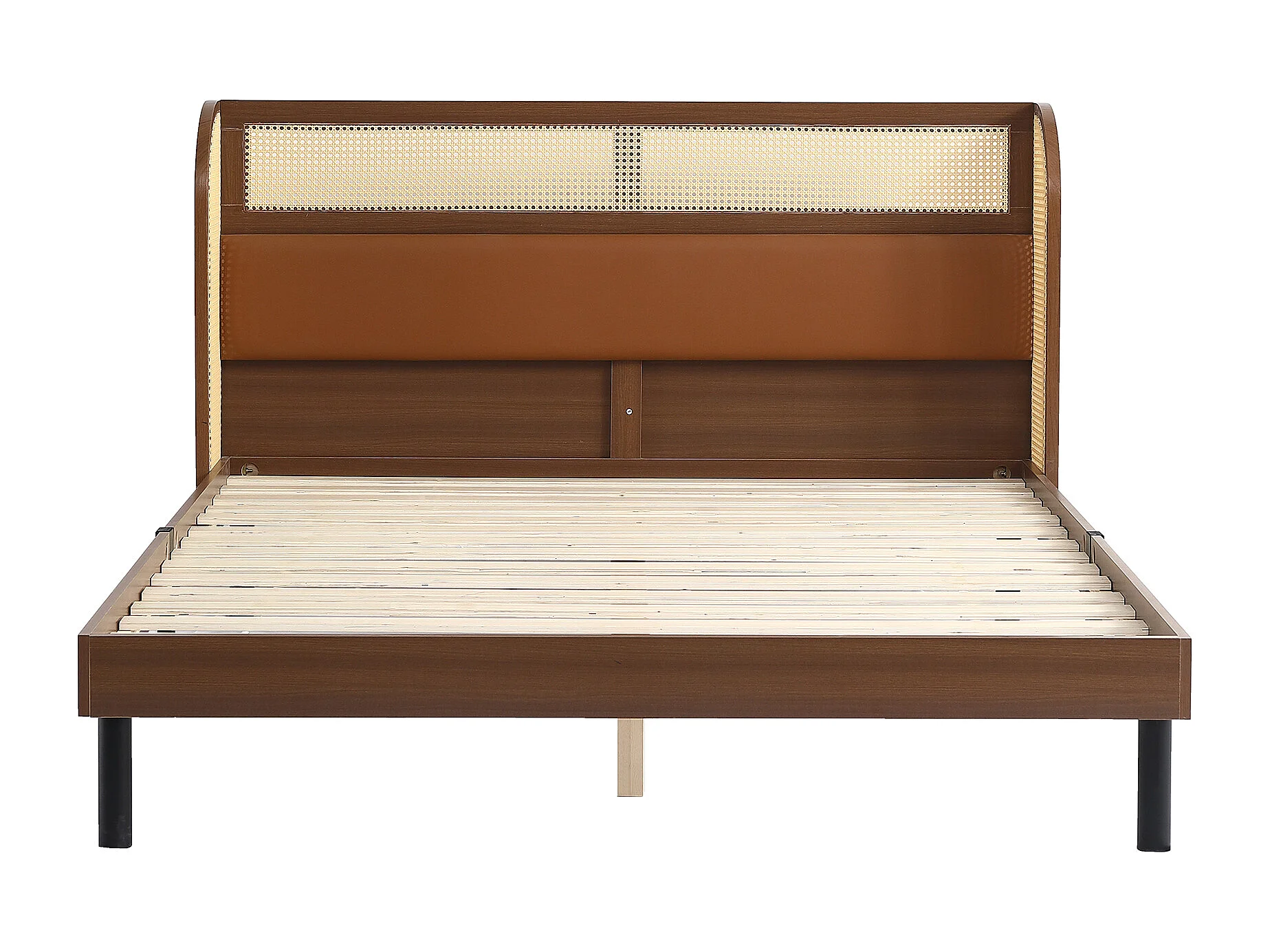 Cama de adulto 160x200cm, cama de casal em madeira de pinho + MDF, com estrado de ripas de madeira, e cabeceira de design em PVC + PU rattan, nogueira