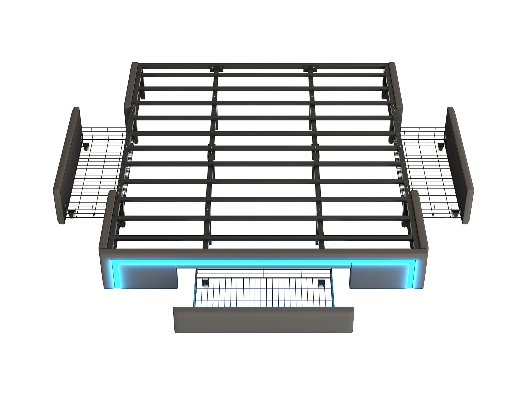 Cama de casal estofada 180x200 com cabeceira Led e carregador USB C + 4 gavetas, cinzento (sem colchão)