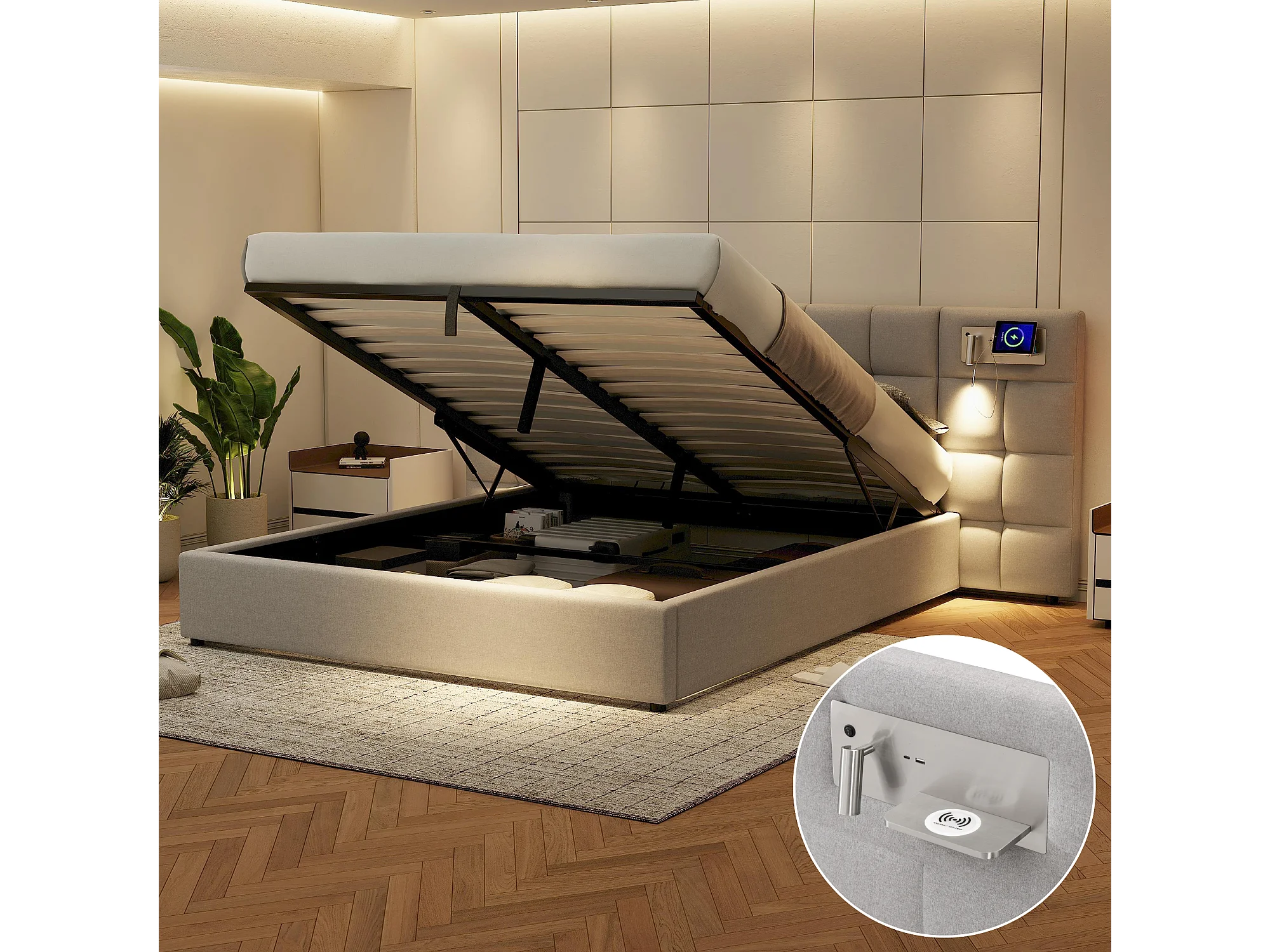 Cama de adulto 180x200 cm acolchoada em linho com USB, carregamento sem fio, iluminação e armazenamento cinza