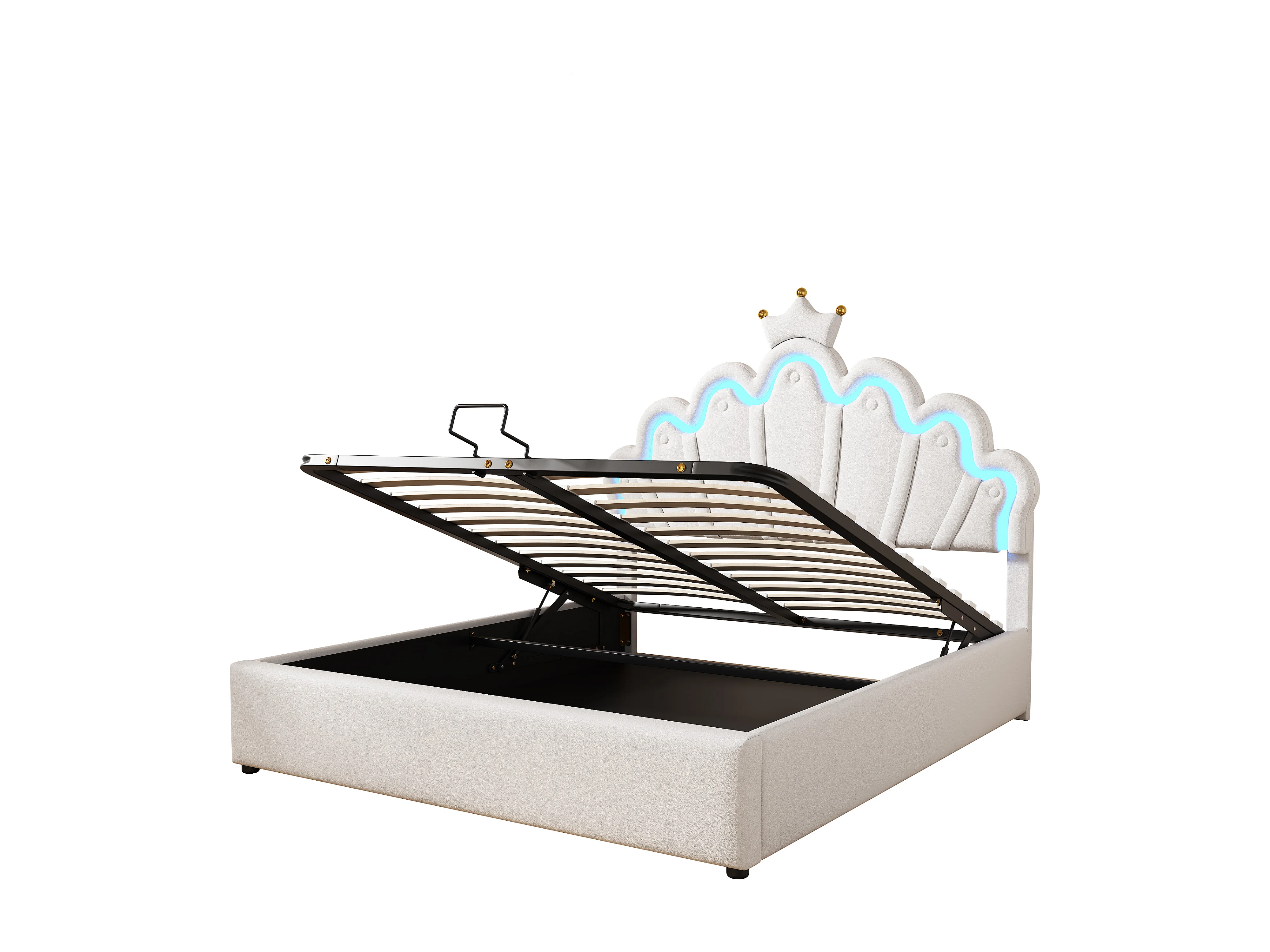 Cama com arrumação em forma de coroa, 140 x 200 cm - Cama de princesa - LEDs - Couro PU - Branca