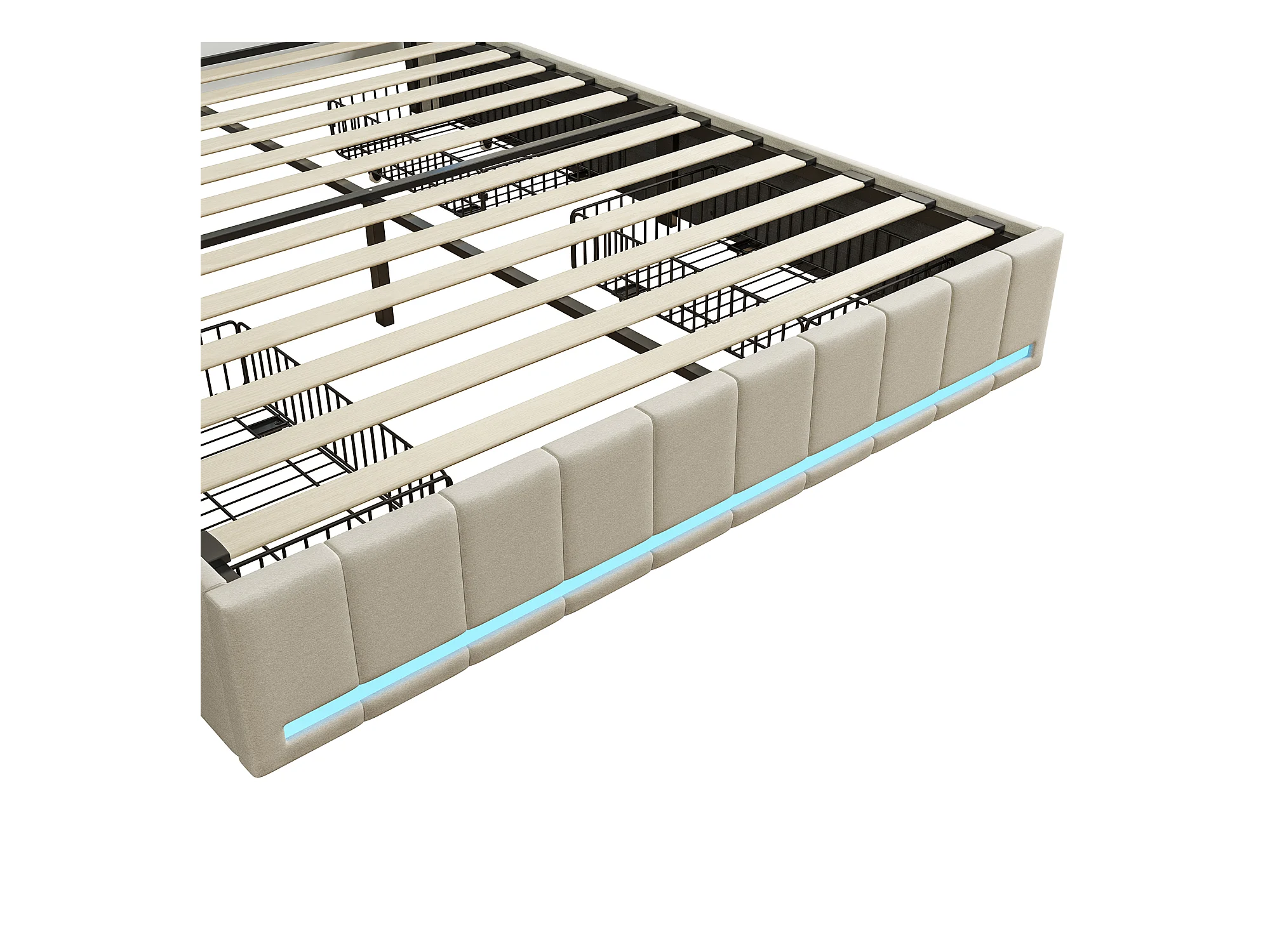 Cama de casal 140x200 cm com base LED e USB, cama com arrumação e base de ripas, bege