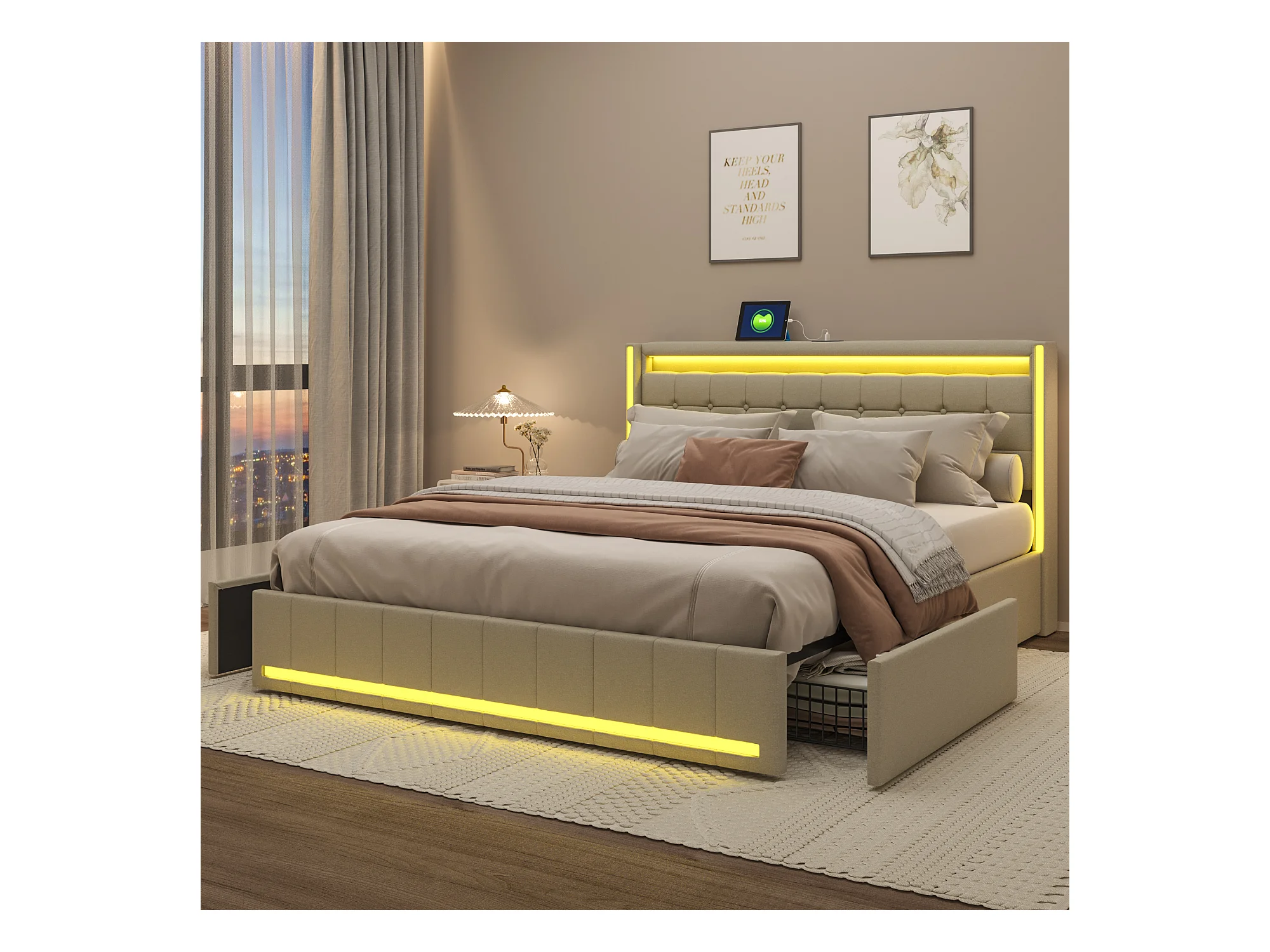 Cama 140x200 com base LED e USB, cama com armazenamento 140x200 com ripas e 4 gavetas, bege