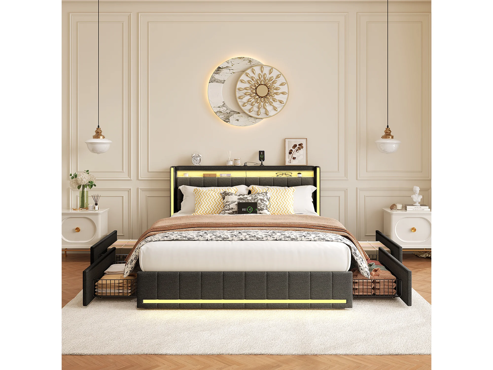 Cama de armazenamento 140x200 cm, cama de casal estofada com USB e tipo C, LED, com 4 gavetas, linho, cinza