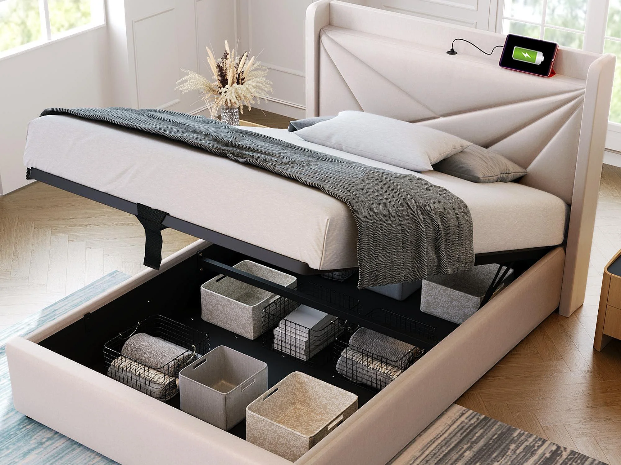 Cama de armazenamento 90 x 200 cm - USB e tipo C - tecido de linho - base de ripas - bege