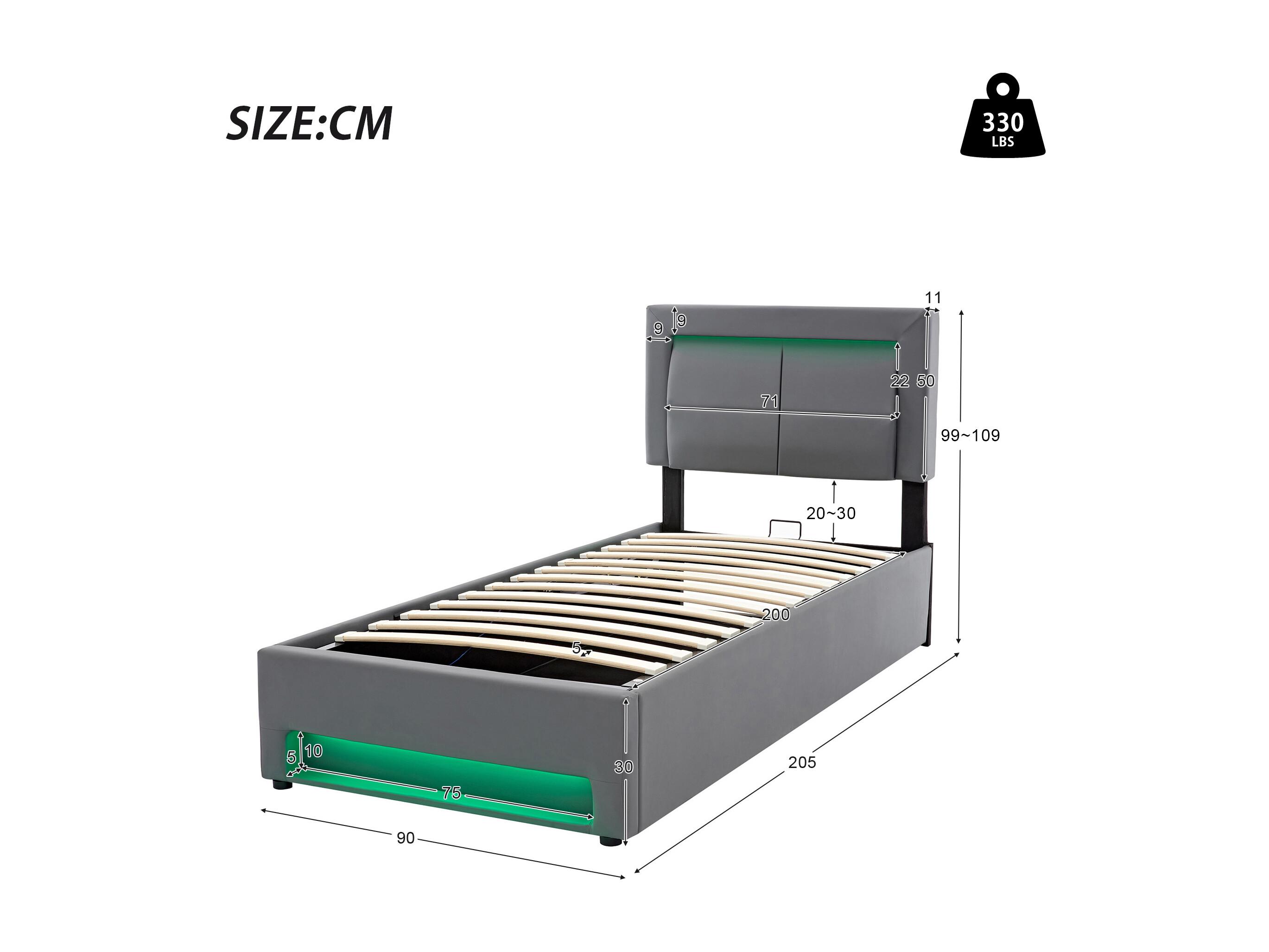 Cama de armazenamento 90x200 PU cinza com LED e portas USB integradas, base de ripas moderna