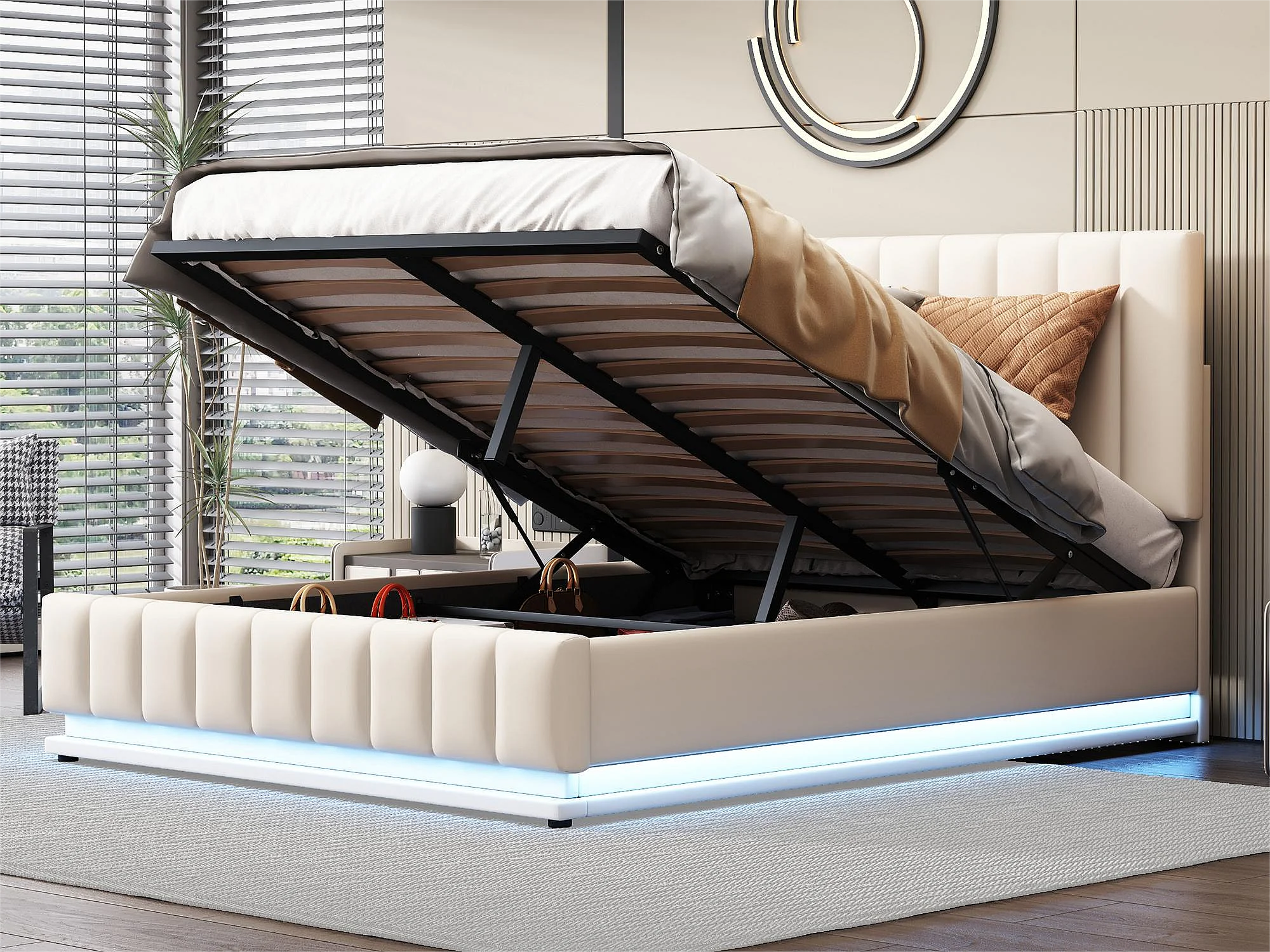 Cama de armazenamento com cabeceira ajustável - 140 x 200 cm - couro PU - LEDs - cor branca