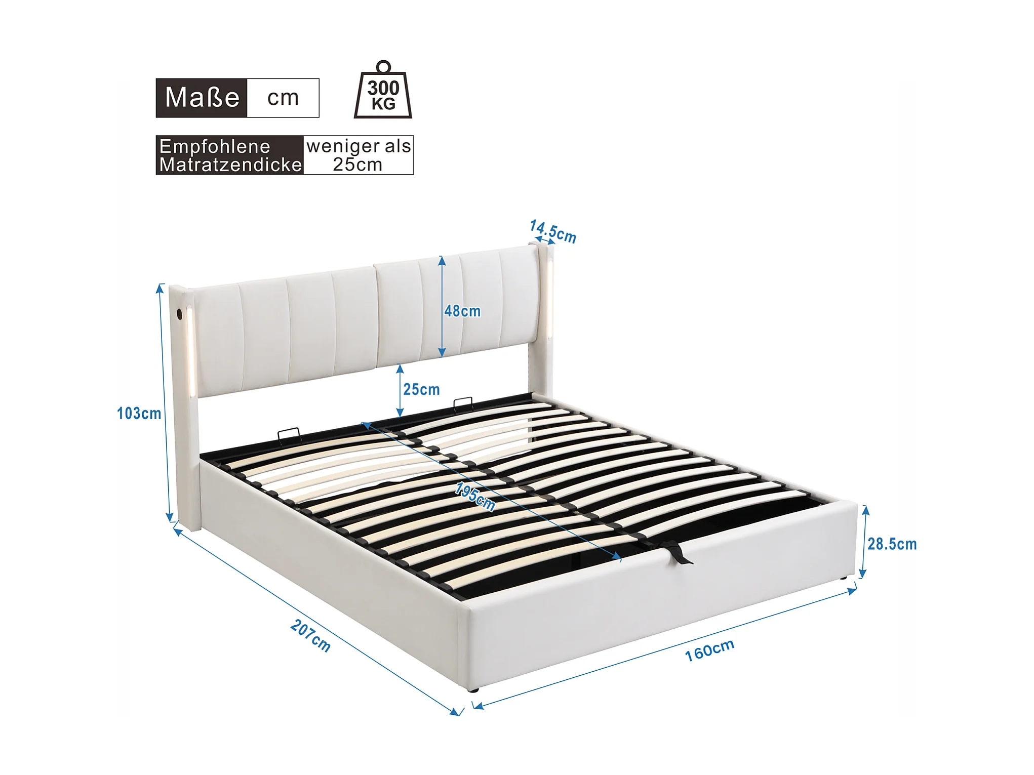 Cama de arrumação com cama binaural, estofada em PU, com estrado de ripas, e cabeceira ajustável LED e porta USB, Branco 160x200cm