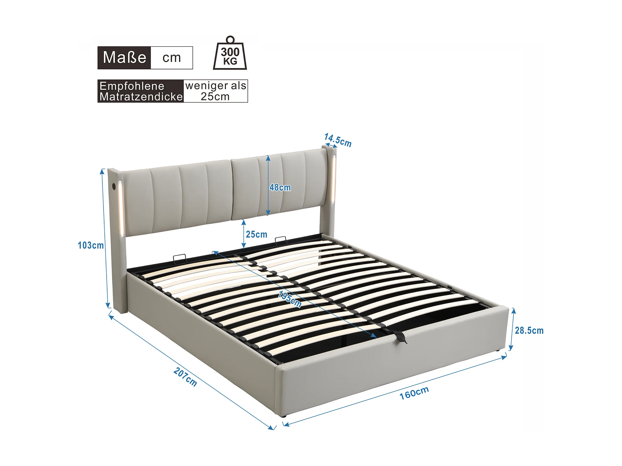 Cama de arrumação com cama binaural, estofada em PU, com estrado de ripas, e cabeceira ajustável LED e porta USB, Cinza 160x200cm