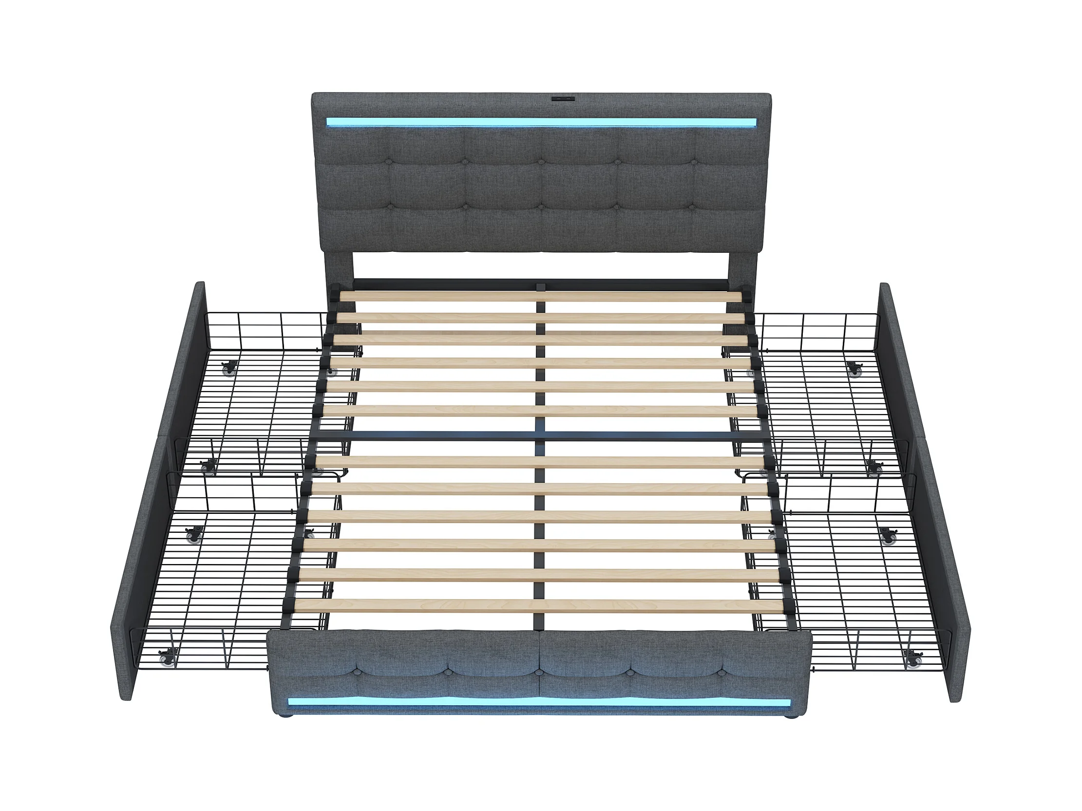 Cama de armazenamento de linho cinza de 140x200 cm com iluminação LED, 4 gavetas, 2 portas USB, cabeceira e peseira iluminadas