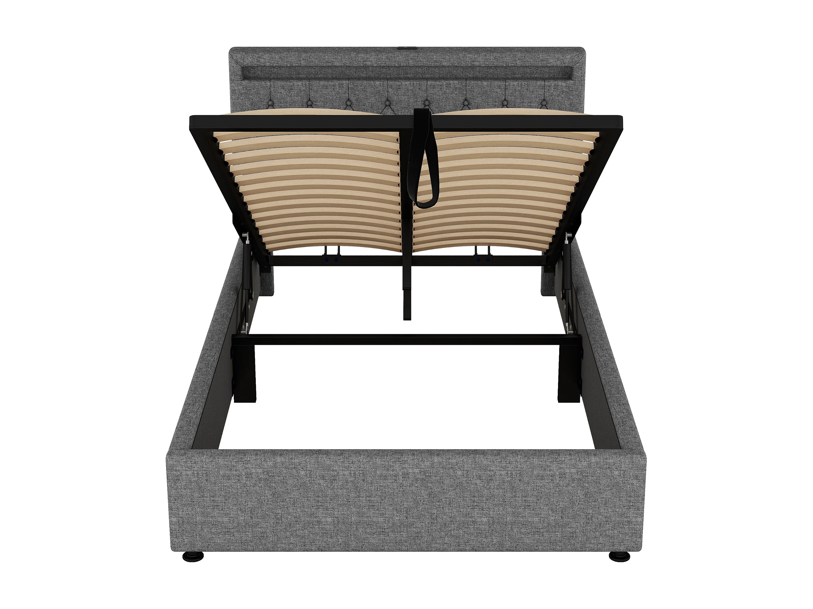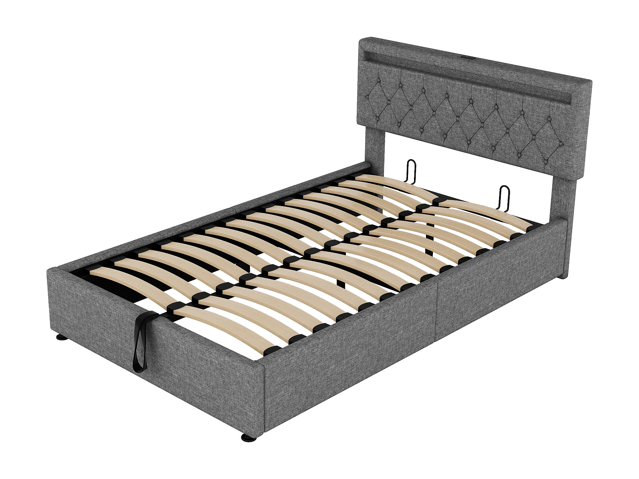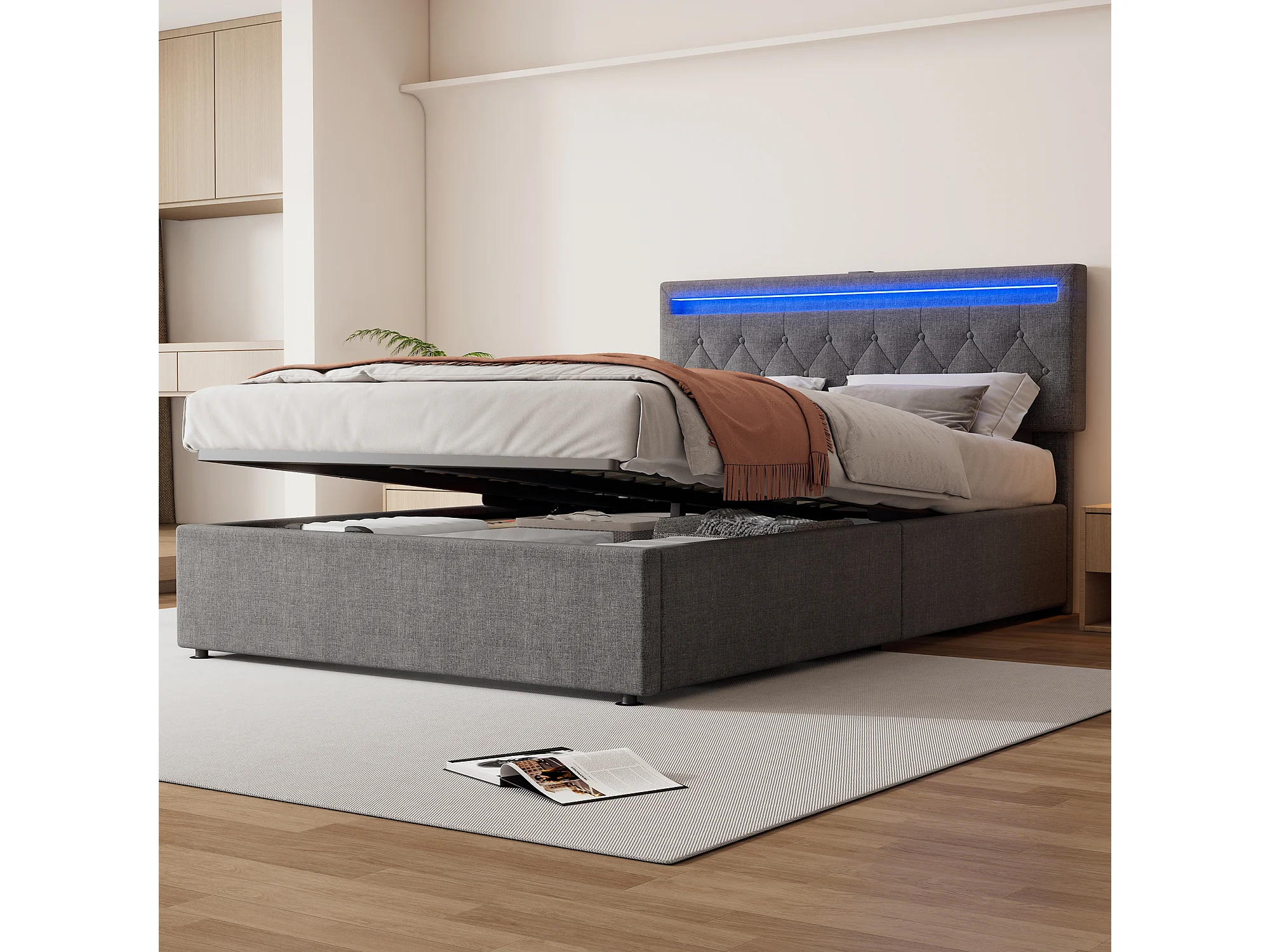Cama com arrumação de 140 x 200 cm com portas USB e Tipo-C - LEDs - Tecido de linho - Cor cinzenta
