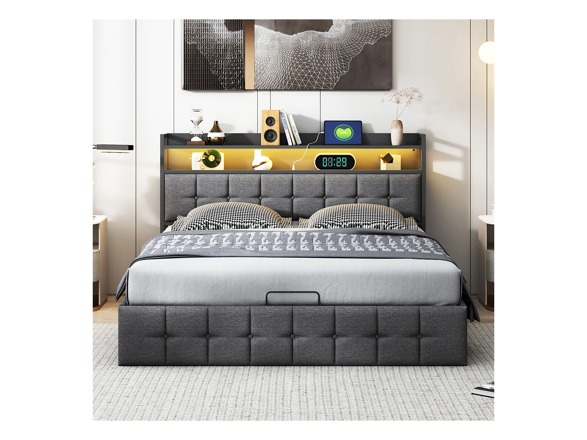 Cama de armazenamento em tecido cinza 140x190 cm com cabeceira LED, tomadas USB/Tipo C, faixas de luz e armazenamento integrado