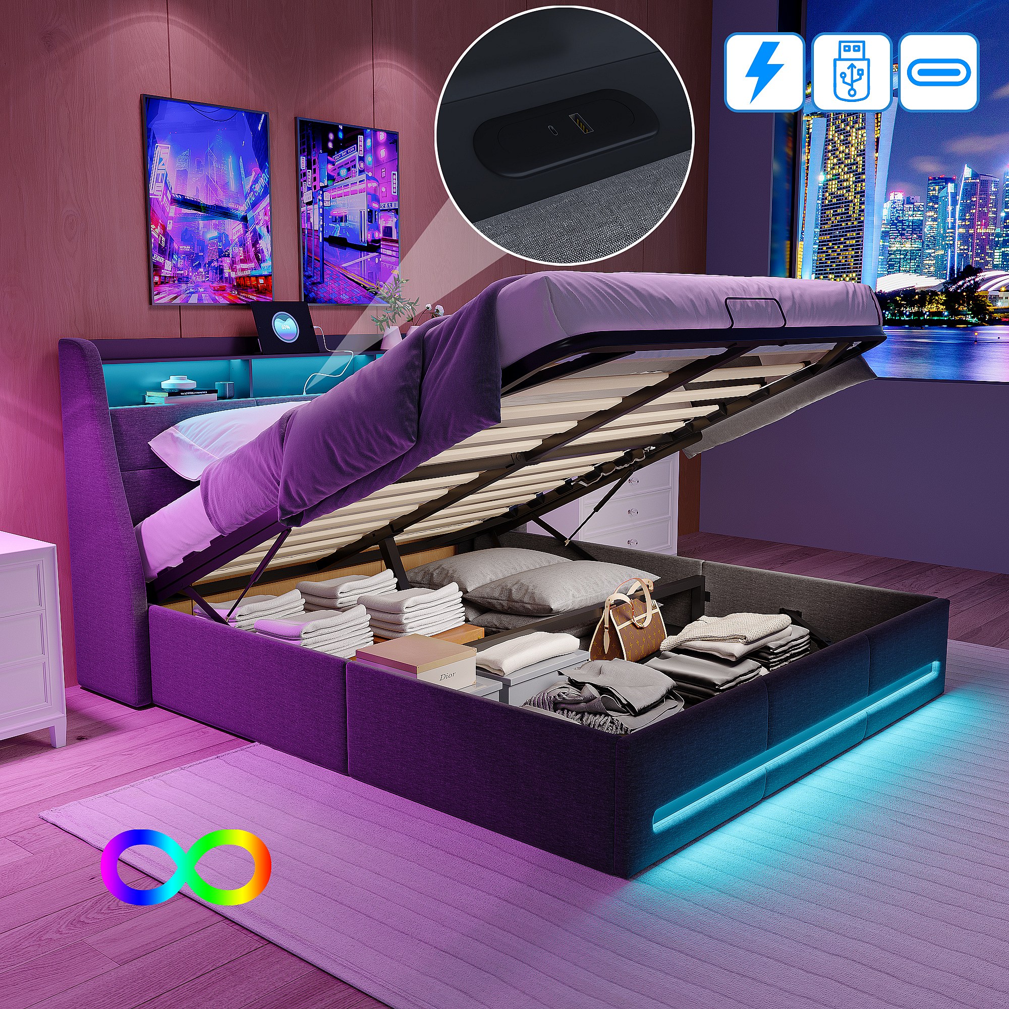 Cama de arrumação 160x200 cm em tecido cinzento, arrumação hidráulica, comando LED multicolorido e aplicação, cabeceira com tomada e espaço de arrumação