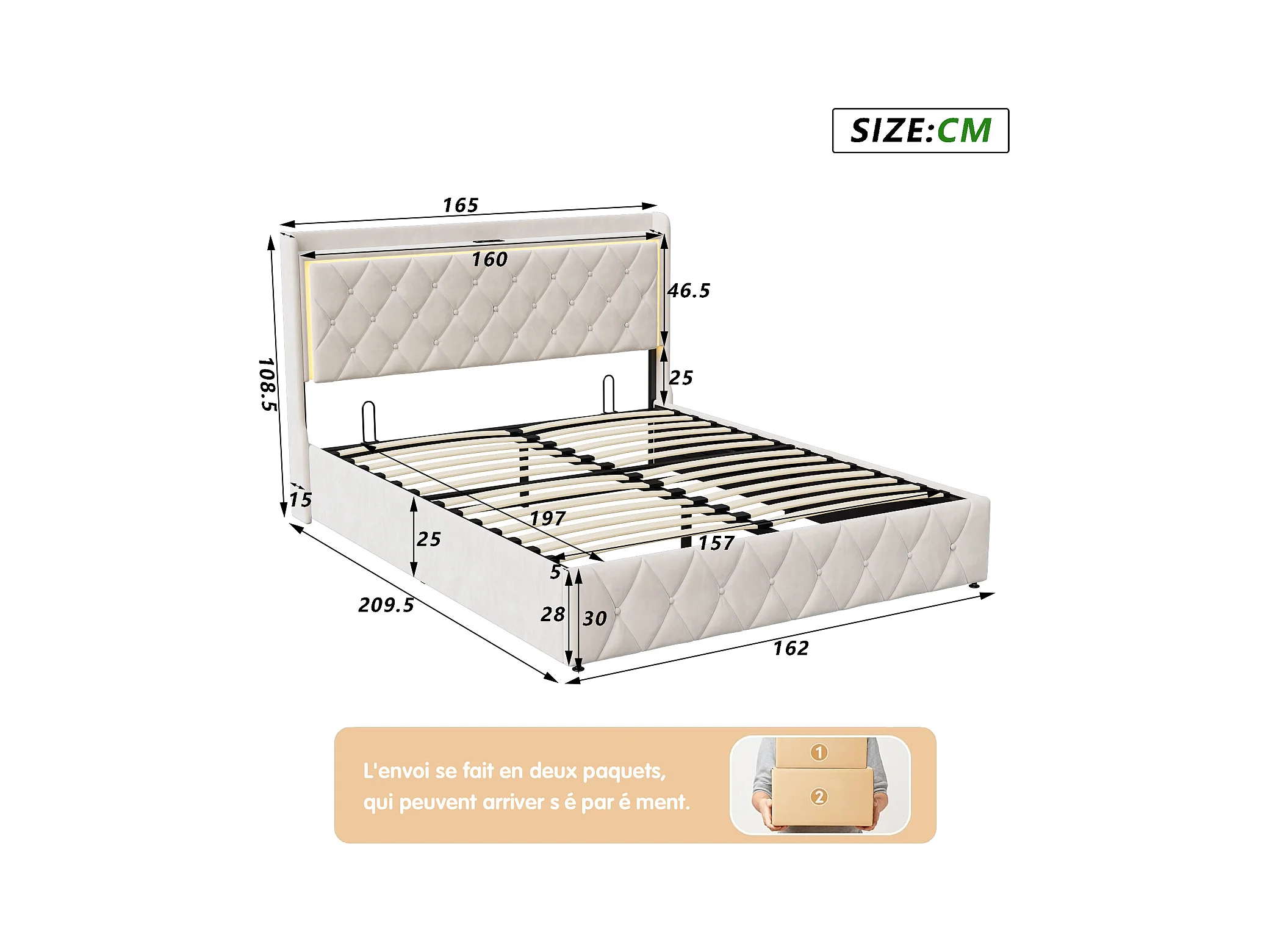 Cama de arrumação 160x200 cm em veludo bege com iluminação LED integrada e portas de carregamento – Design moderno e funcional
