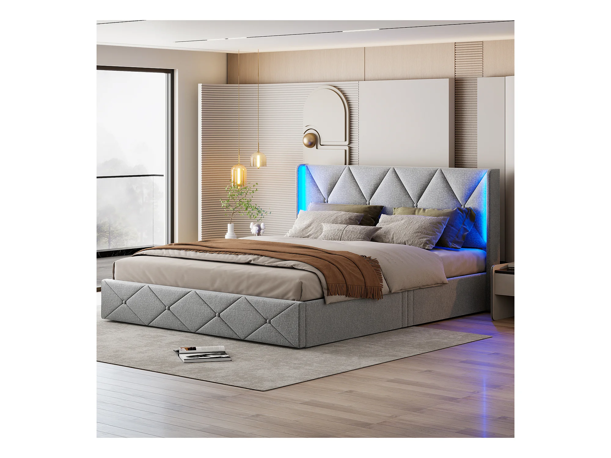 Cama de arrumação 160x200 cm em veludo cinza fosco com luz lateral na cabeceira, arrumação hidráulica, fácil de montar