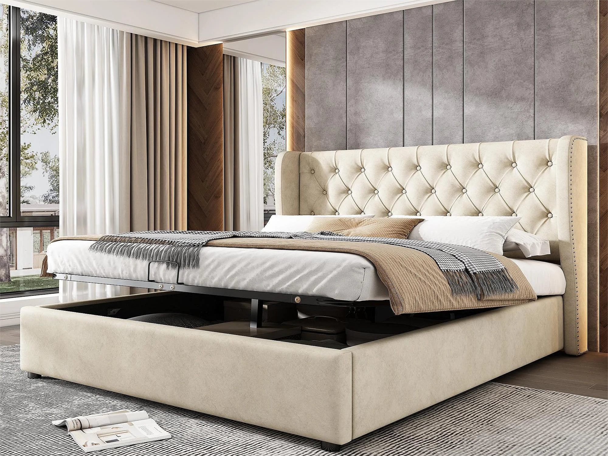 Cama de arrumação 180 x 200 cm, cama de adulto estofada em veludo, decoração com rebites e botões, base de ripas, bege