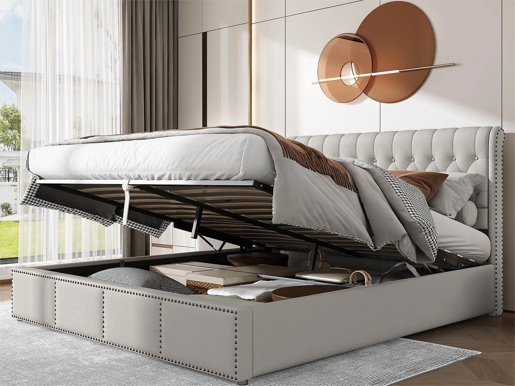 Cama de arrumação 180 x 200 cm com cabeceira - tecido - base de ripas - cor branco cinza