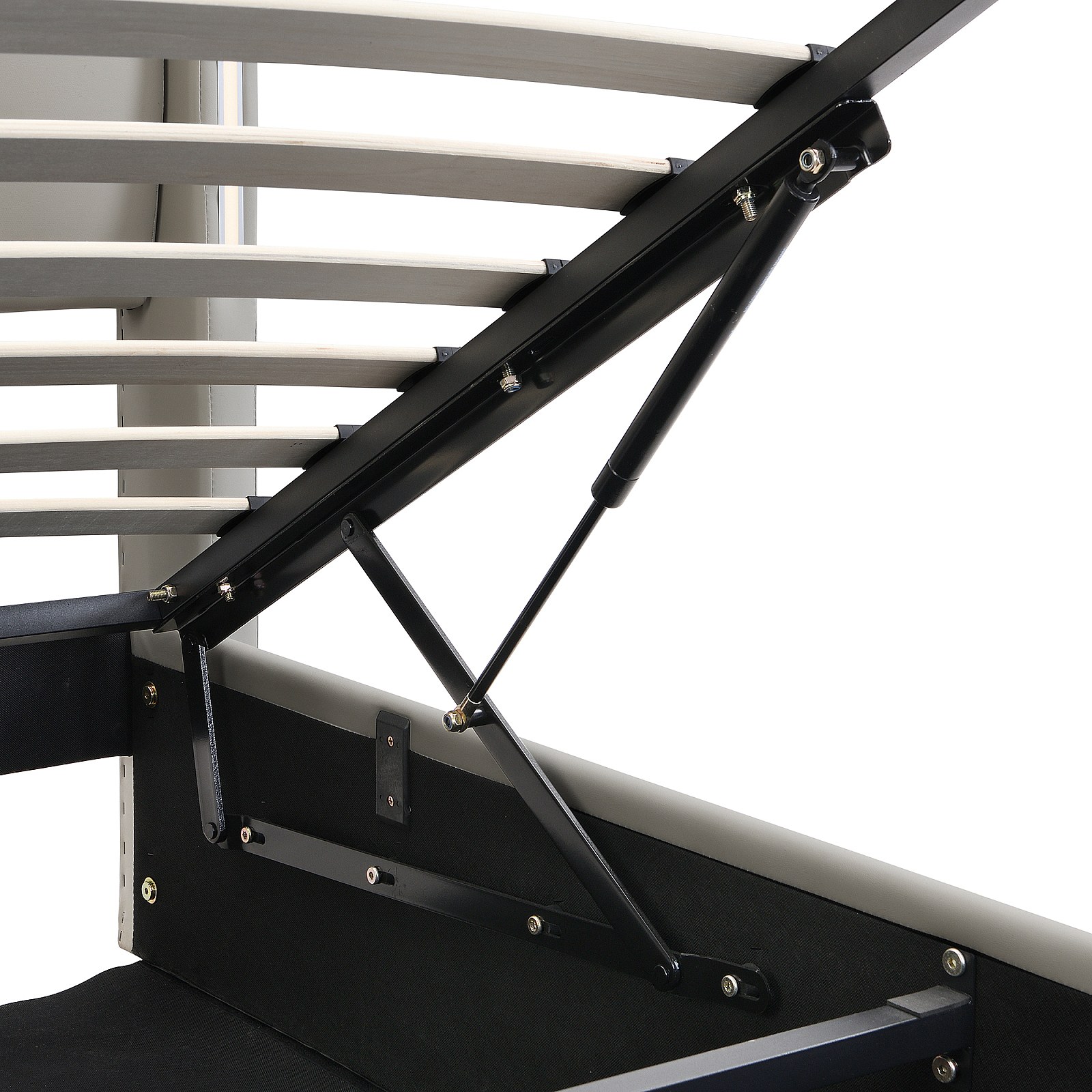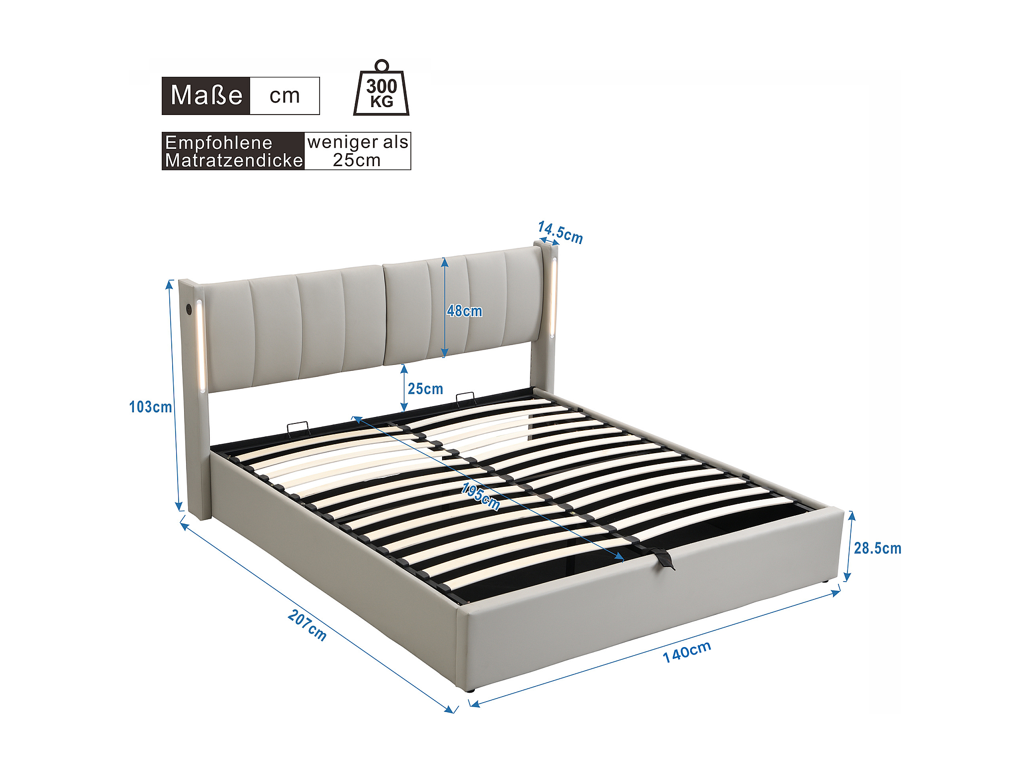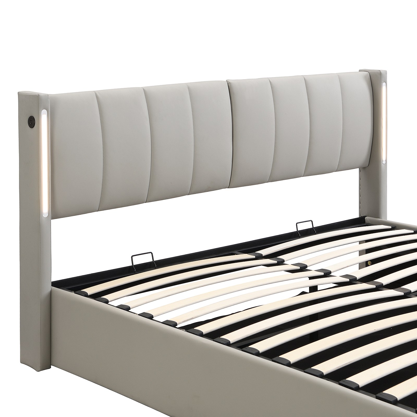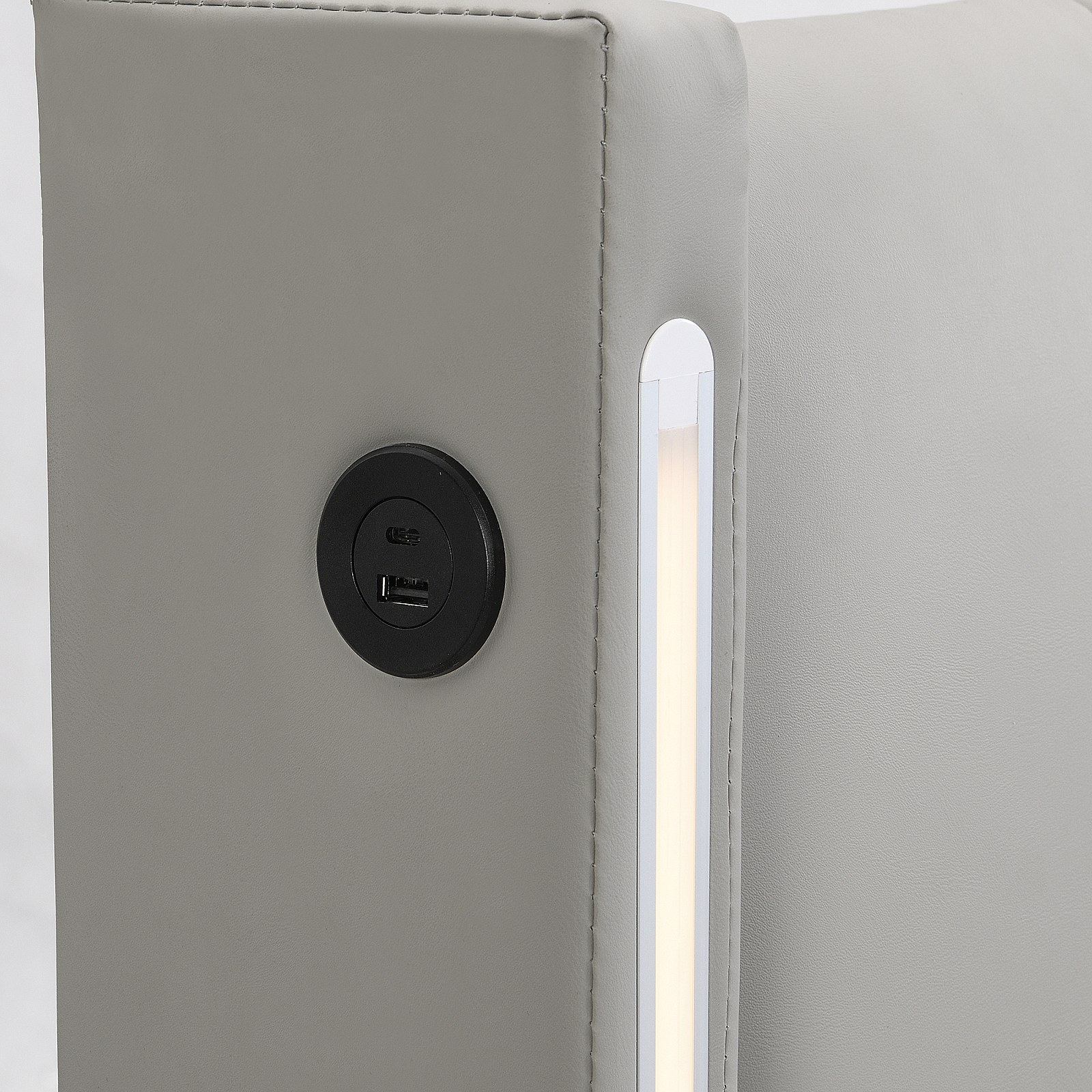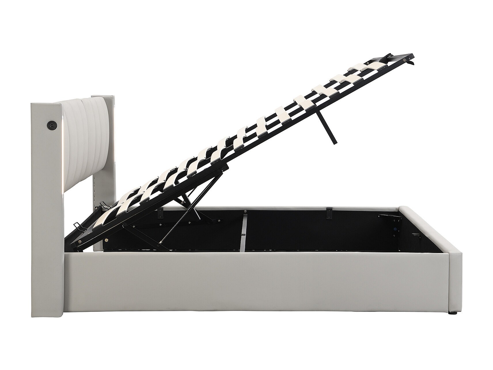 Cama de arrumação com cama binaural, estofada em PU, com estrado de ripas e cabeceira ajustável LED e porta USB, Cinzento 140x200cm
