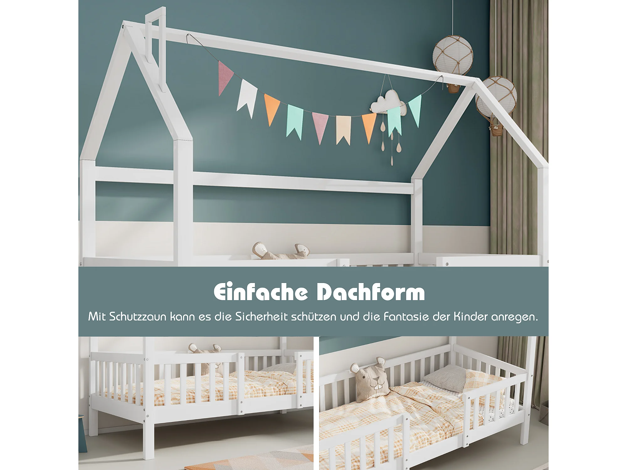 Cama de cabine infantil 90x200 madeira de pinho branco com teto de chaminé e área de recreação