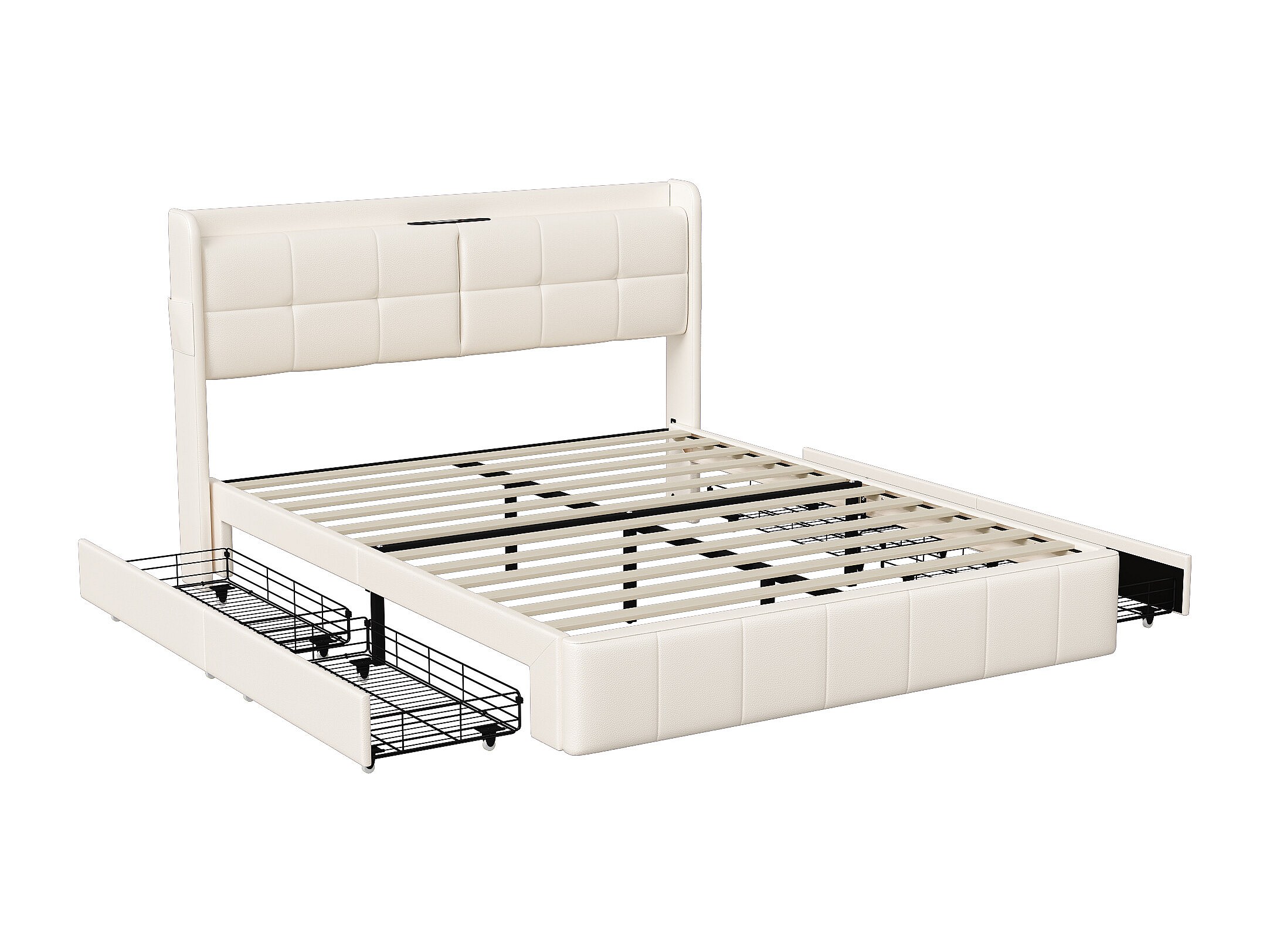Cama de casal 140 x 200 com 4 gavetas, Cama estofada 140 x 200 com carregamento USB, PU, Bege