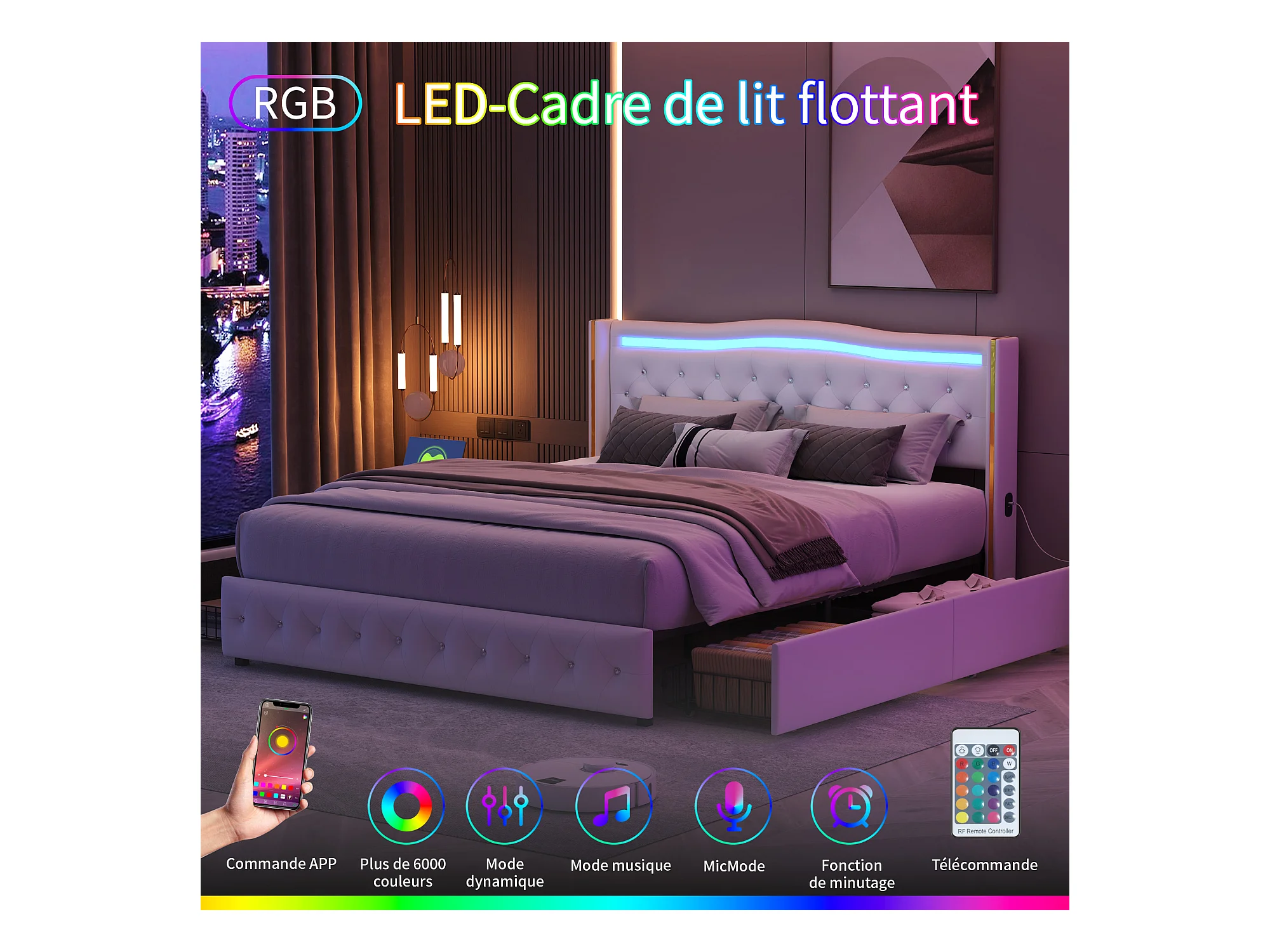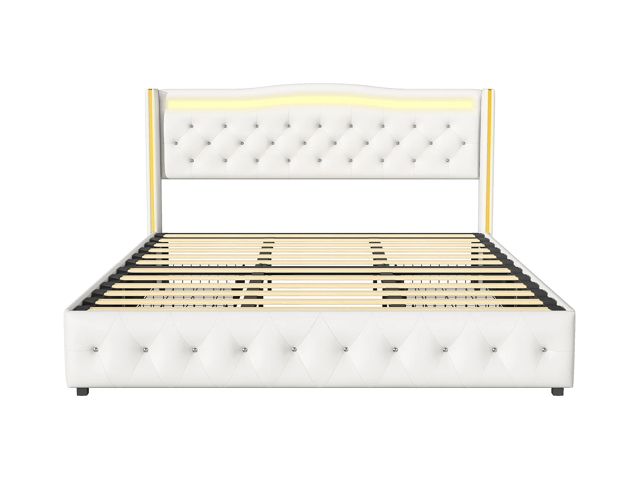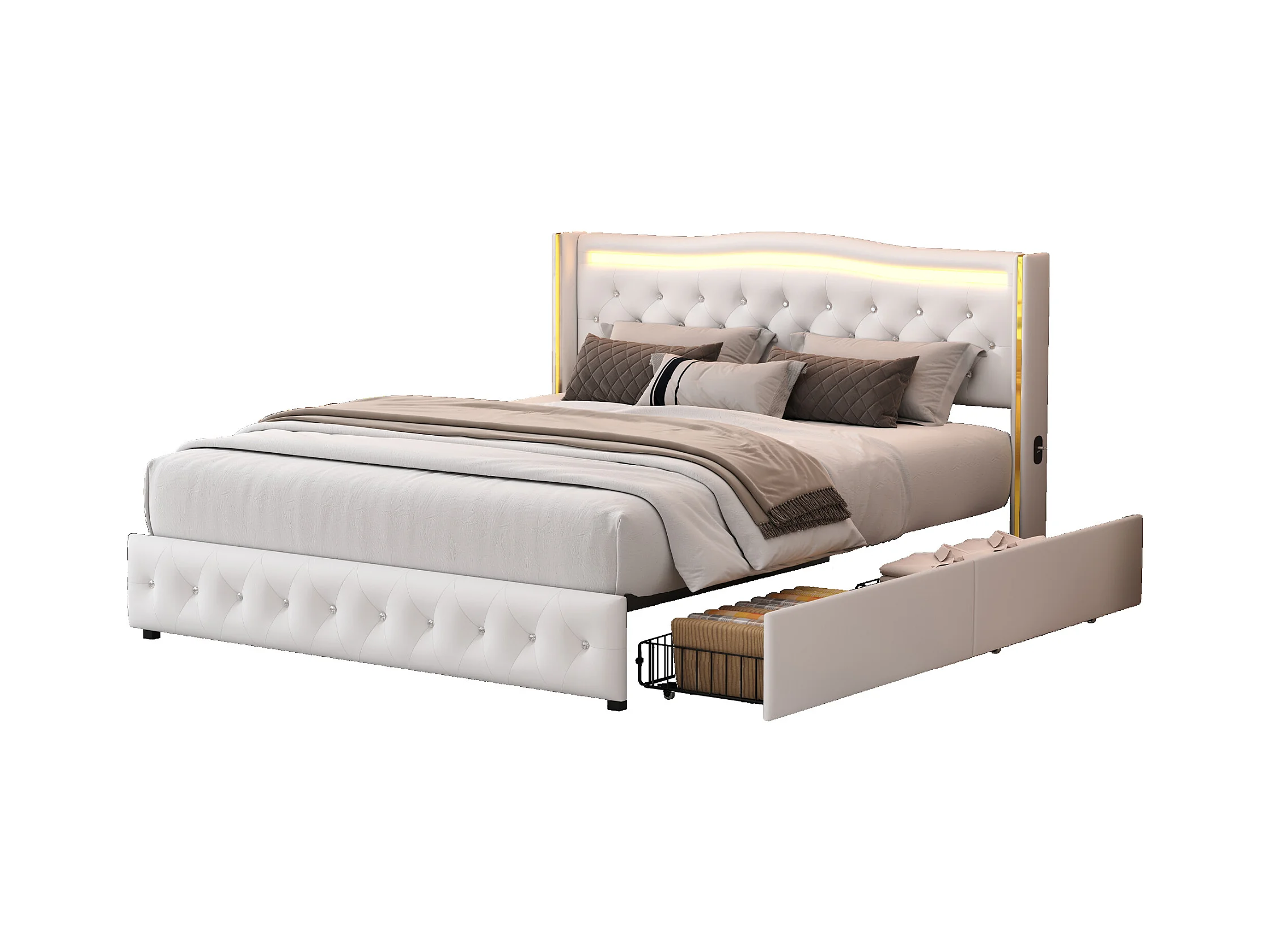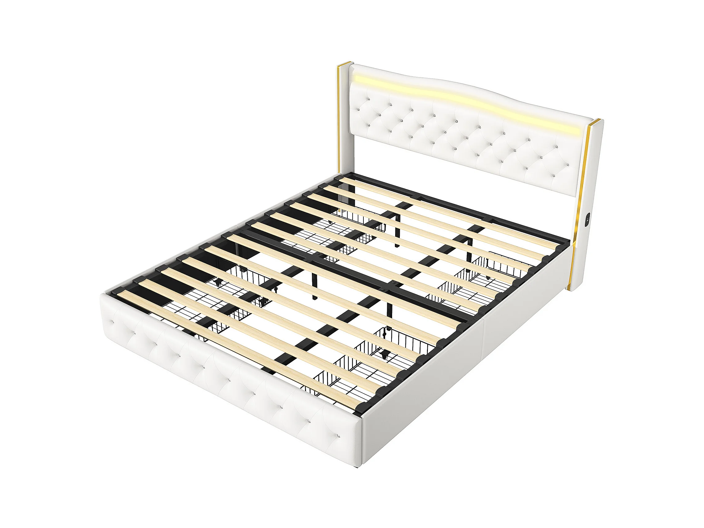Cama de casal 140x200 com base, 4 gavetas de armazenamento, carregamento USB, ripas de madeira, LED - Branco
