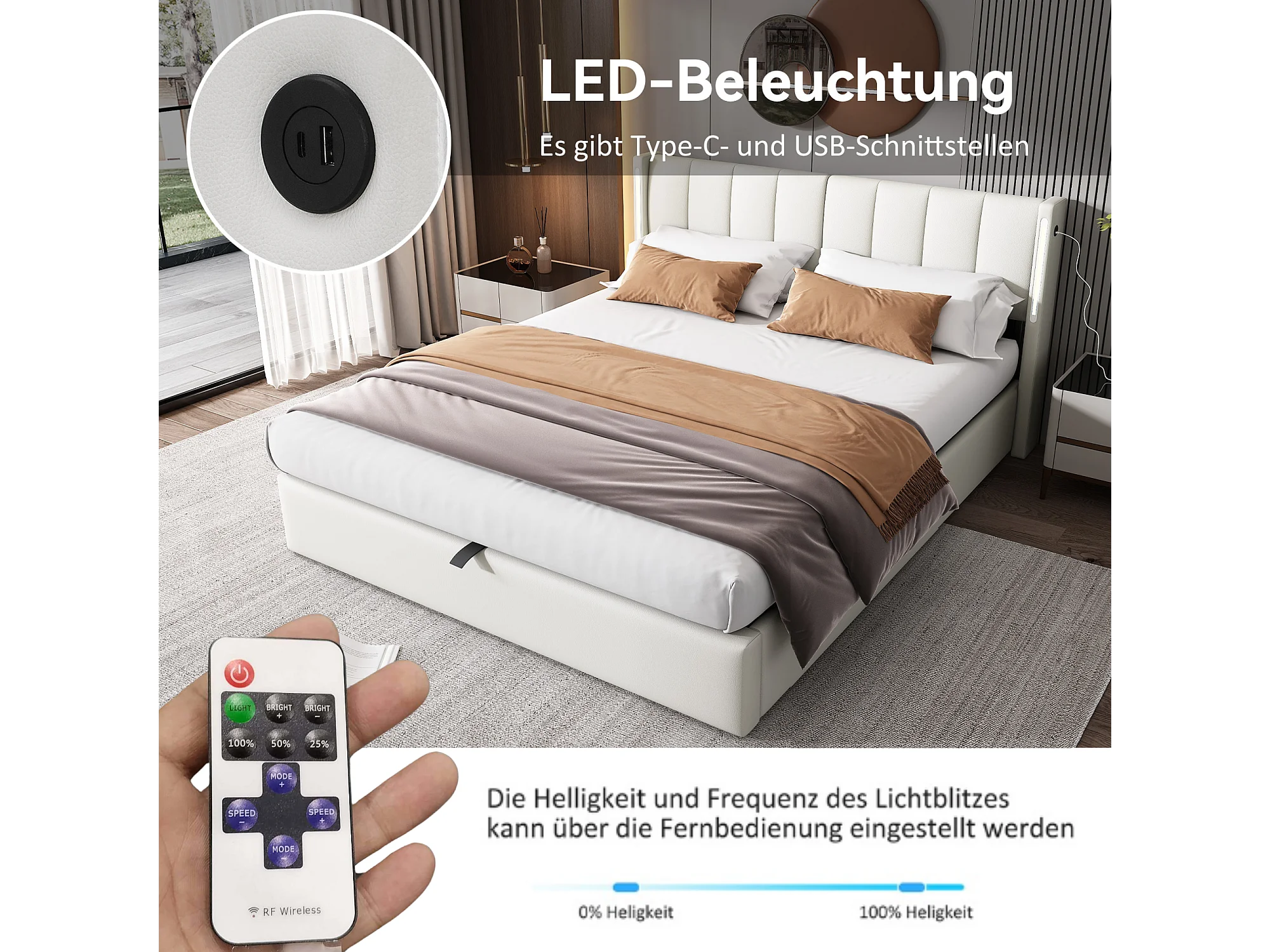 Cama de casal 140x200 PU branca com LED, armazenamento hidráulico, cabeceira ajustável e USB
