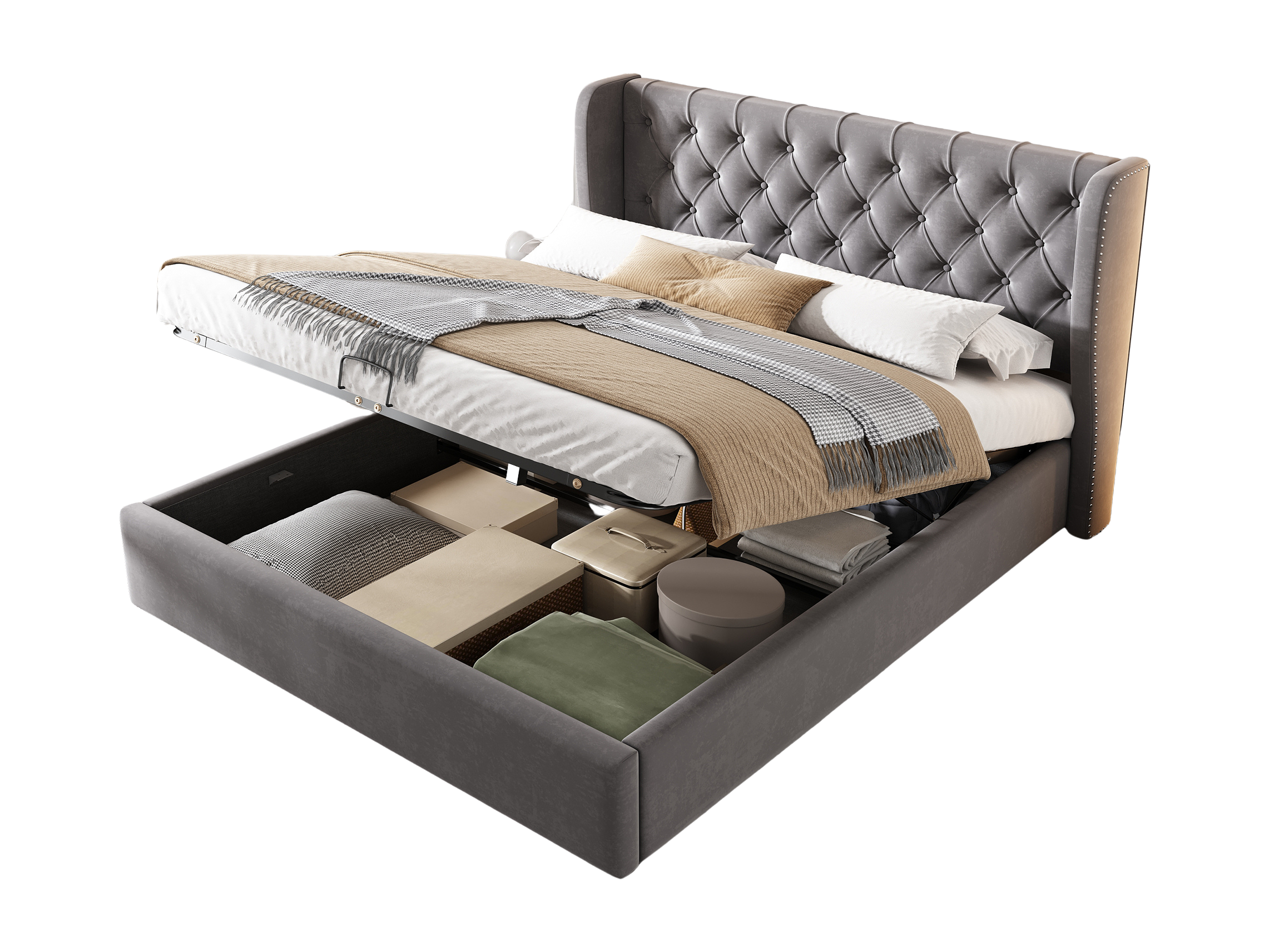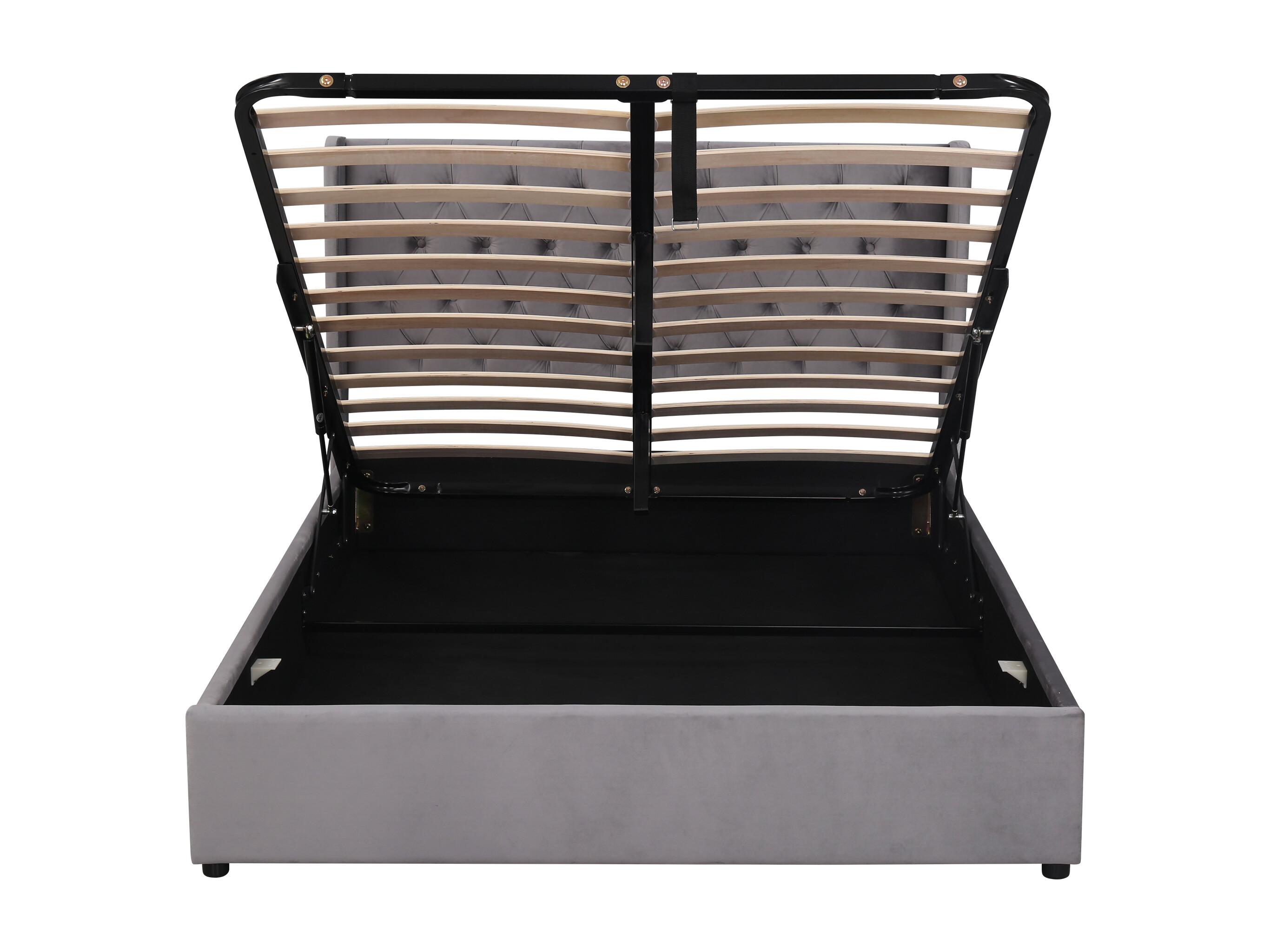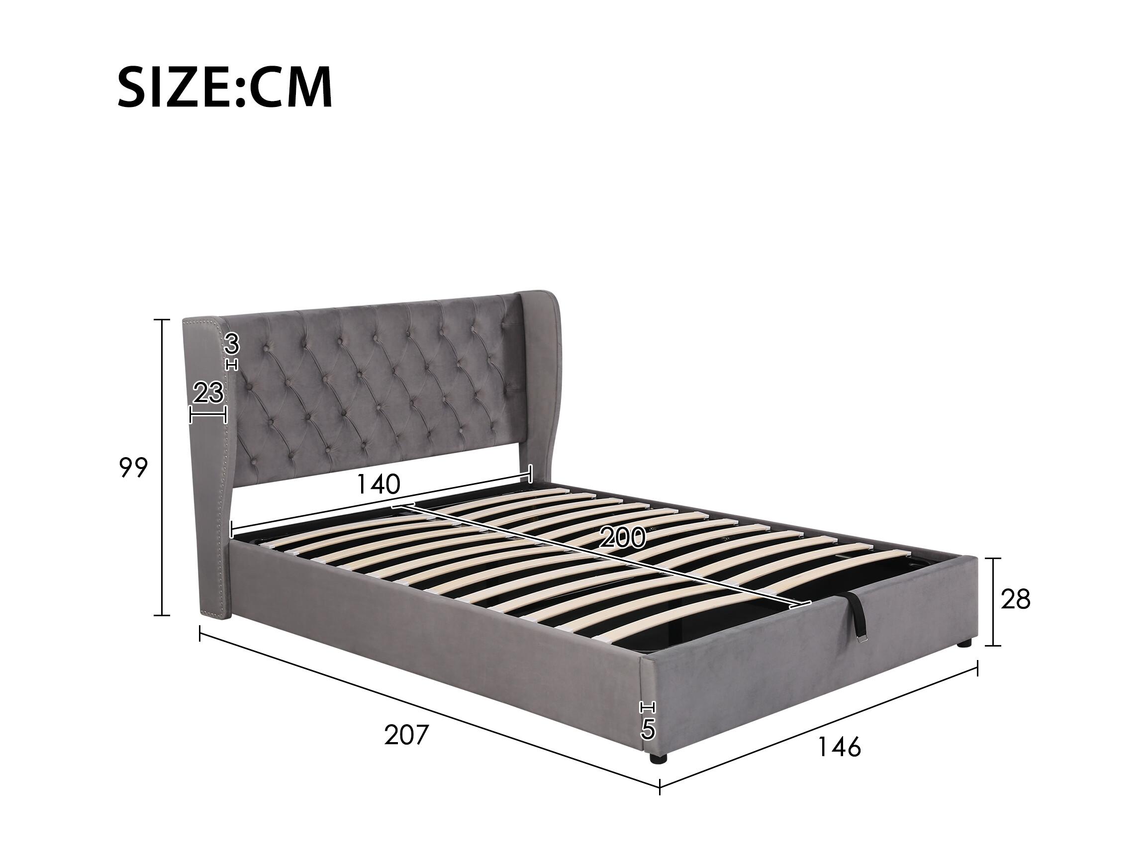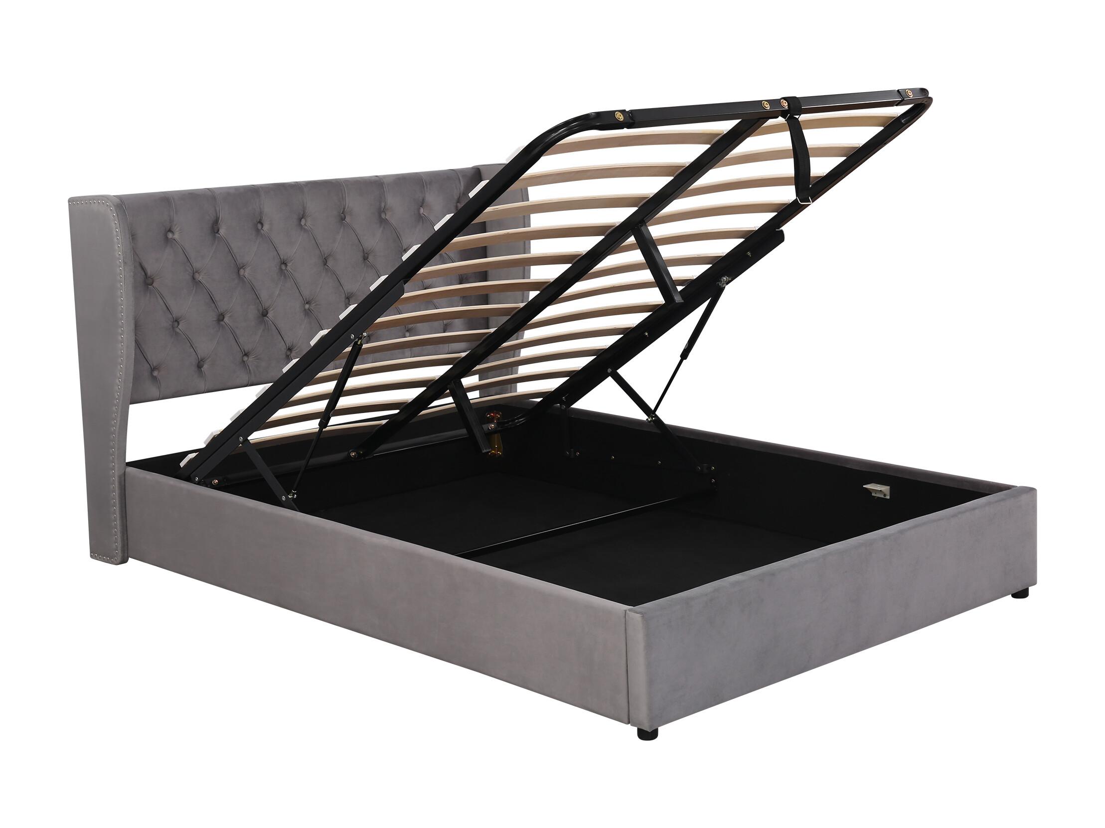 Cama de casal 140x200 veludo cinza com armazenamento hidráulico e cabeceira acolchoada