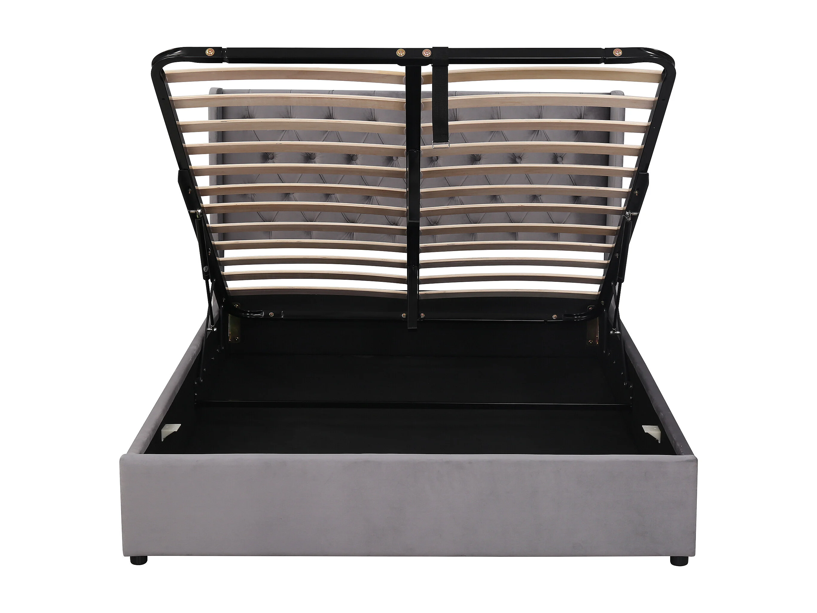 Cama de casal com arrumação 140x200 cm em veludo cinzento com cabeceira estofada e arrumação hidráulica