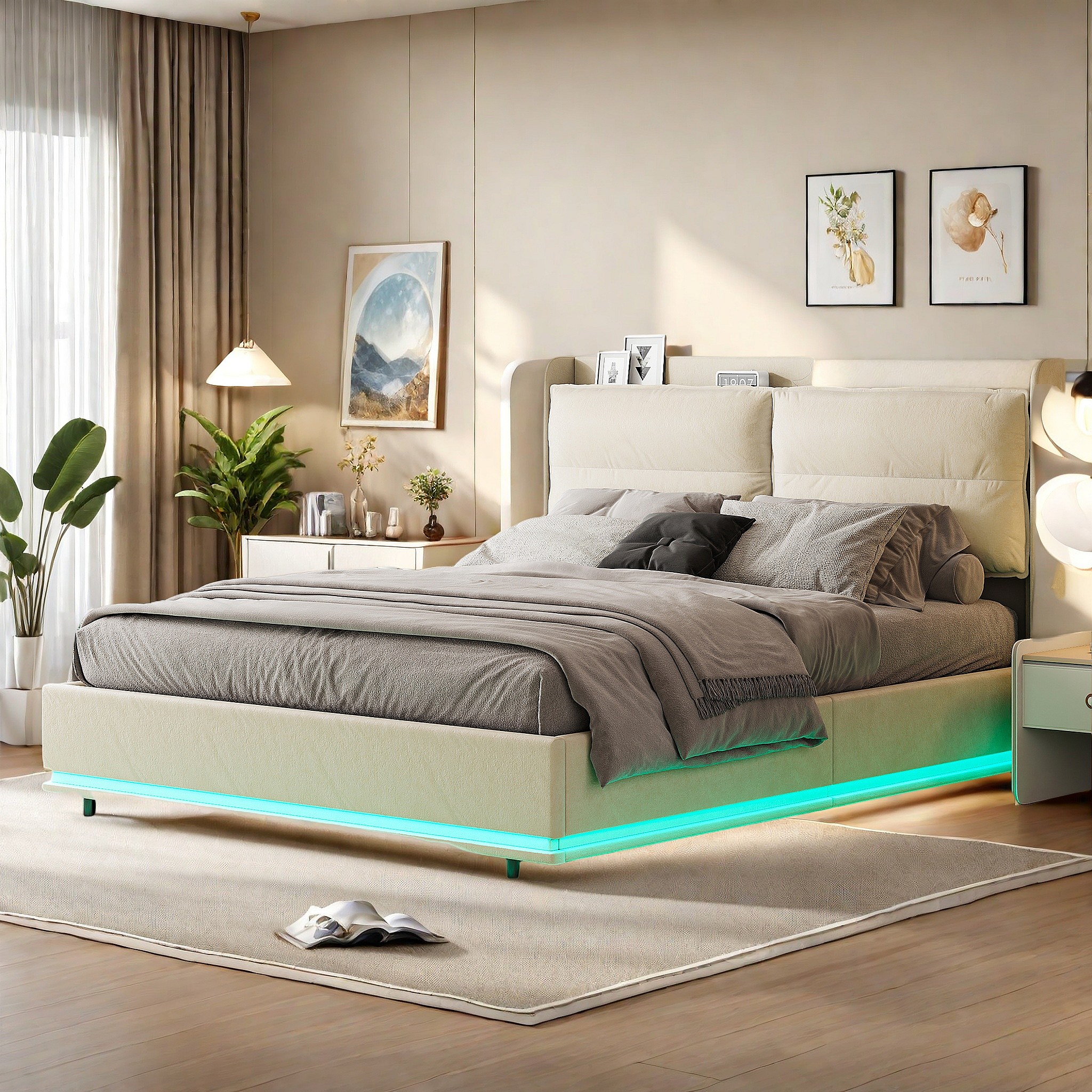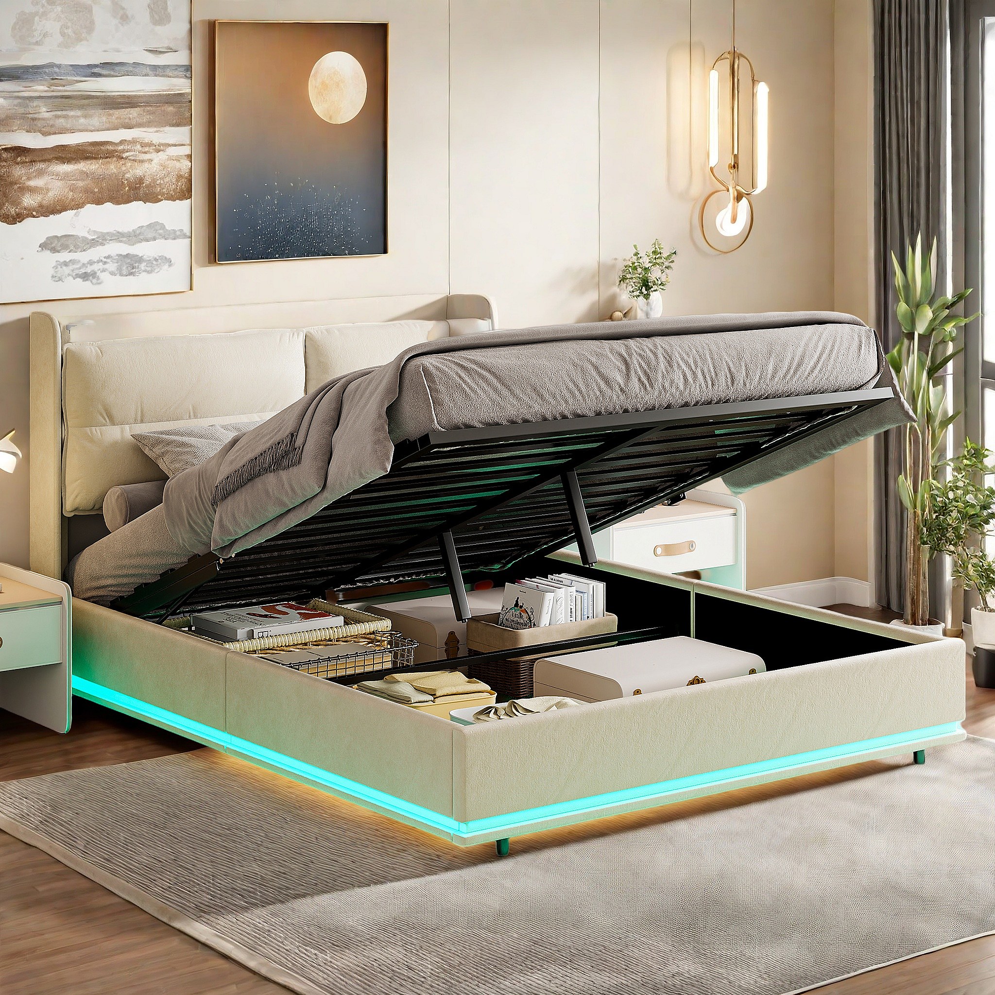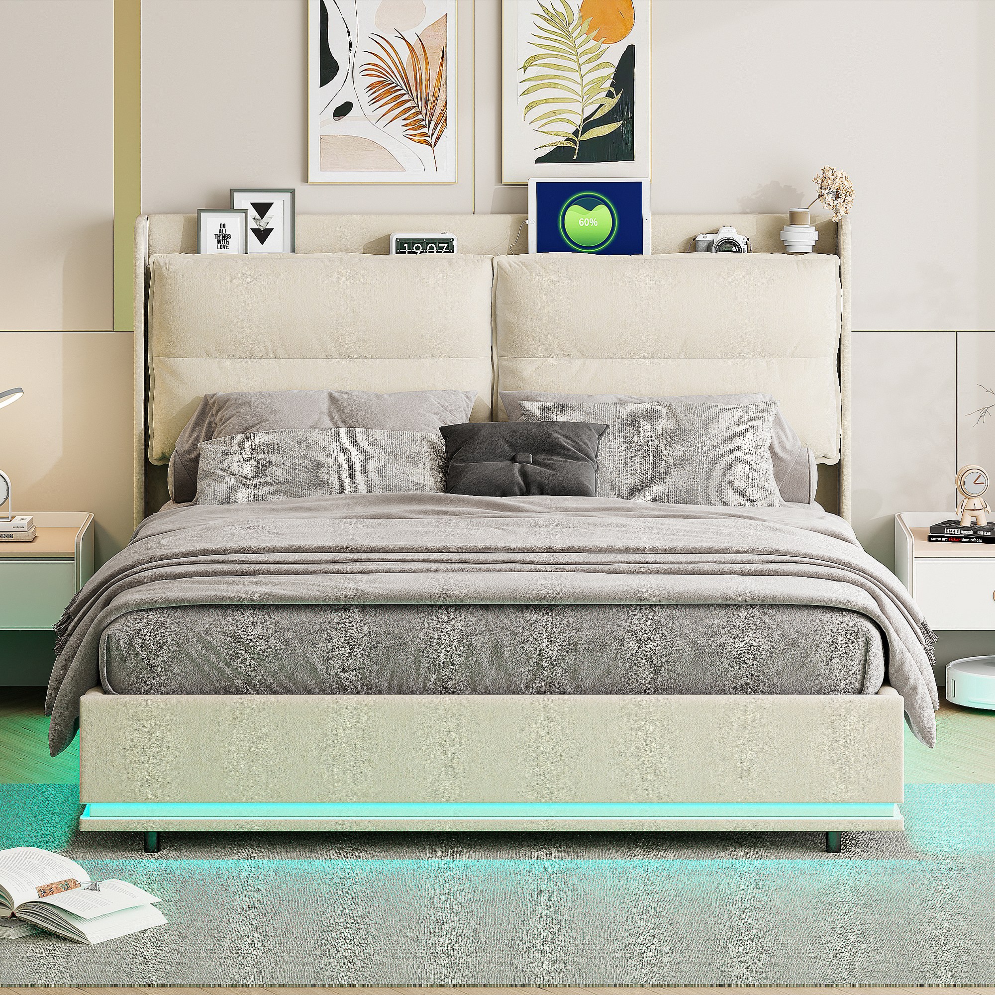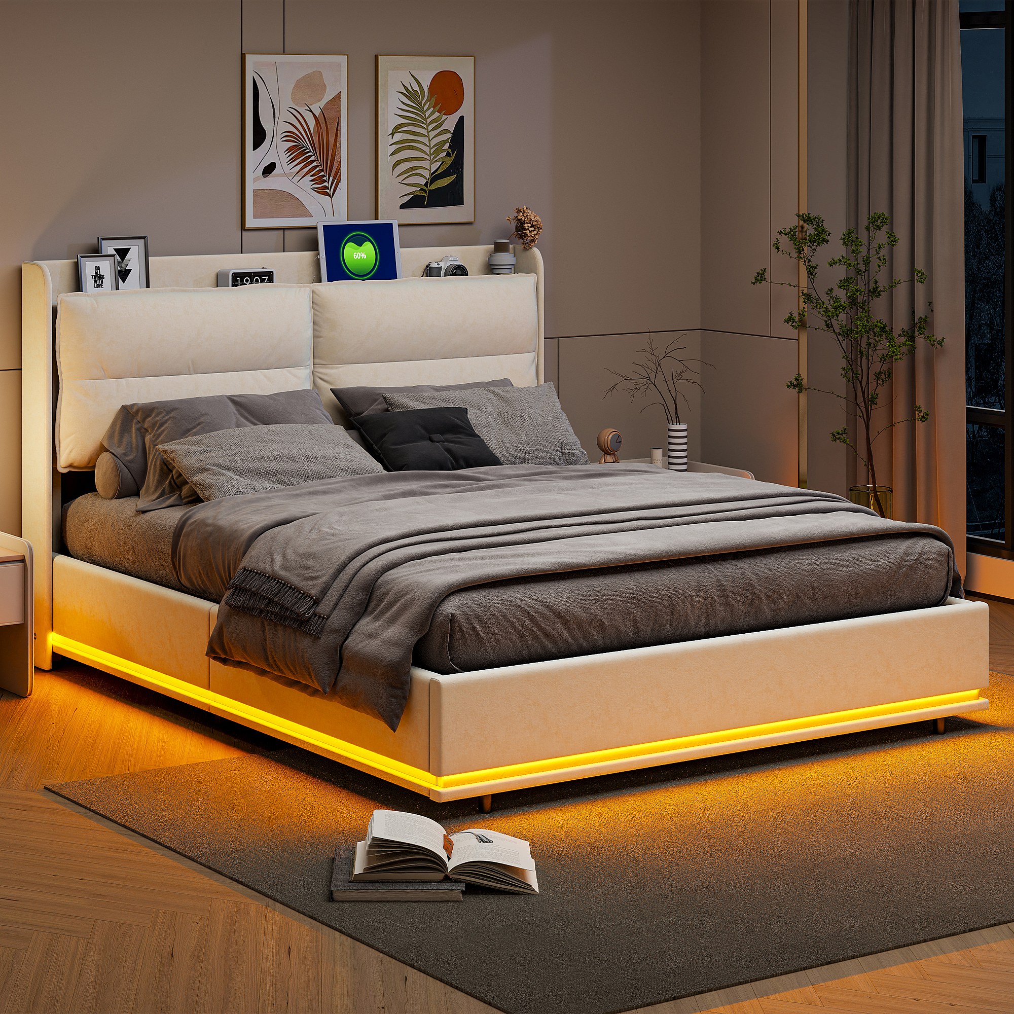 Cama de casal 140x200cm em veludo com LEDs integrados, ripas de madeira, armazenamento hidráulico e estação de carregamento USB, Off-white