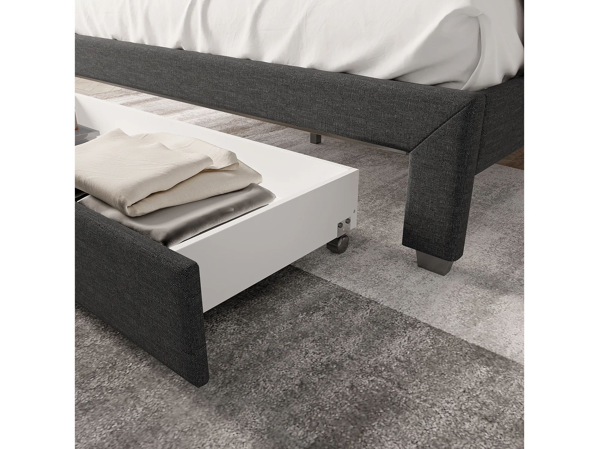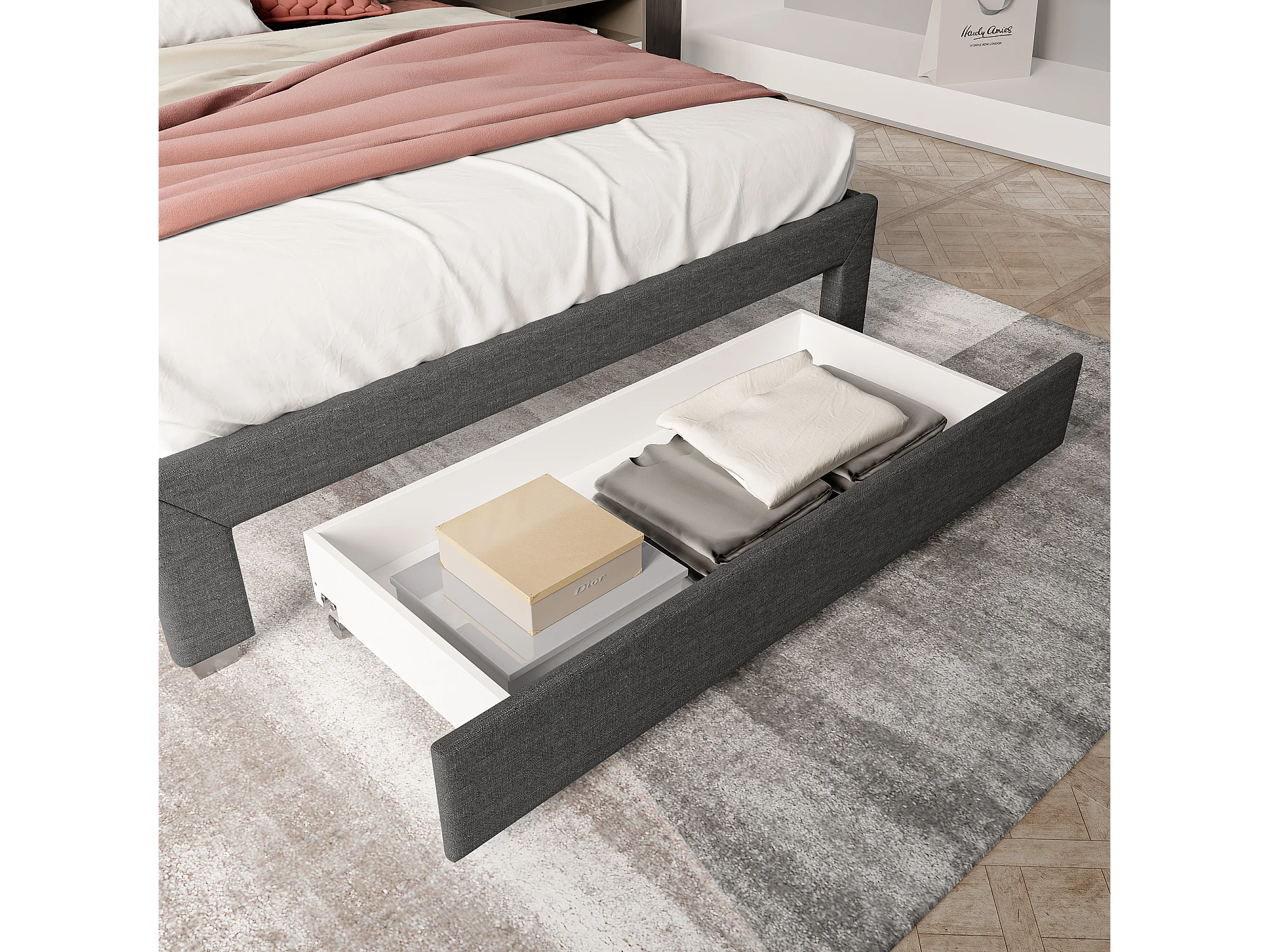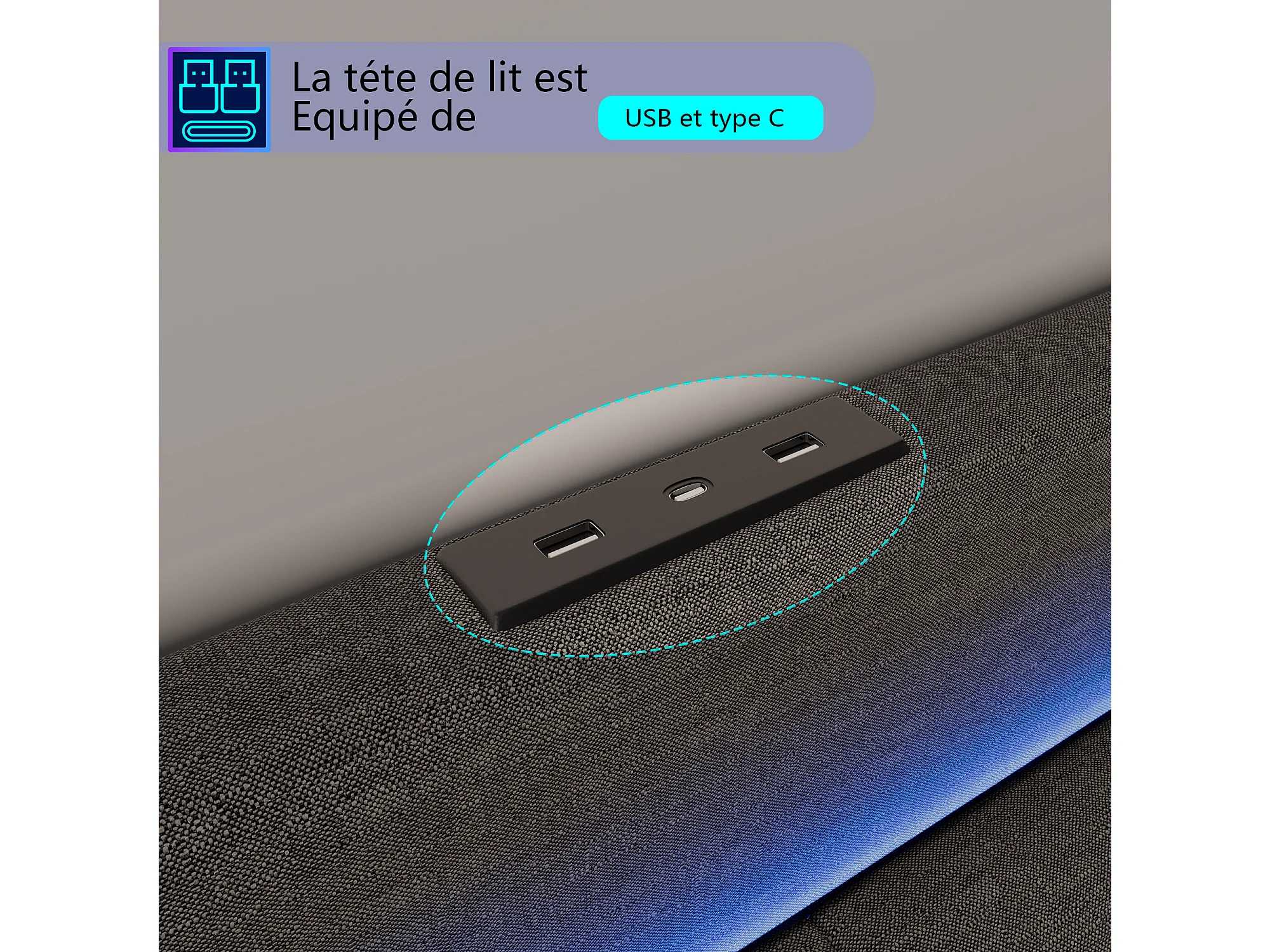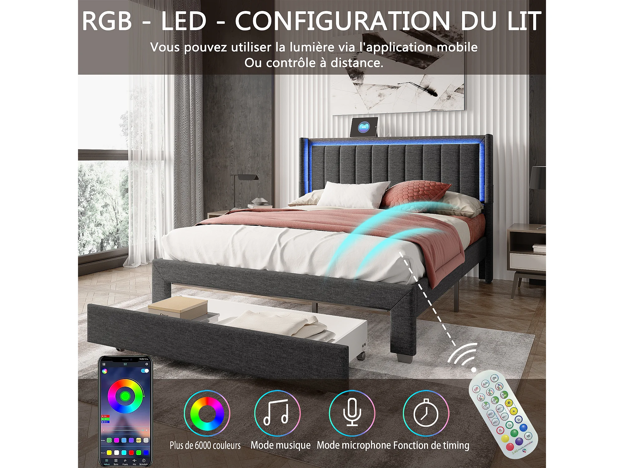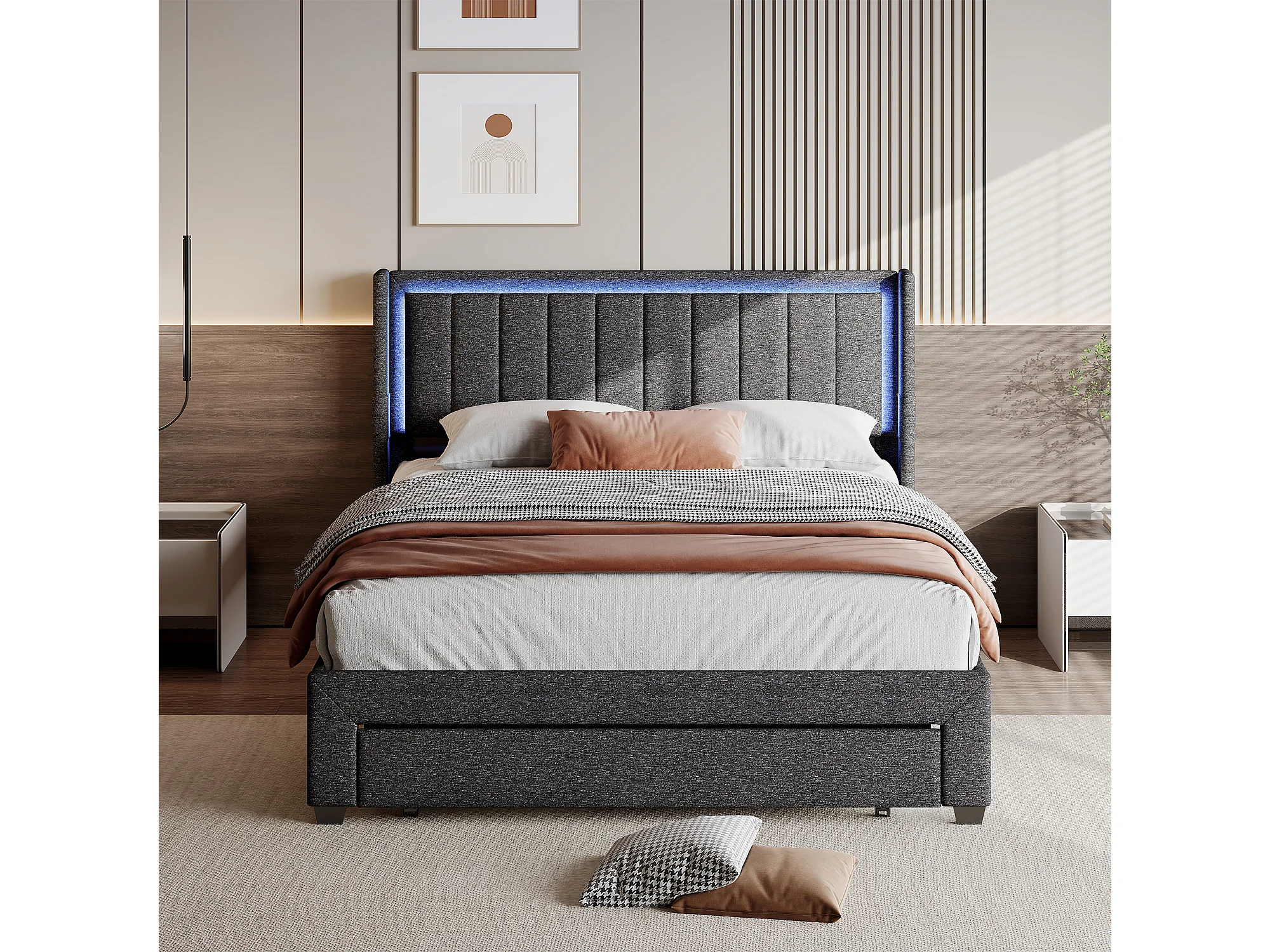 Cama de casal 160 x 200 cm, com LED e USB, gaveta de cama com gavetas, estrado de ripas, cinza escuro