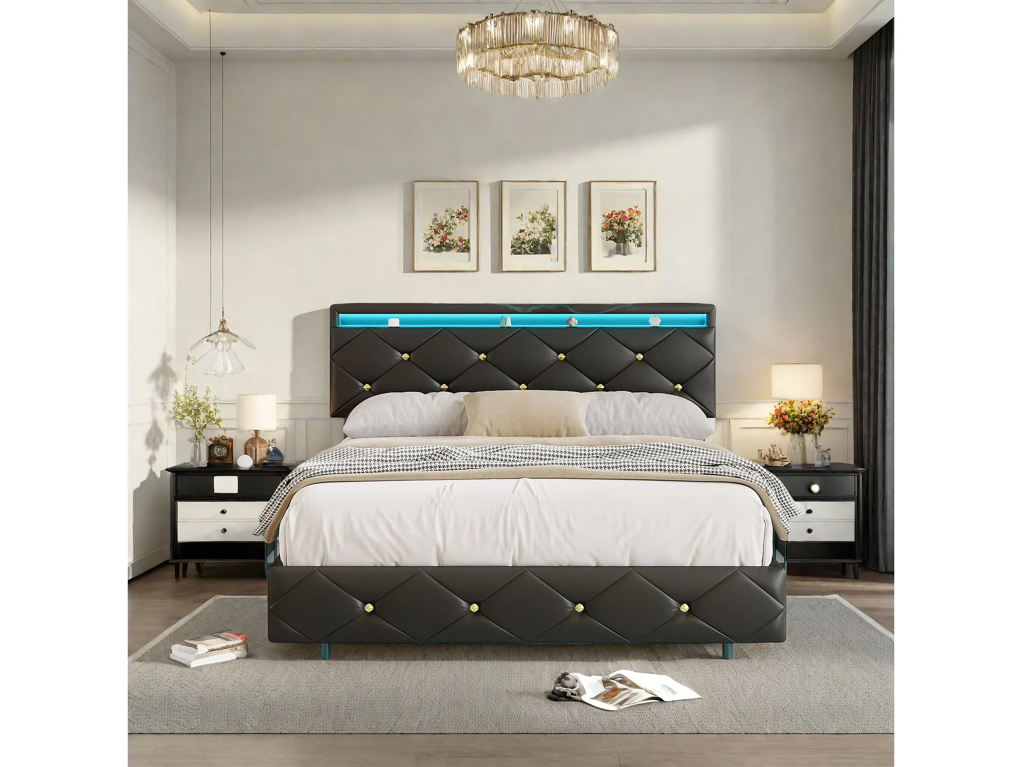 Cama de casal 160 x 200 com base de metal, cama de casal com armazenamento e LED, PU, preta