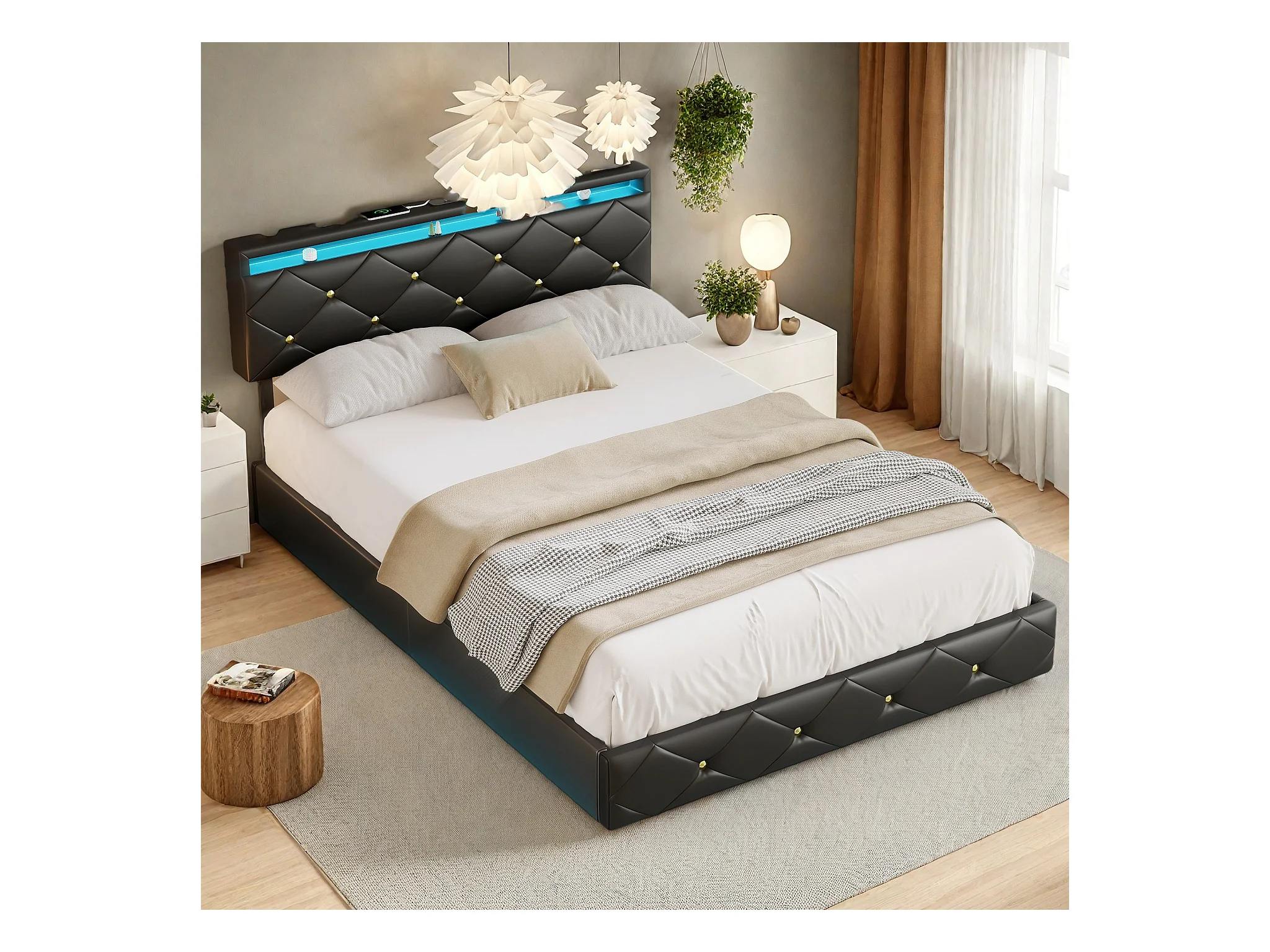 Cama de casal 160x200 com filtro de linha e iluminação LED, estrutura de cama flutuante com cabeceira ajustável e base de ripas, PU (preto, 160x200)