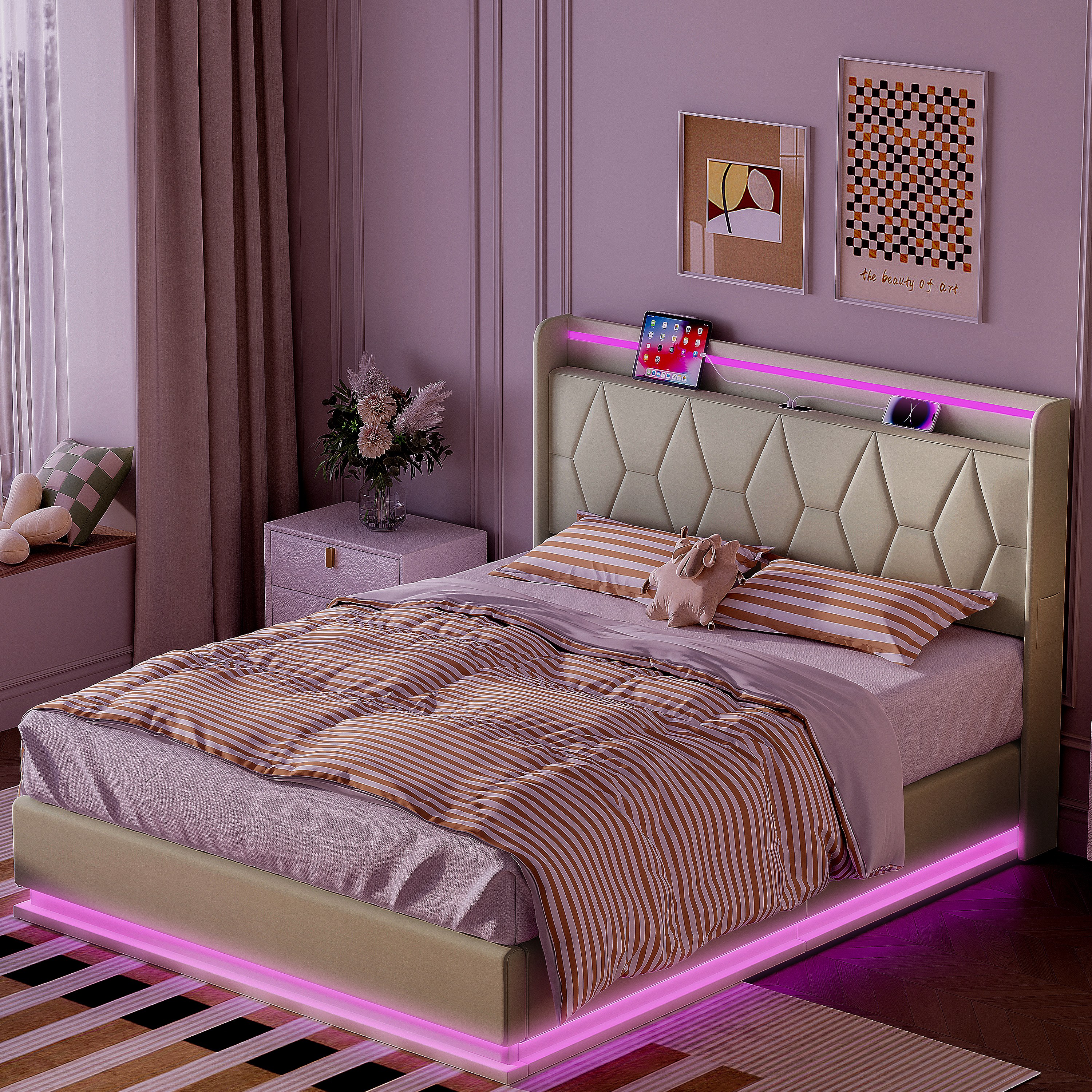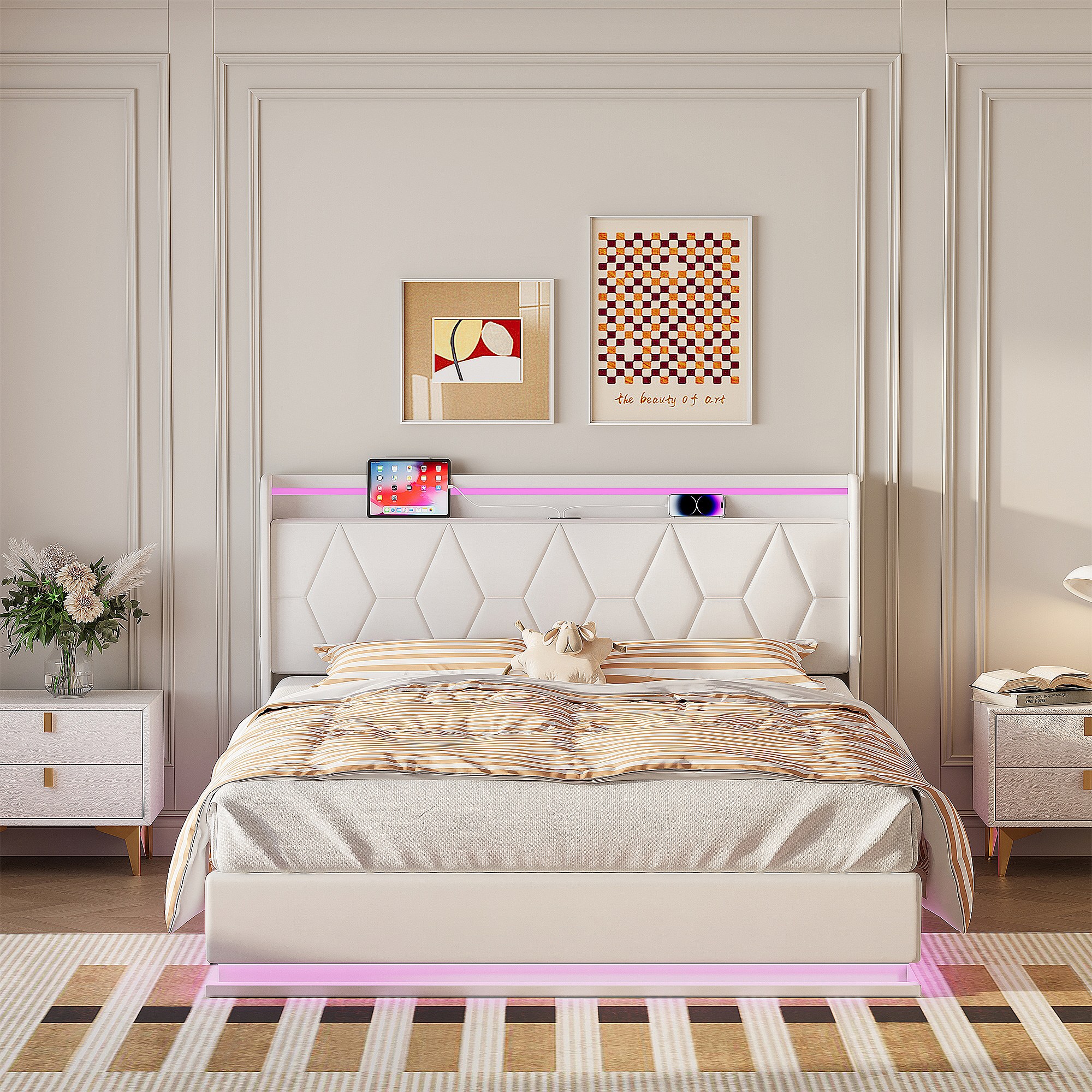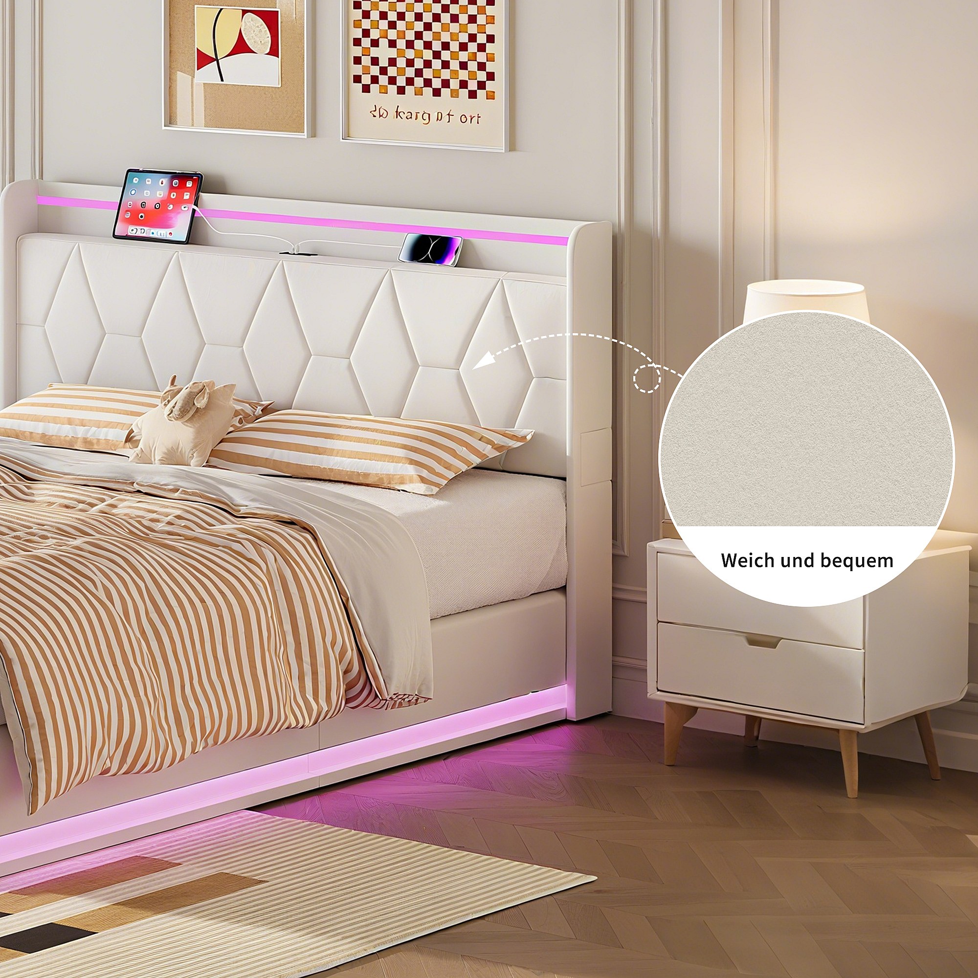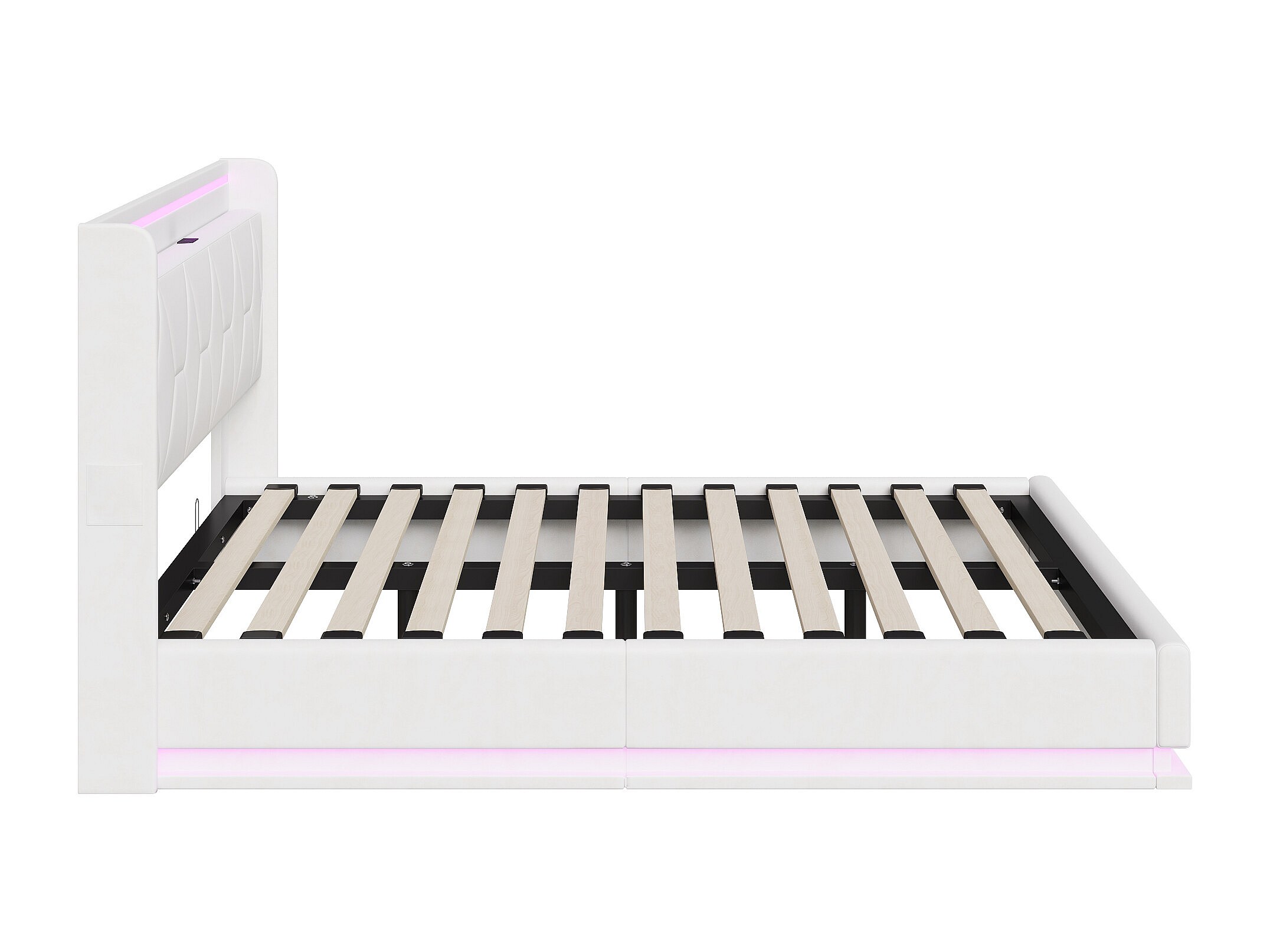 Cama de casal 160x200 com LED e USB, cama com arrumação e estrado de ripas e cabeceira, veludo, branco
