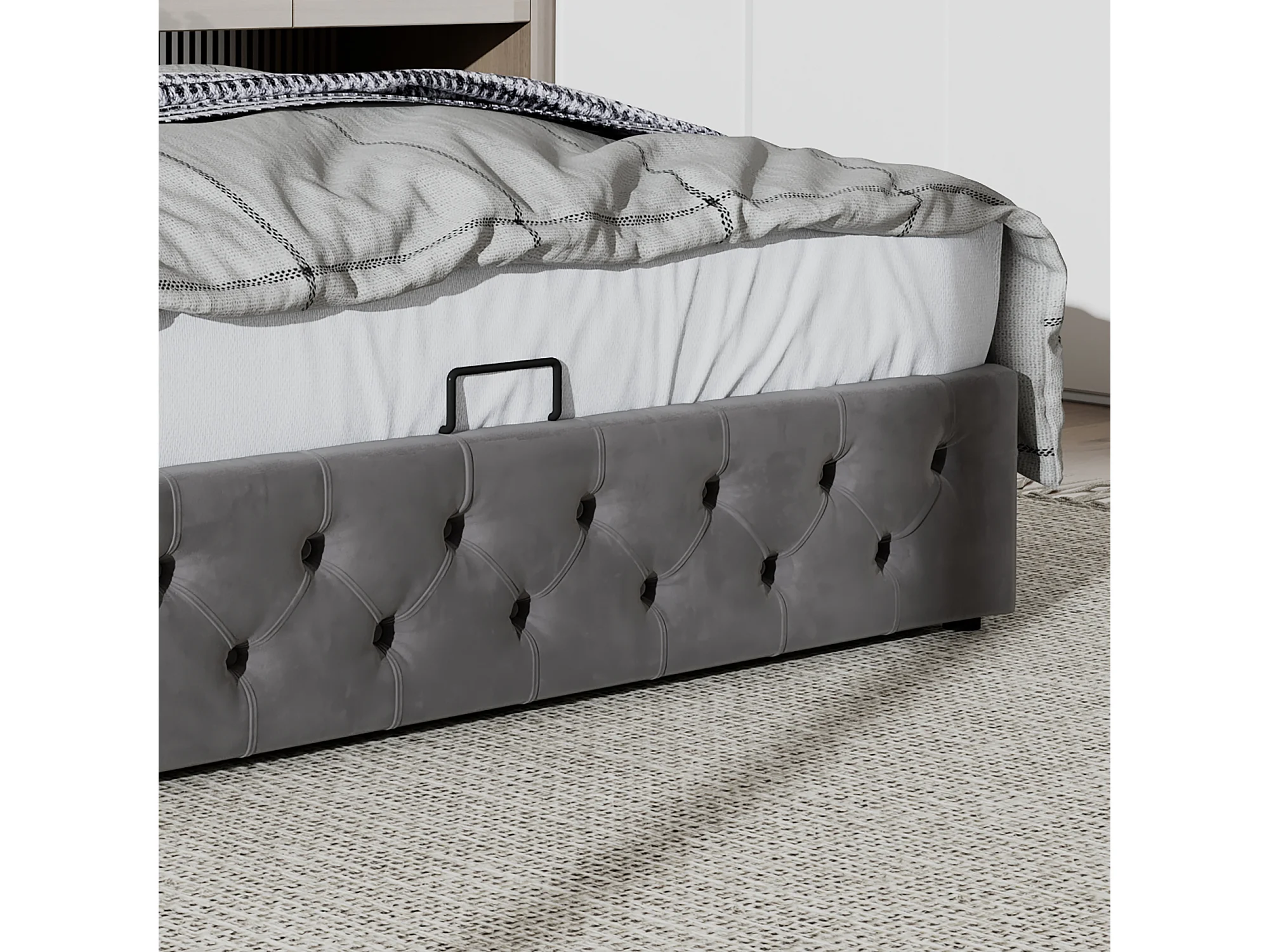 Cama de casal 160 x 200 cm com armazenamento e gavetas, veludo, base de ripas, cama hidráulica, cinza