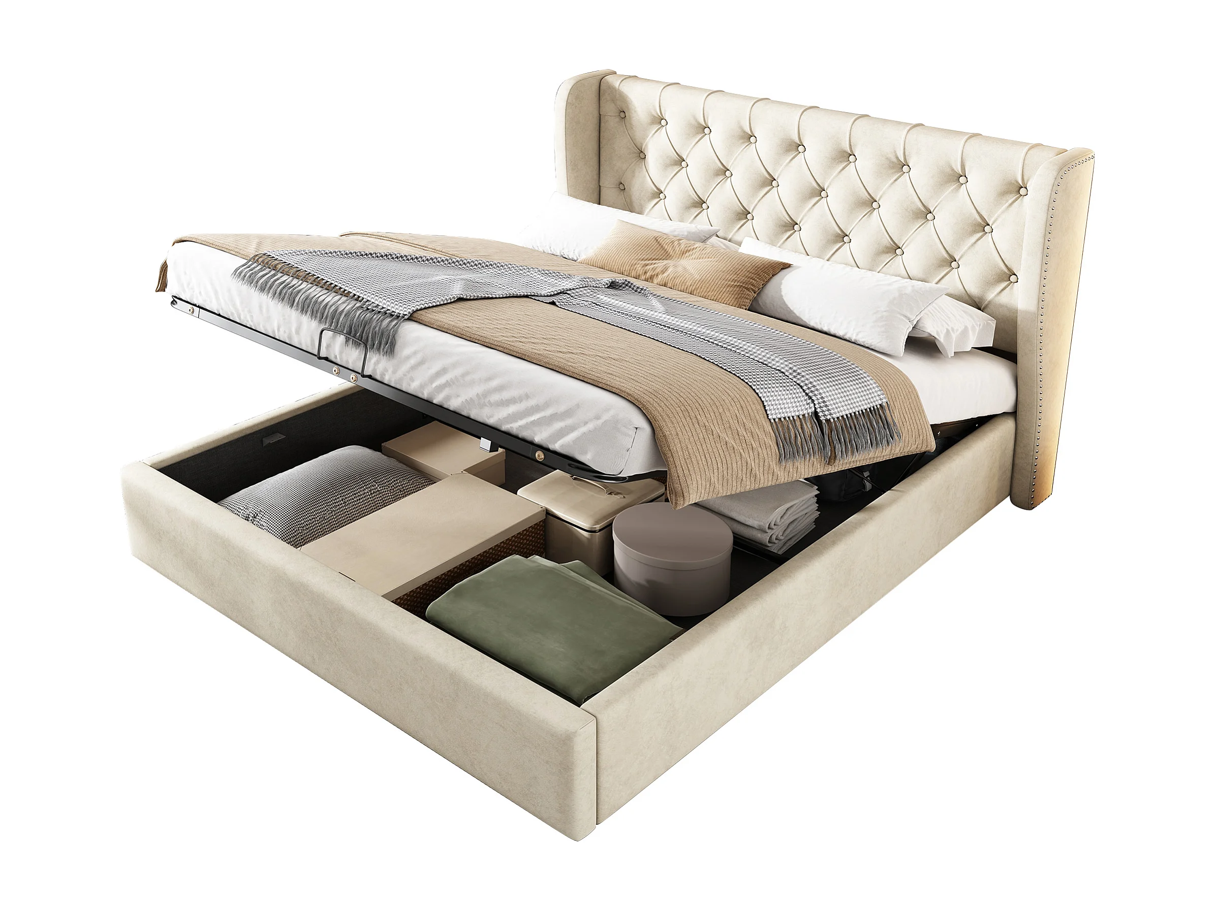 Cama de casal 160x200 em veludo bege, almofada para orelhas com armazenamento hidráulico e base de ripas