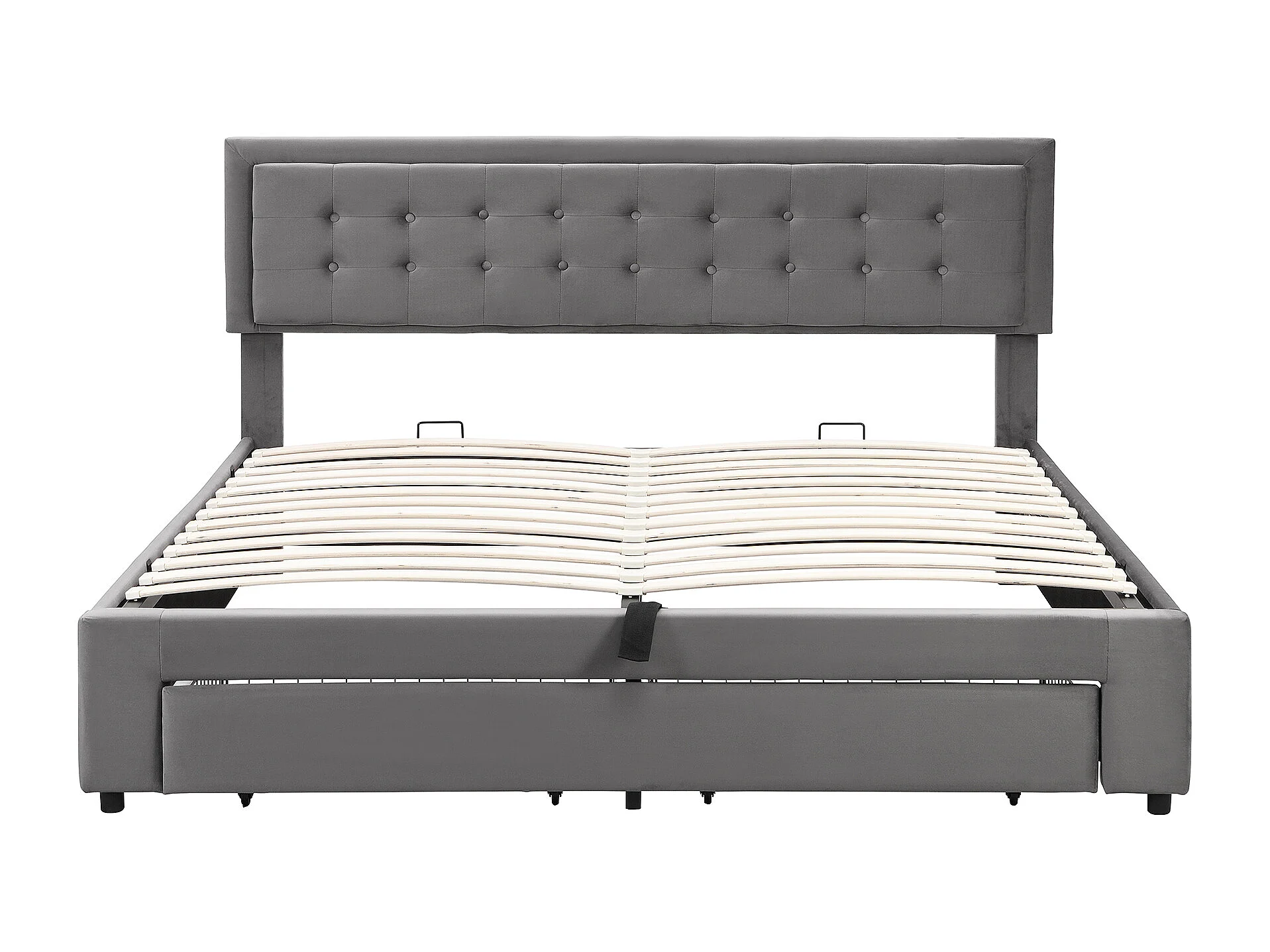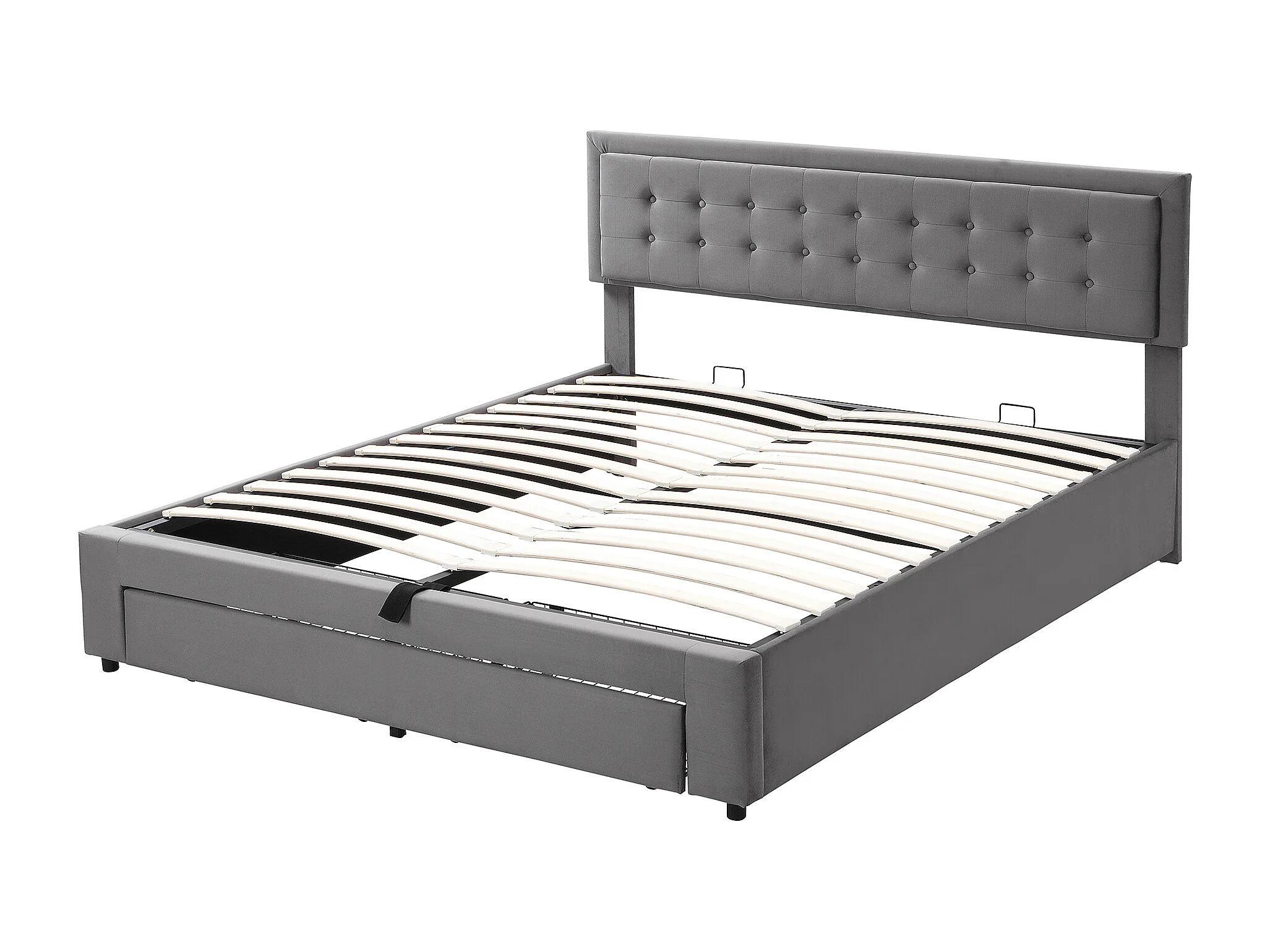 Cama de casal 160 x 200 cm com armazenamento e gavetas, veludo, base de ripas, cama hidráulica, cinza