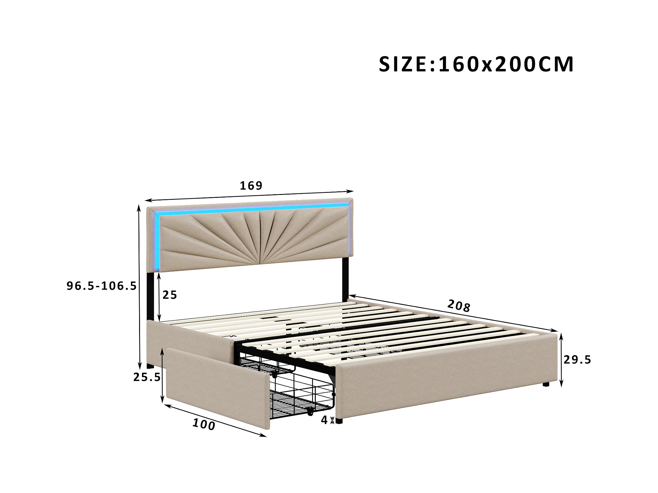 Cama de casal estofada 160x200 com cabeceira Led e carregador USB C + 4 gavetas, bege, (sem colchão)