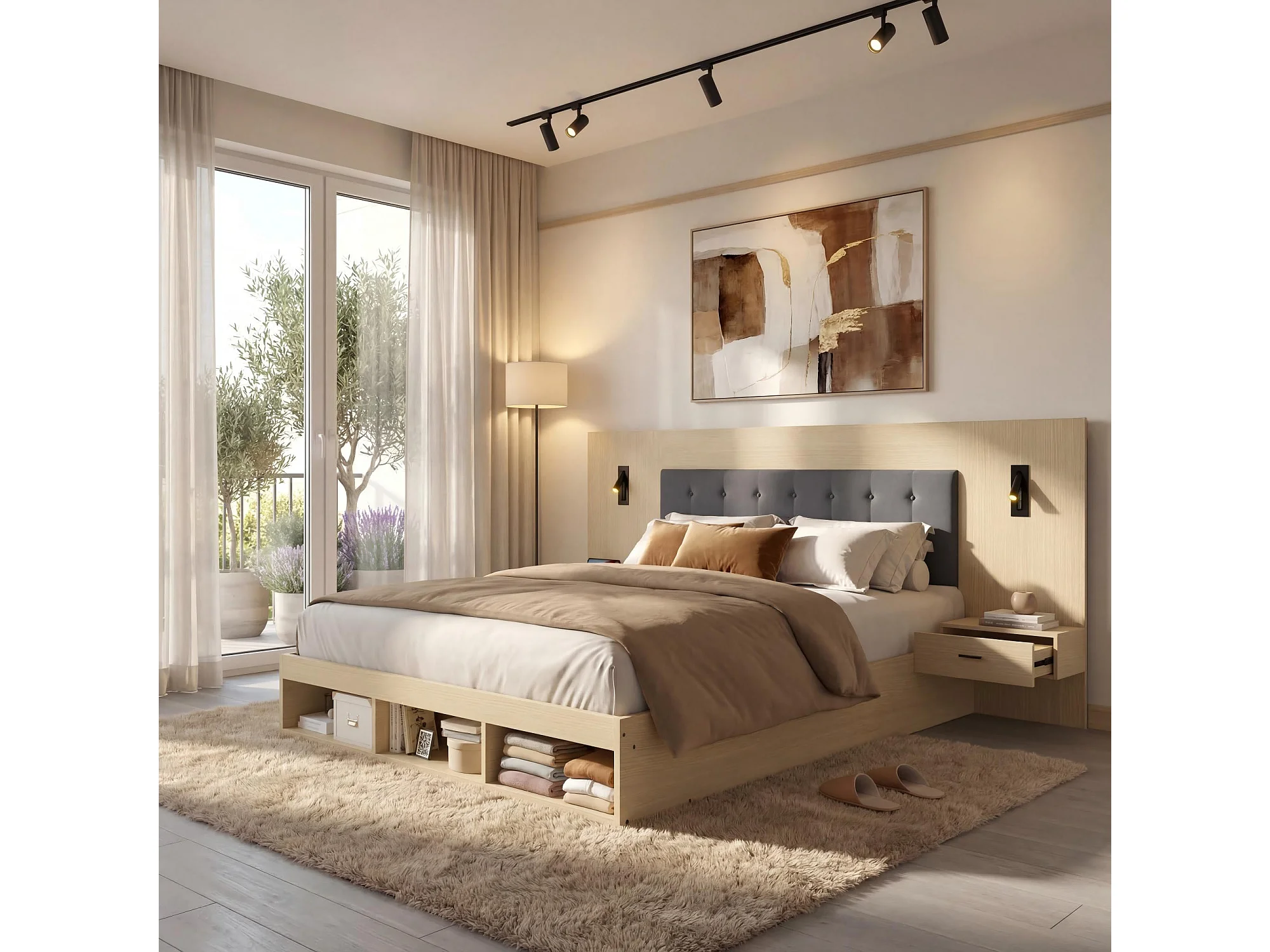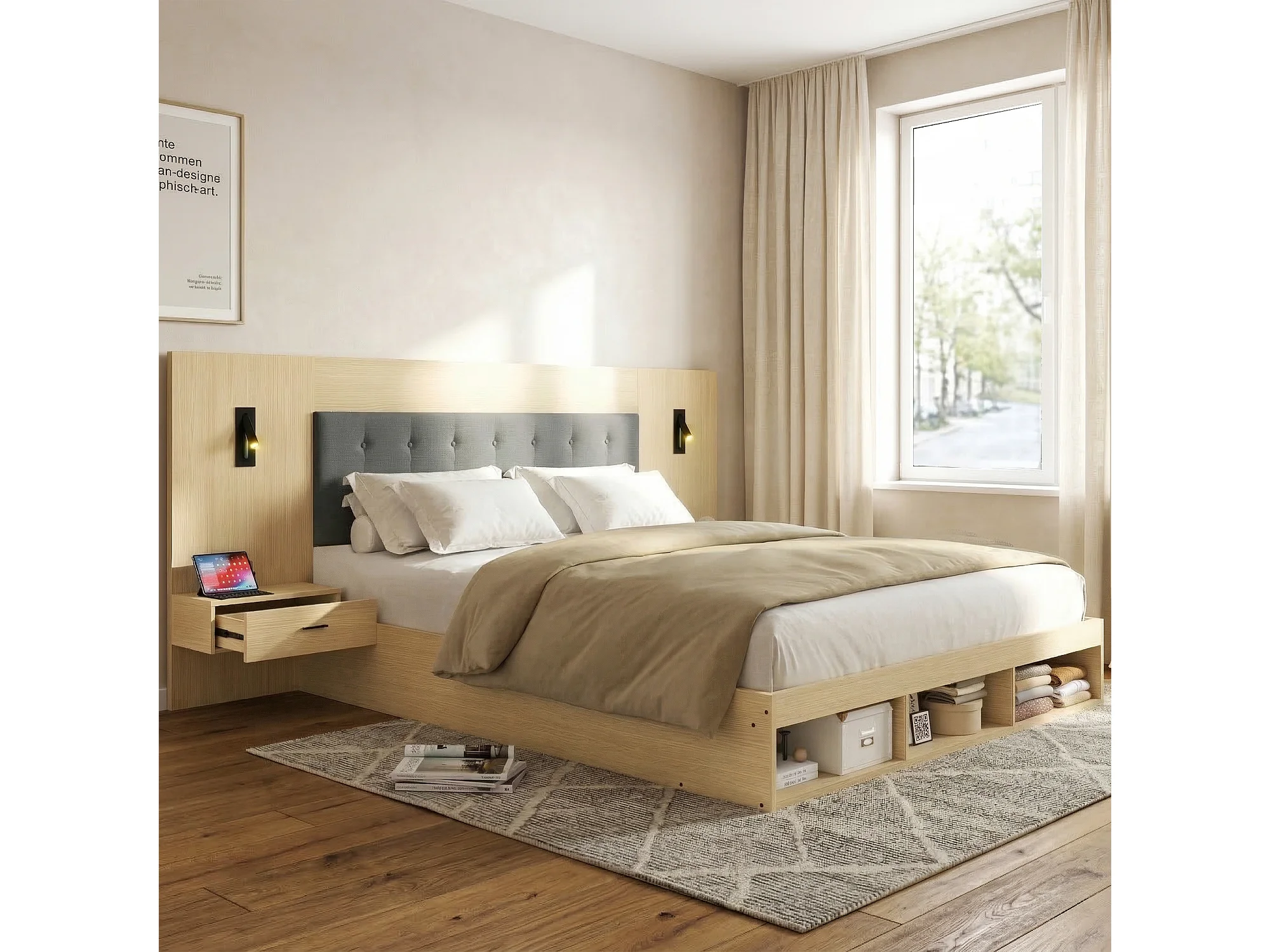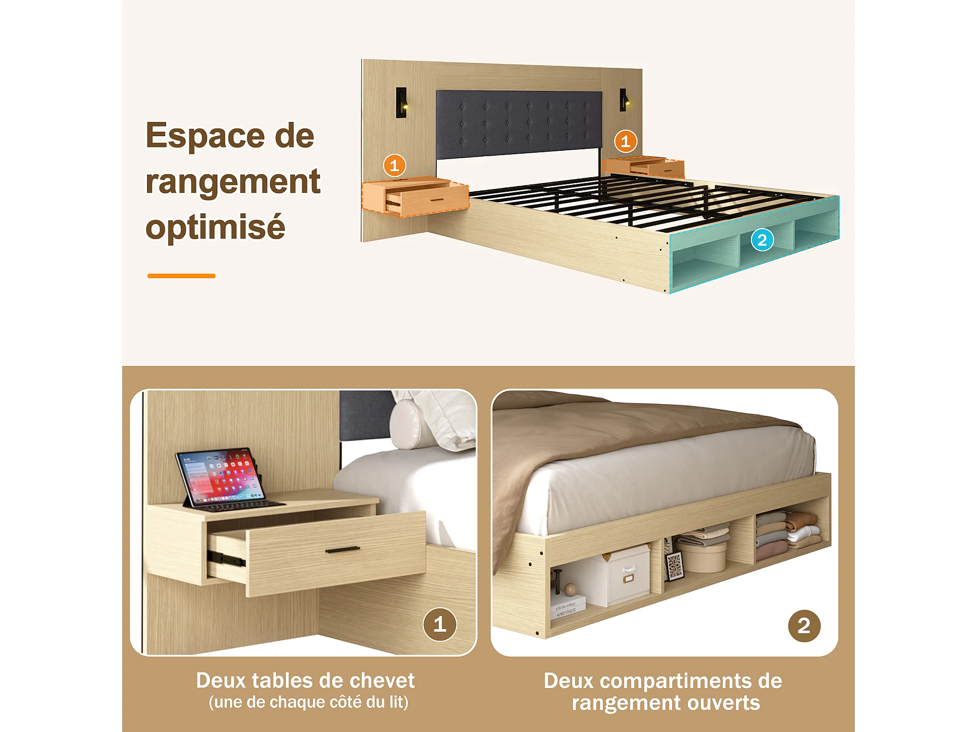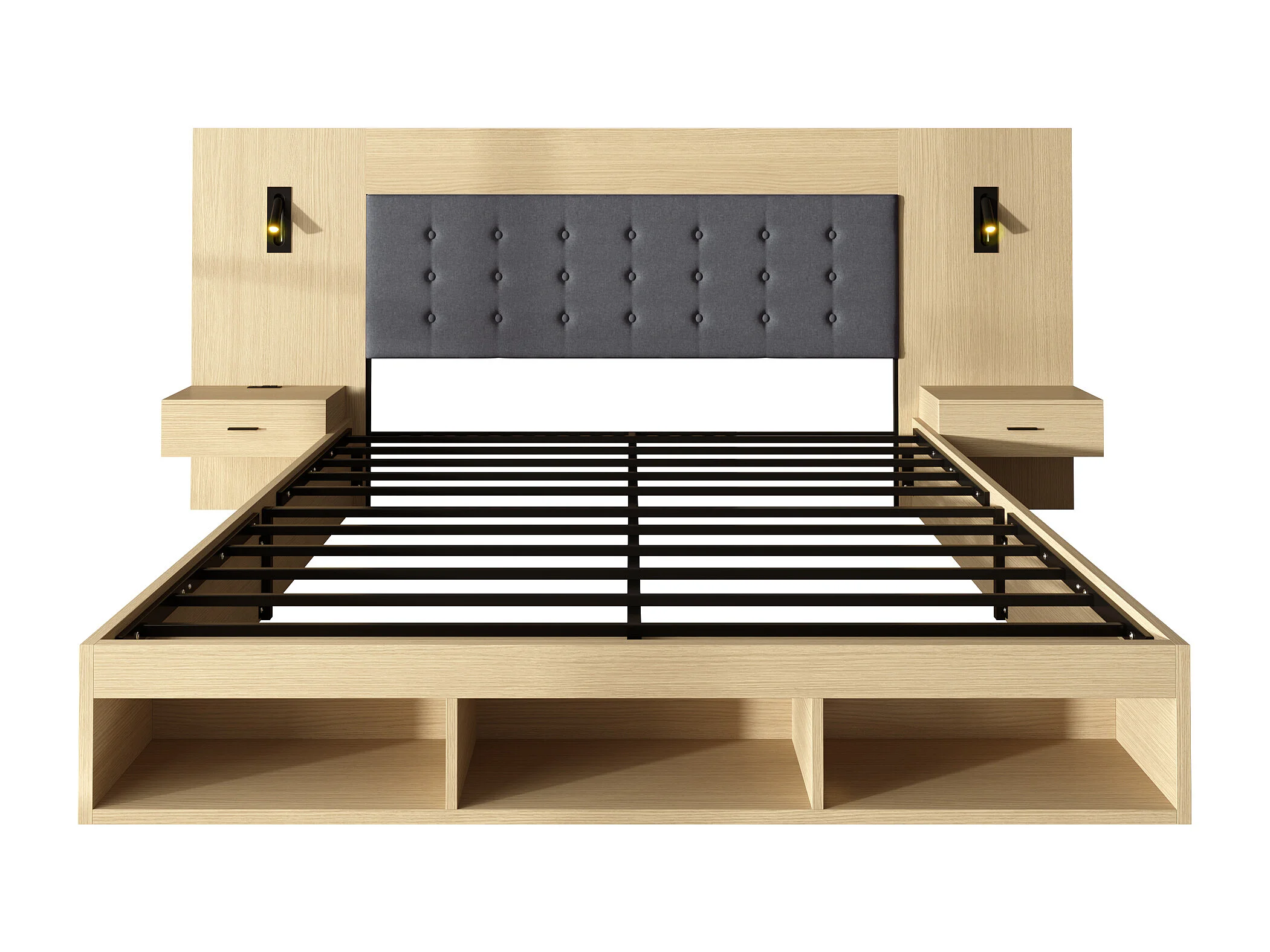 Cama de casal 180 x 200 cm com USB, Tipo-C e 2 mesas de cabeceira - Cor madeira clara