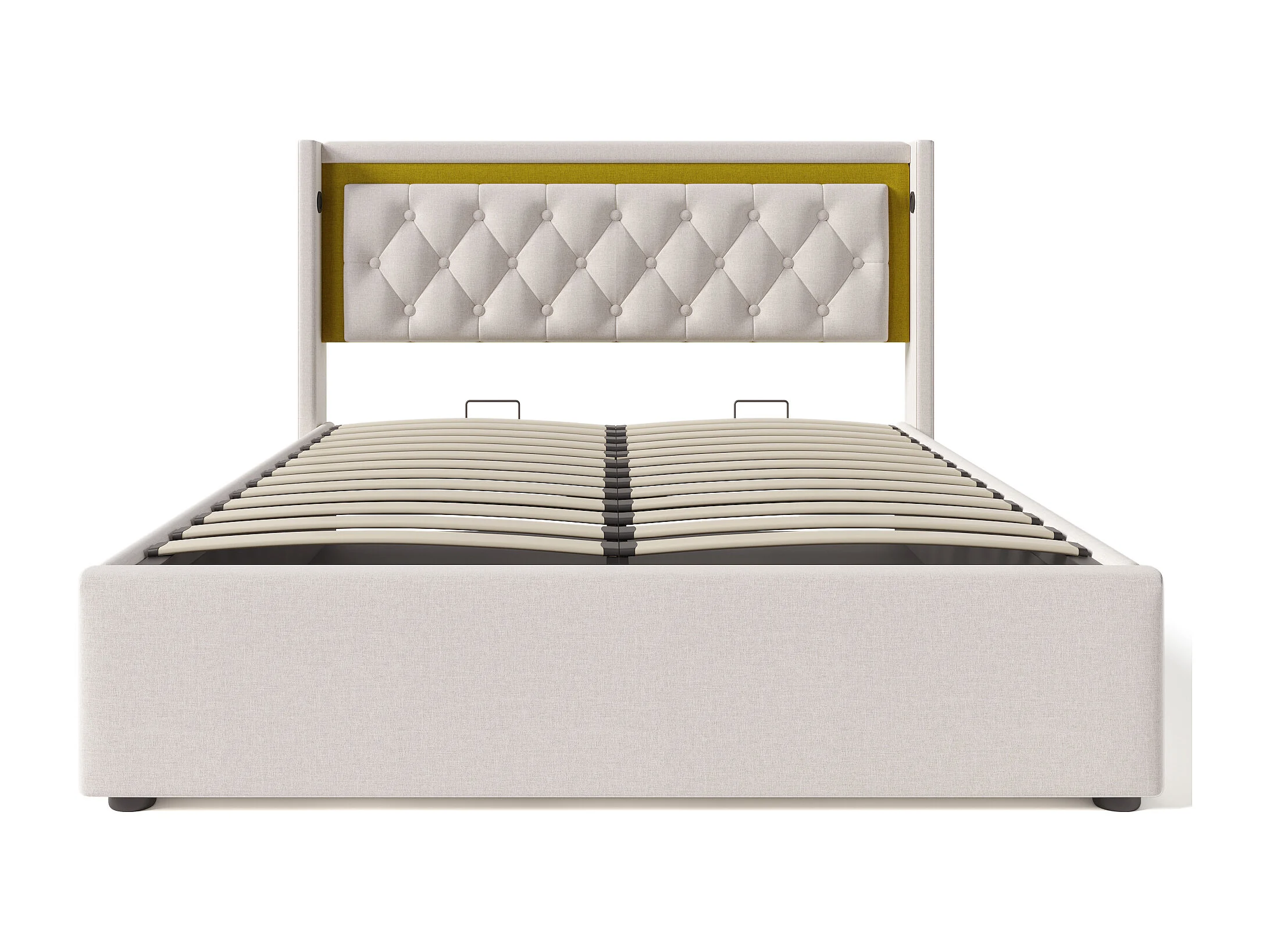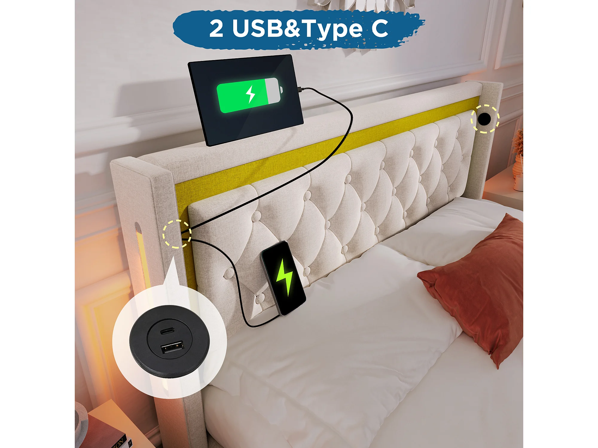 Cama de casal com arrumação, colchão e LED, 160x200 cm - Cama de casal para adultos com USB e Tipo-C - Tecido de algodão bege