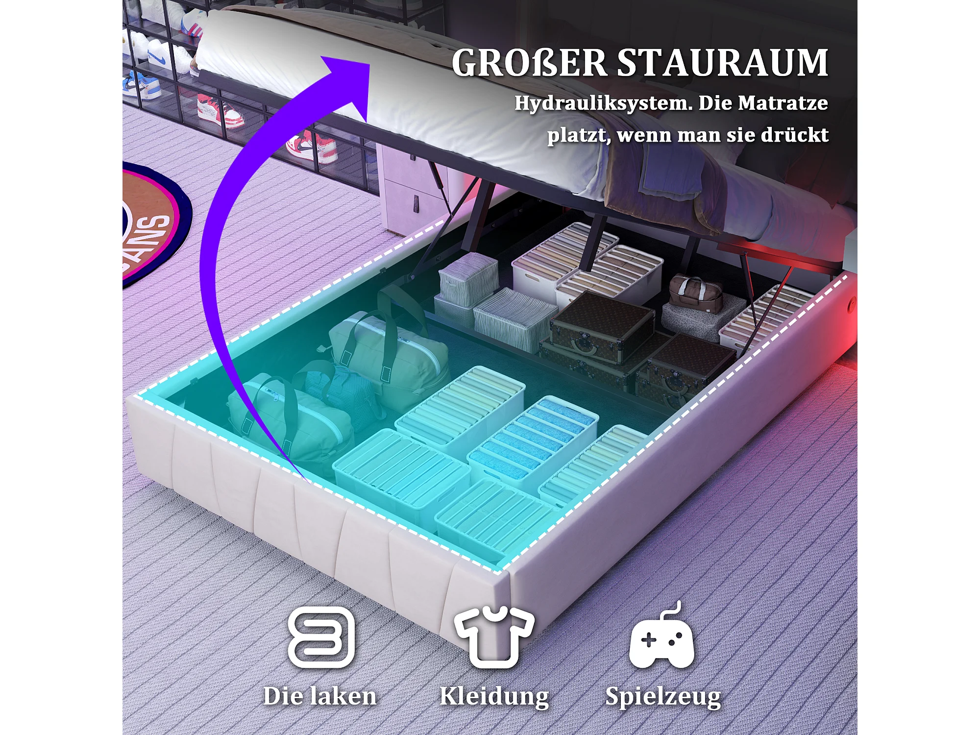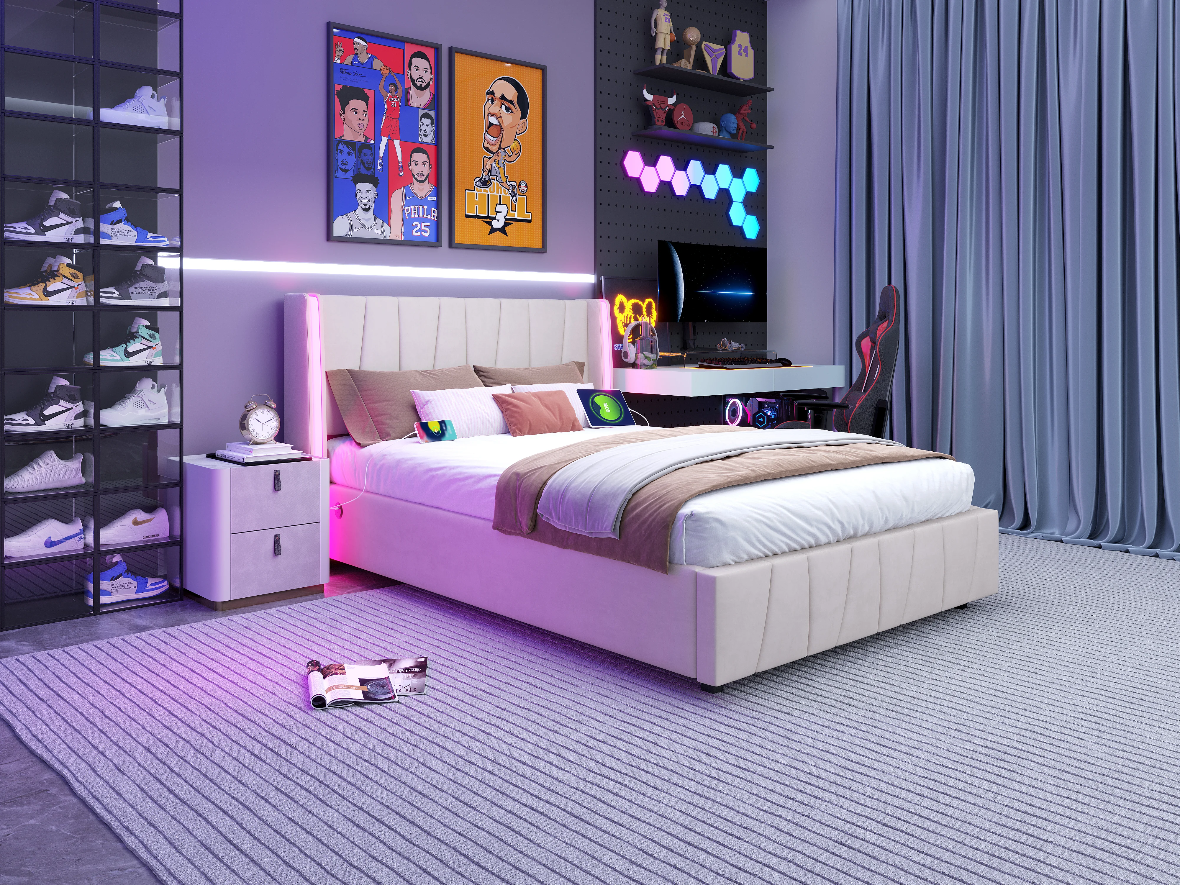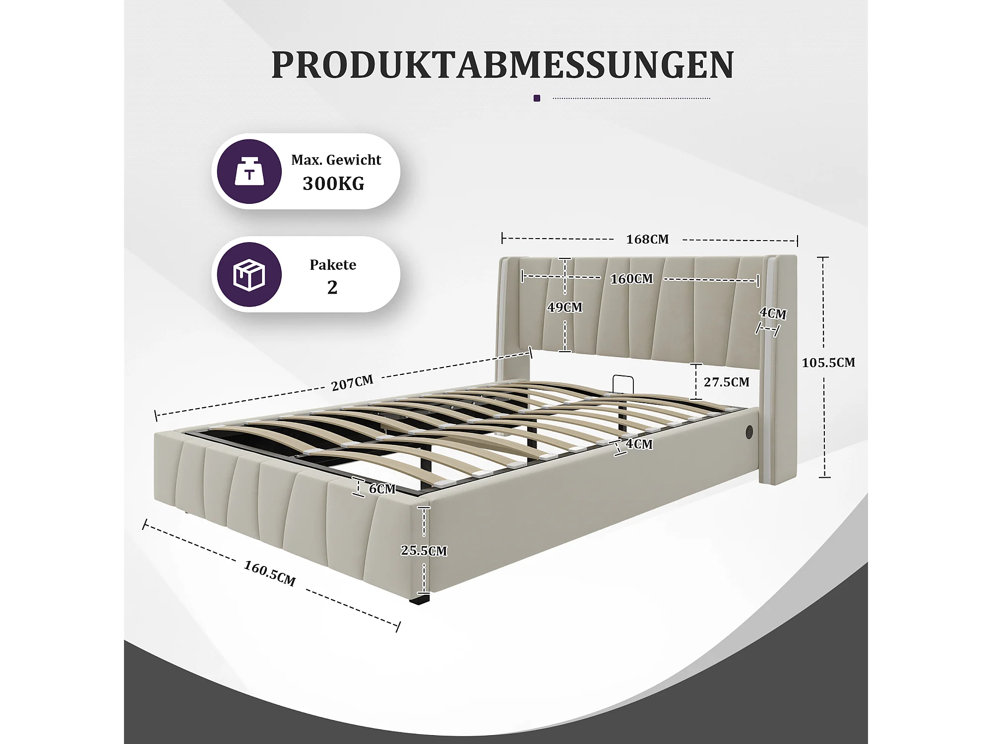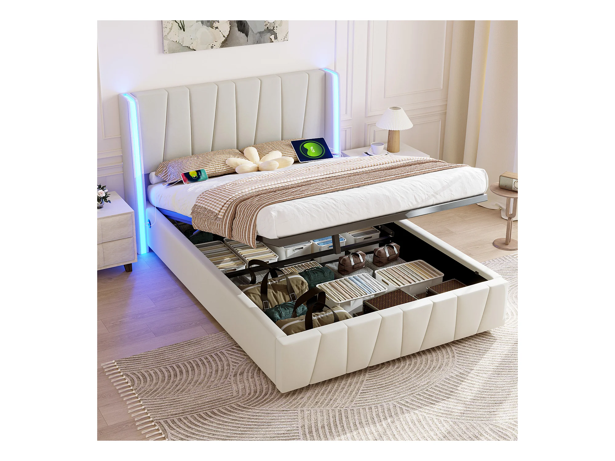 Cama de casal com gavetão estofada - 160 x 200 cm - com portas USB + LEDs - compartimento hidráulico - veludo - bege
