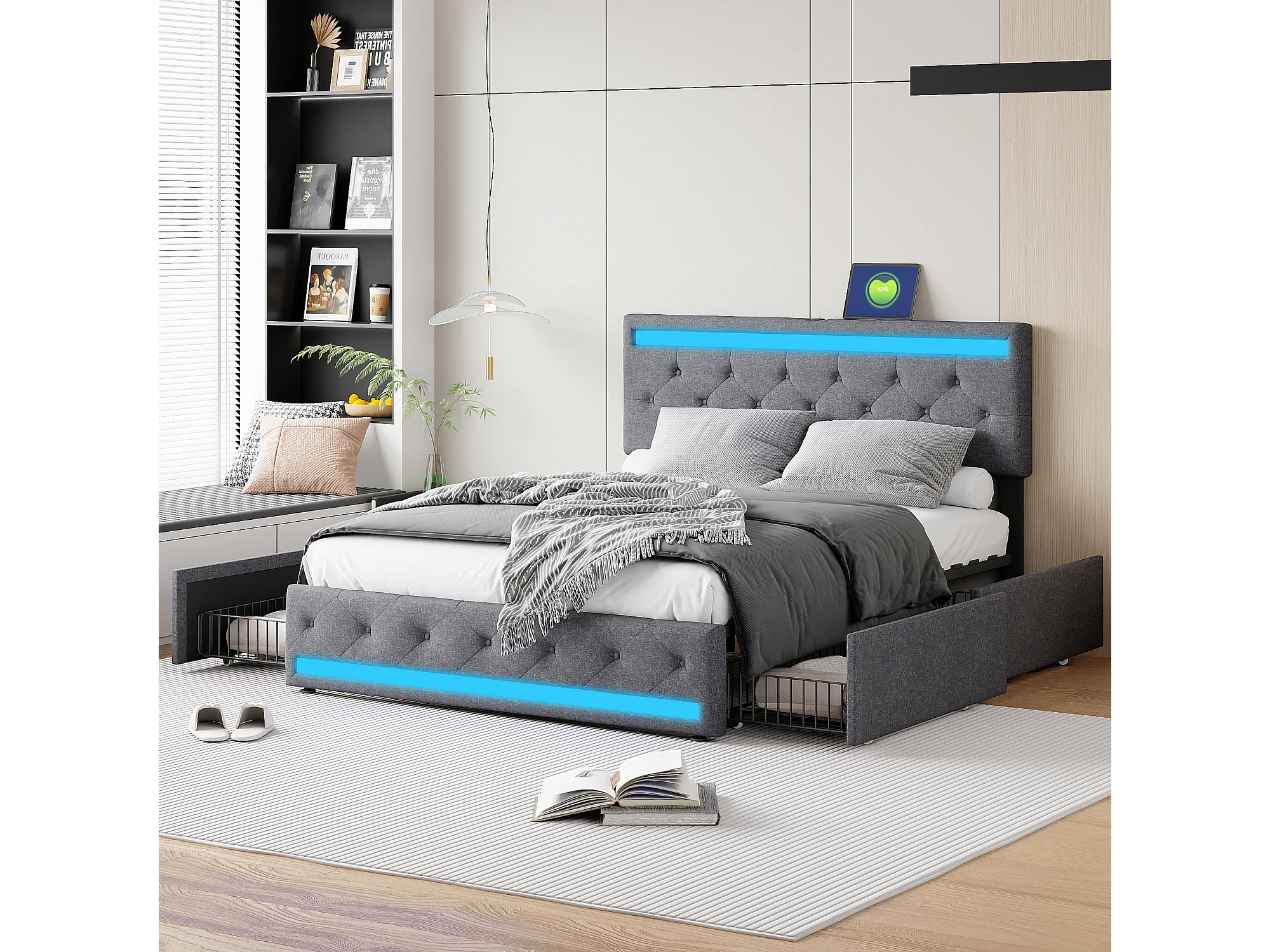Cama de casal com gavetas 160x200 cm, com cabeceira LED ajustável, com carregamento USB e Tipo-C, Cinza