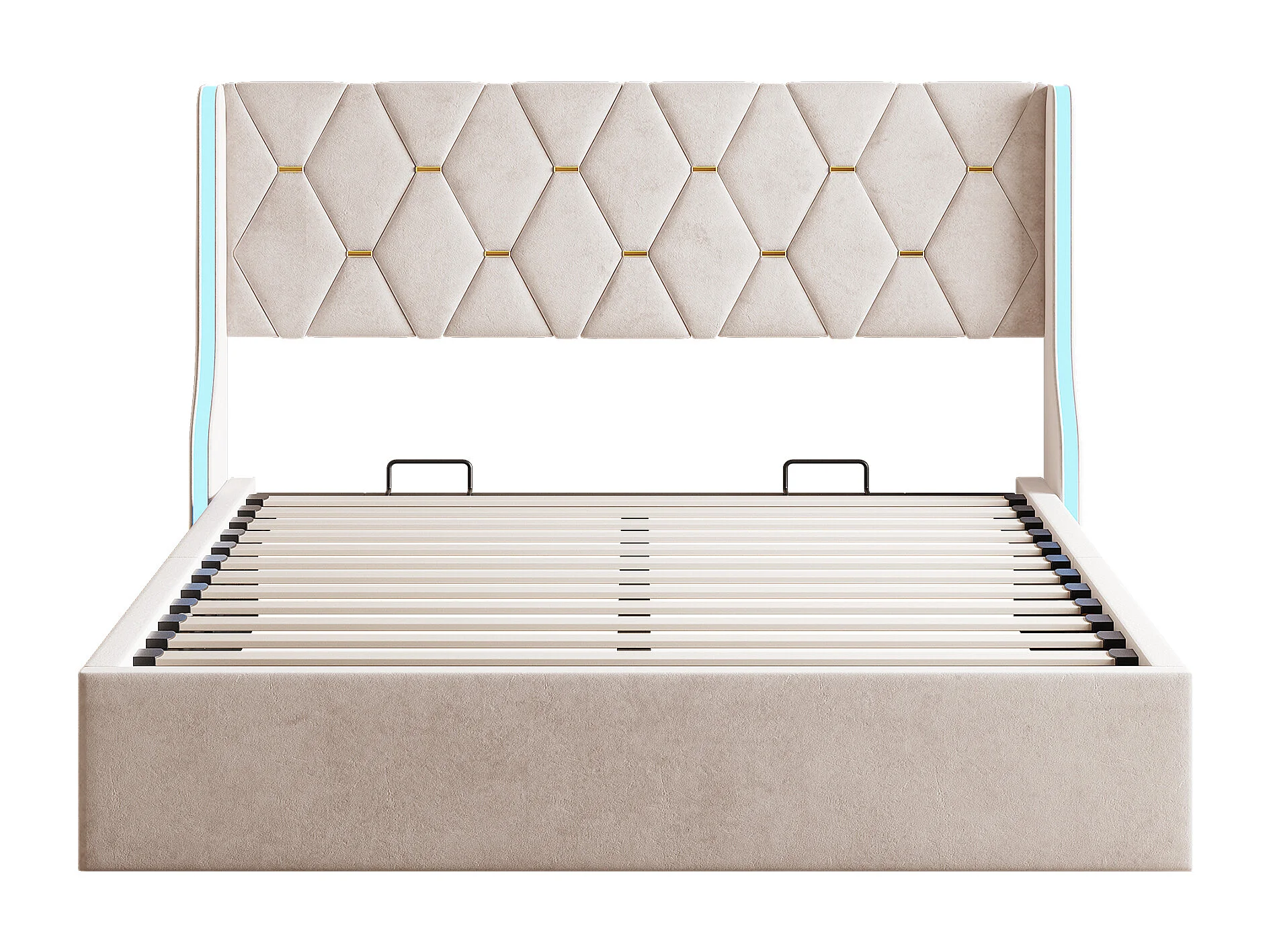 Cama de casal estofada, 140 x 190 cm, com LED e porta USB, com estrado de ripas, veludo, bege.