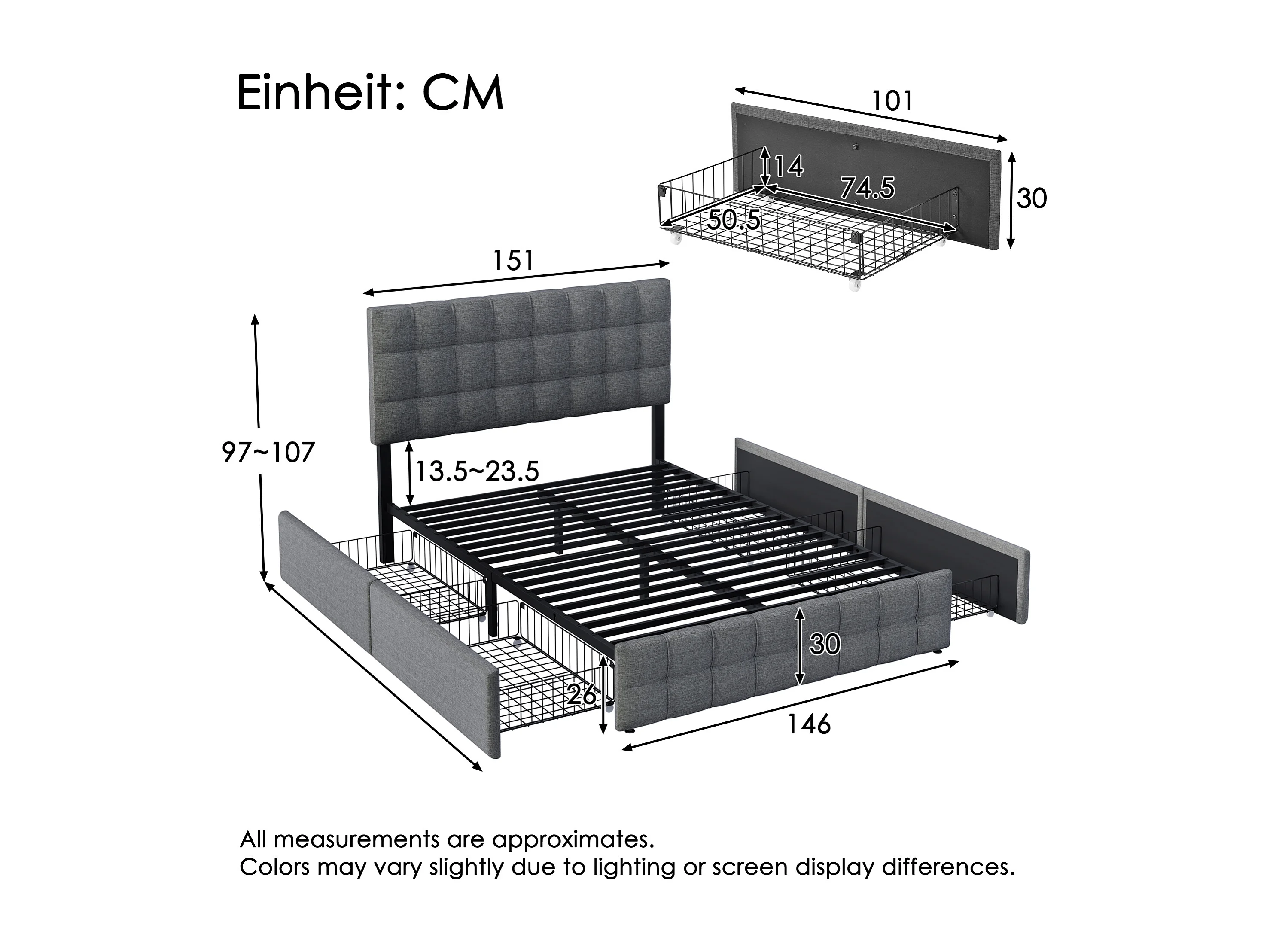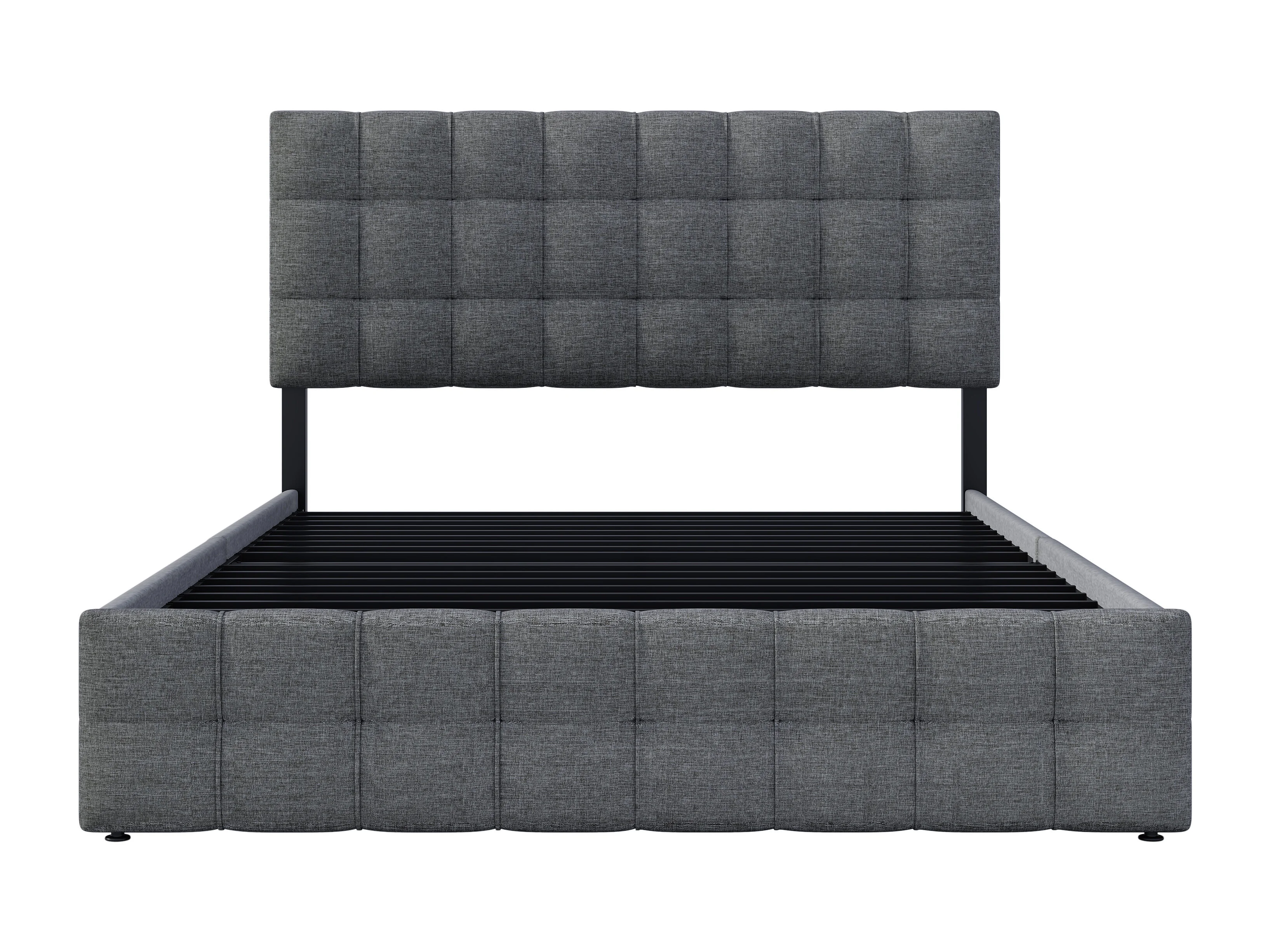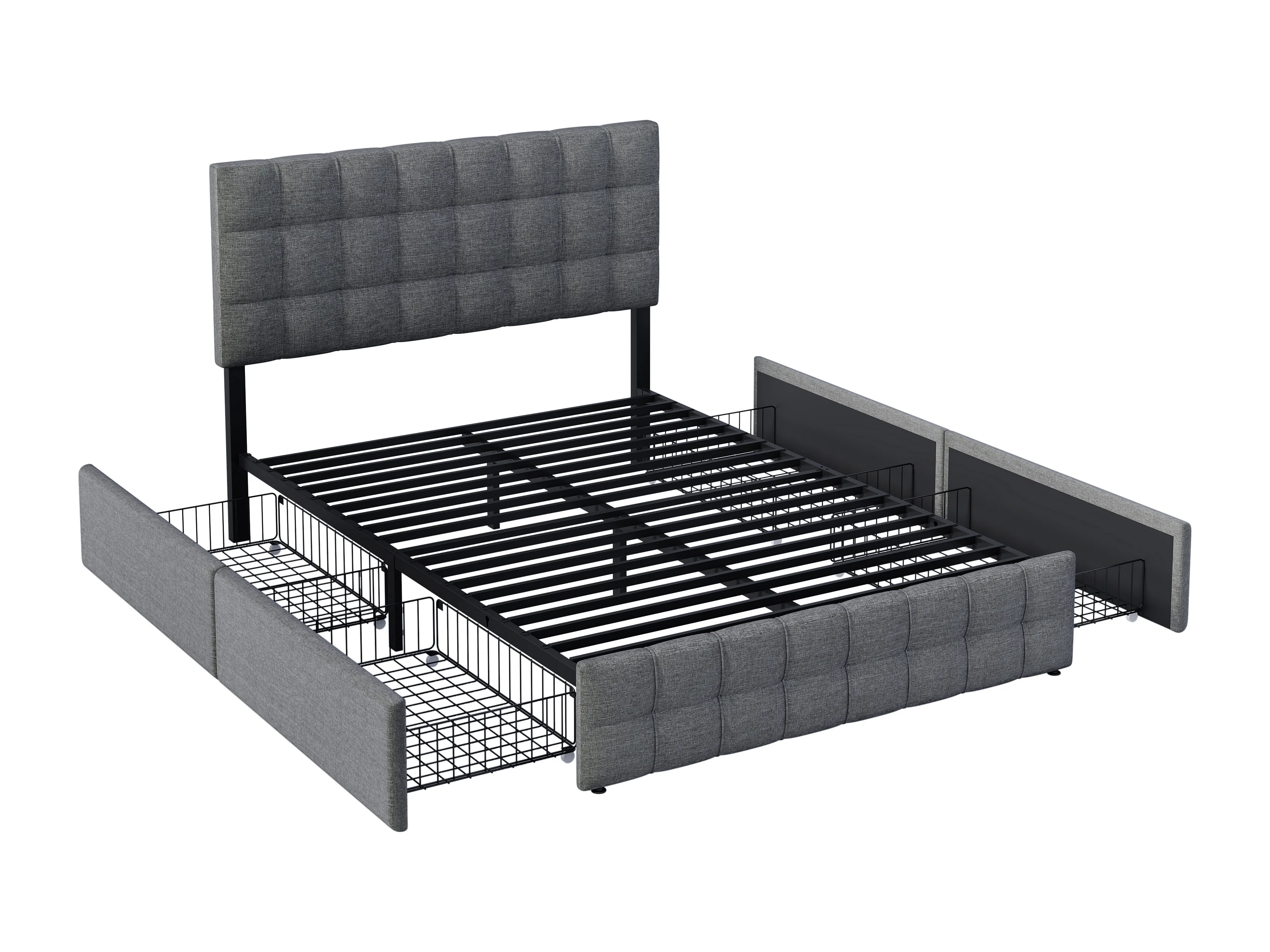 Cama de casal estofada - 140 x 200 cm - com 4 gavetas + cabeceira ajustável - estrado de ripas metálicas - roupa de cama - cinza (com colchão)
