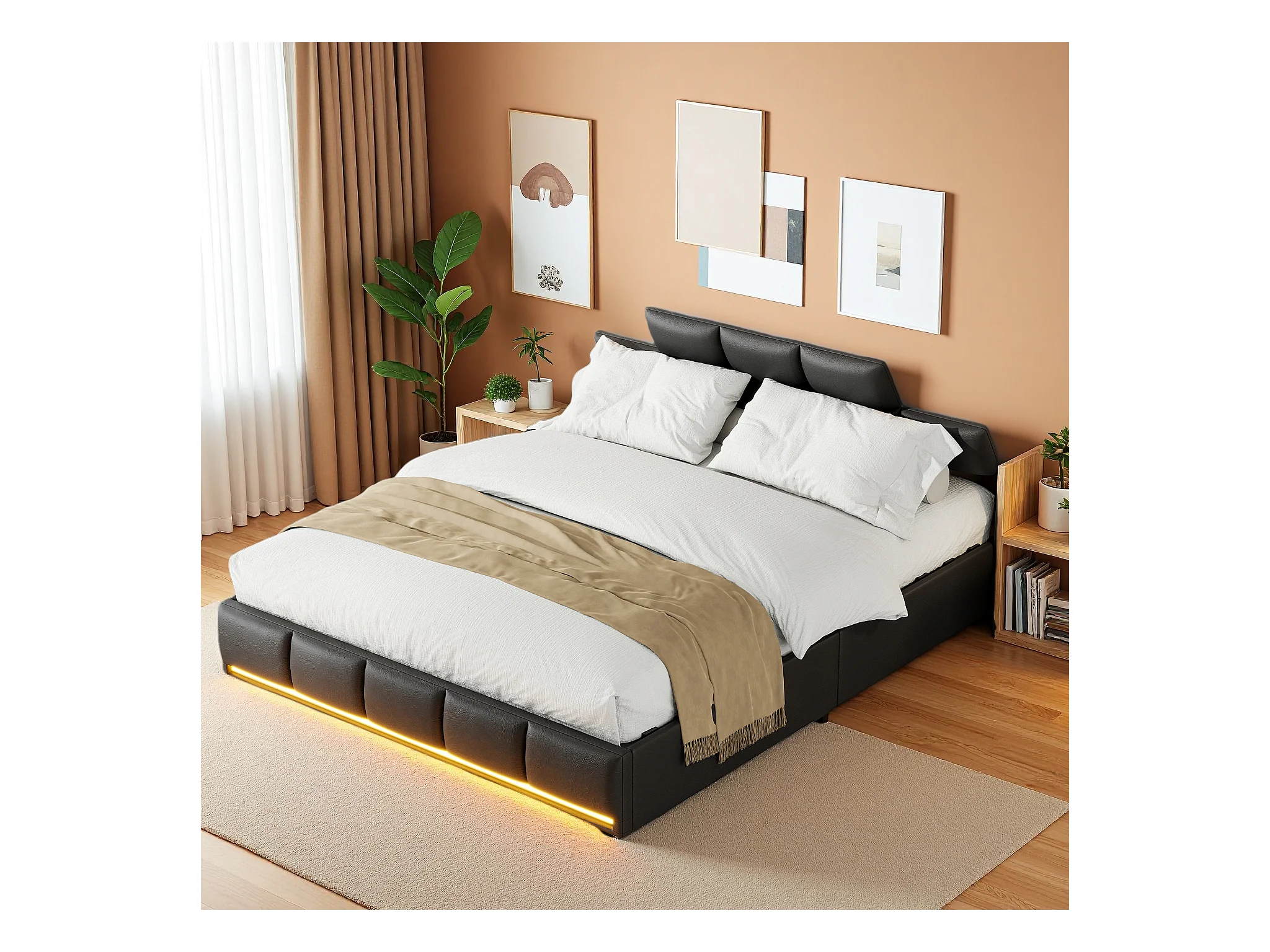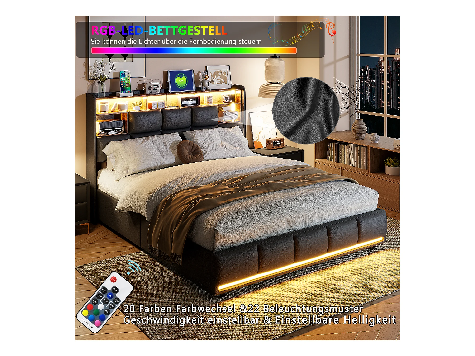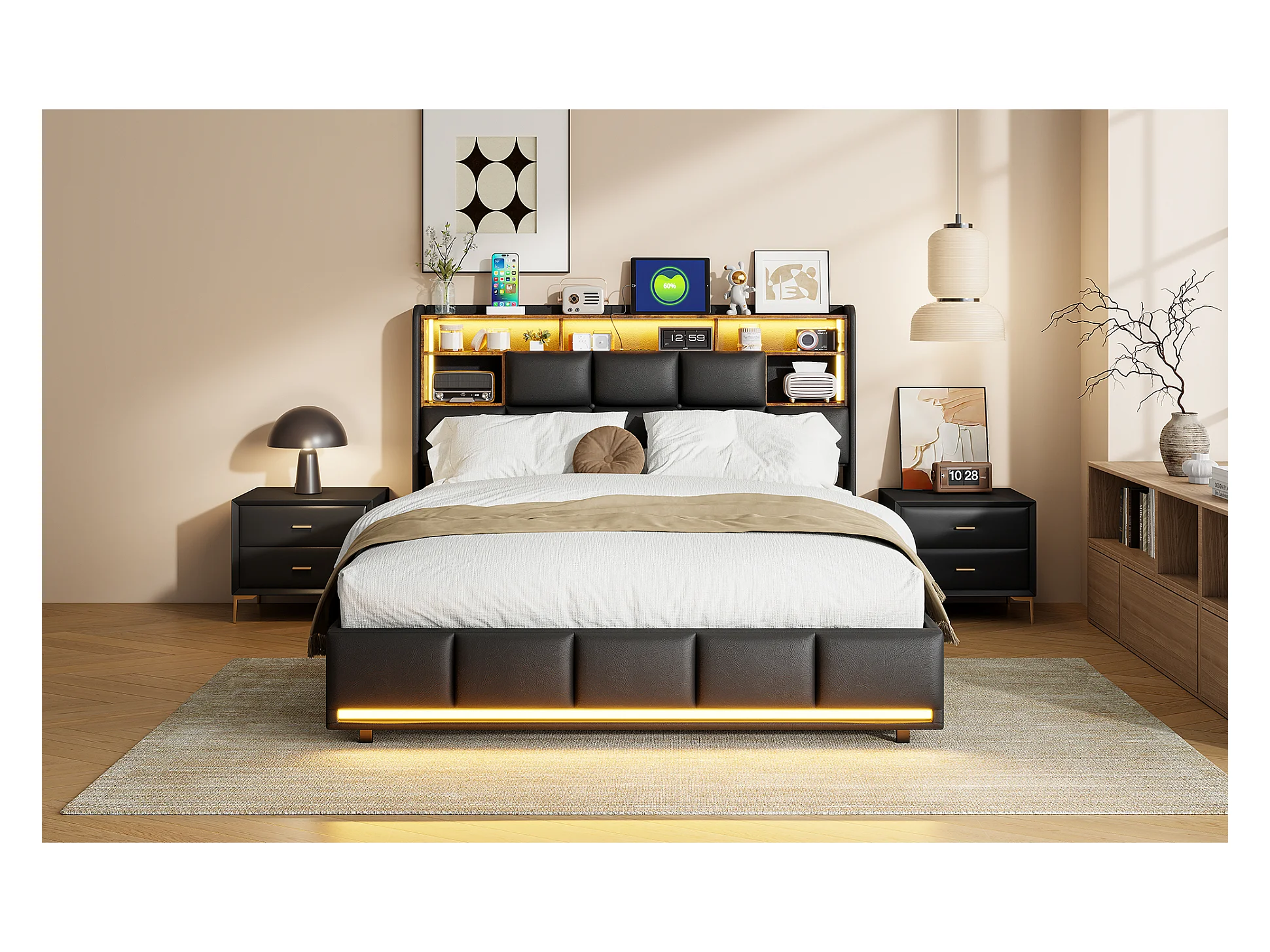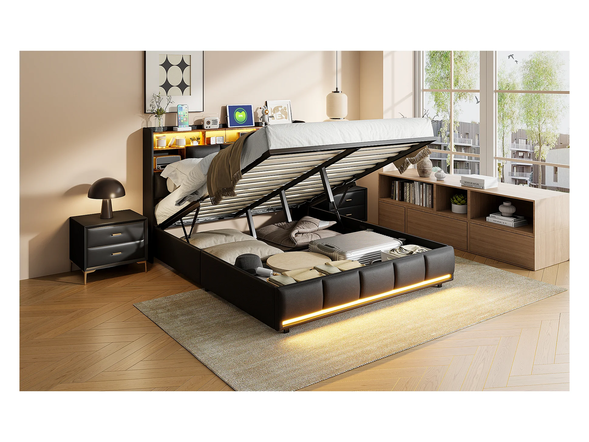Cama de casal estofada 140x200 cm preta, com LED, cabeceira, arrumação hidráulica, base elevatória e estação de carregamento integrada