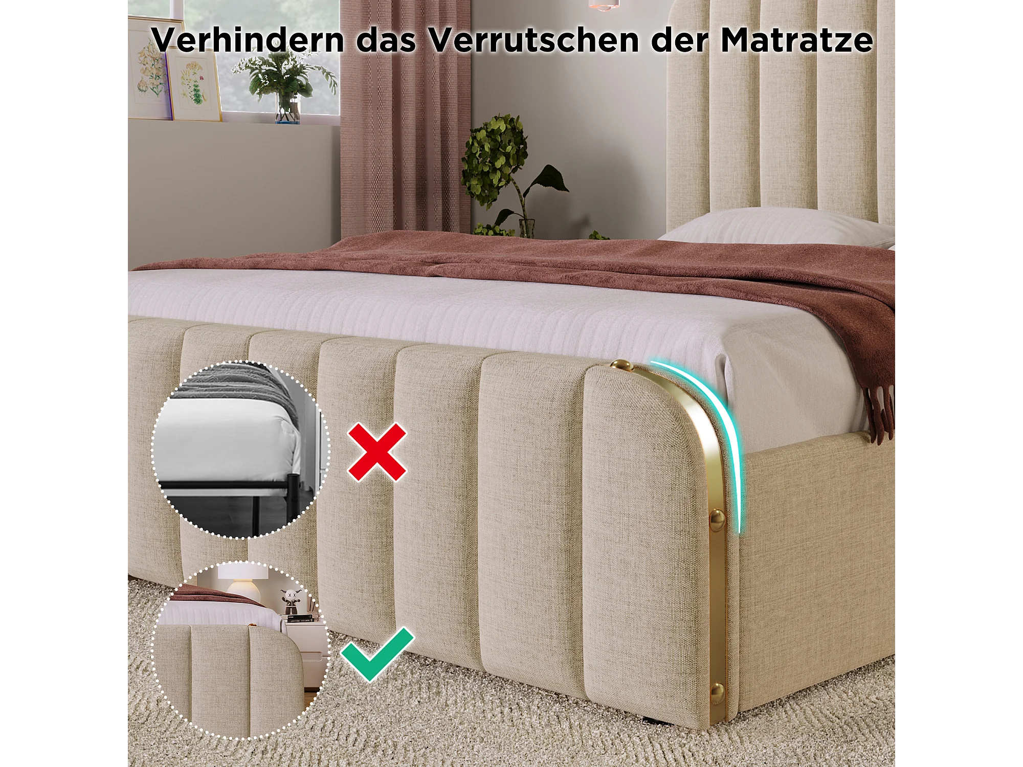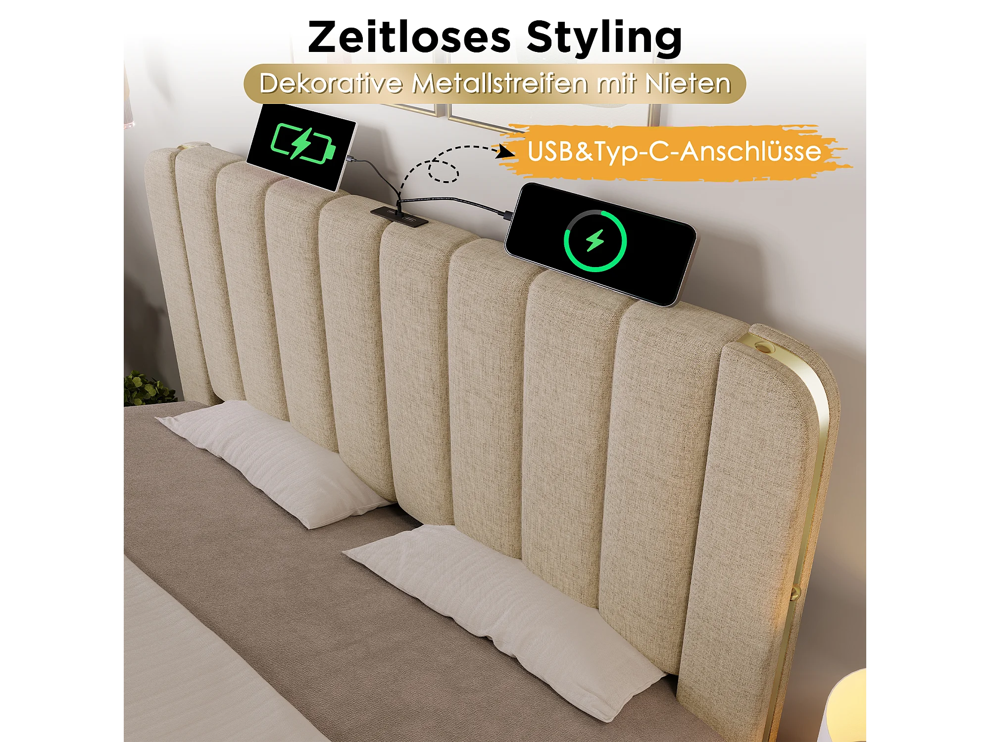Cama de casal estofada - 160 x 200 cm - com cabeceira + USB + armazenamento hidráulico - linho - bege (com colchão)