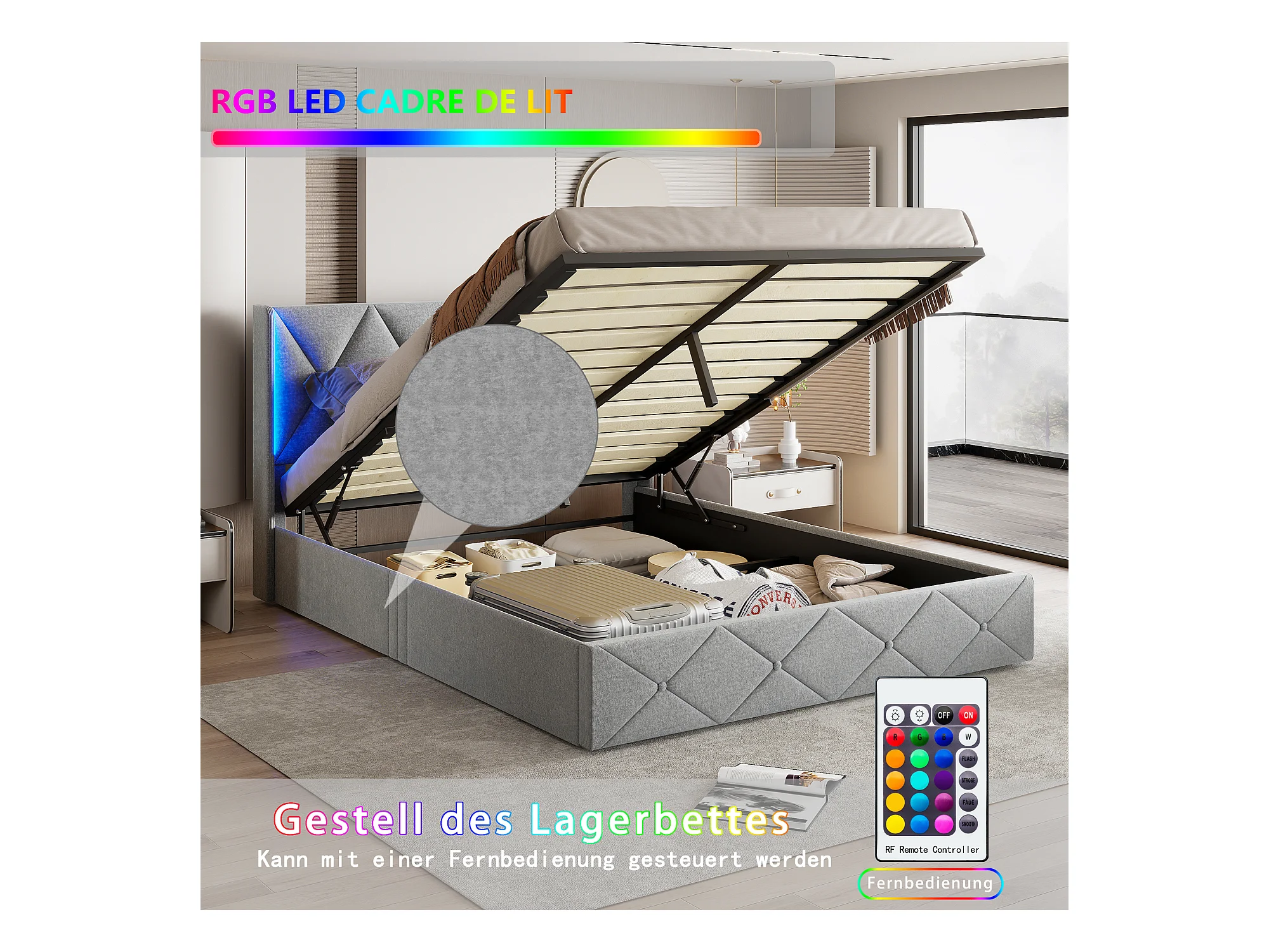 Cama de casal estofada, 160 x 200 cm, LED, com espaço de arrumação, com estrado de ripas, Cinzento