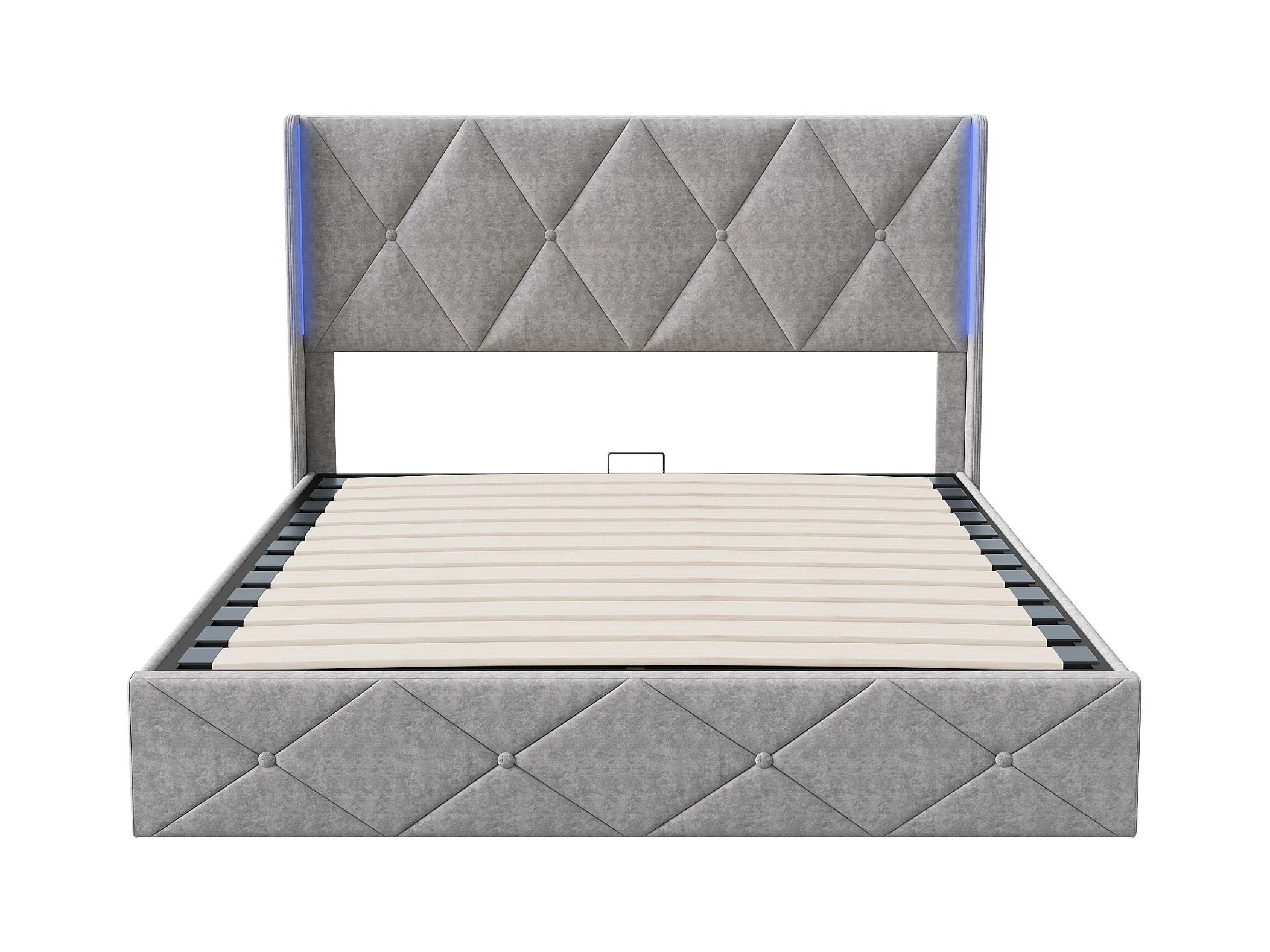 Cama de casal estofada 160x200 cm, com LED, cama de arrumação com estrado de ripas, Cinza