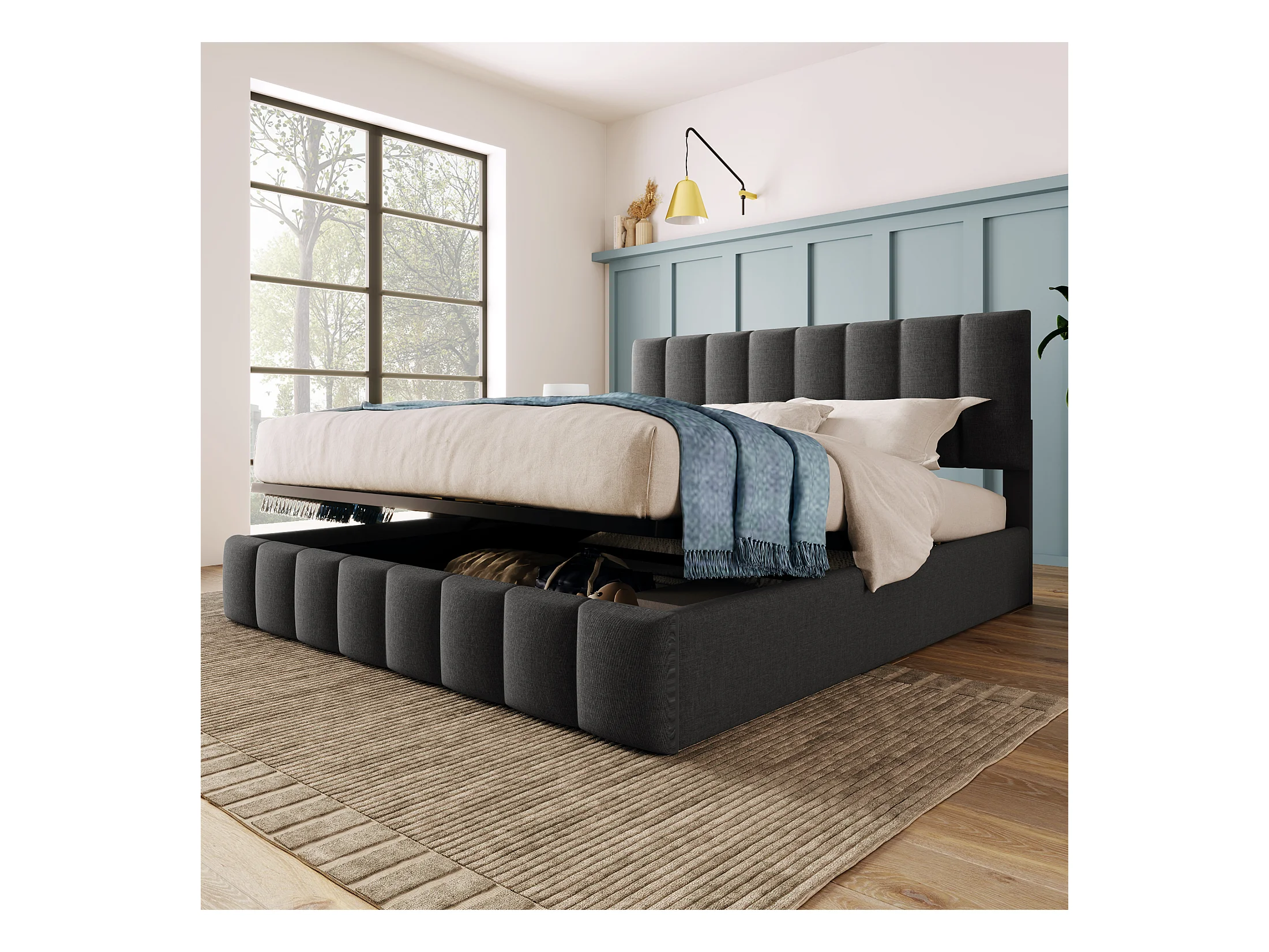 Cama de casal estofada com arrumação - 140 x 200 cm - com cabeceira ajustável + estrado de ripas metálicas - linho - cinza (com colchão)