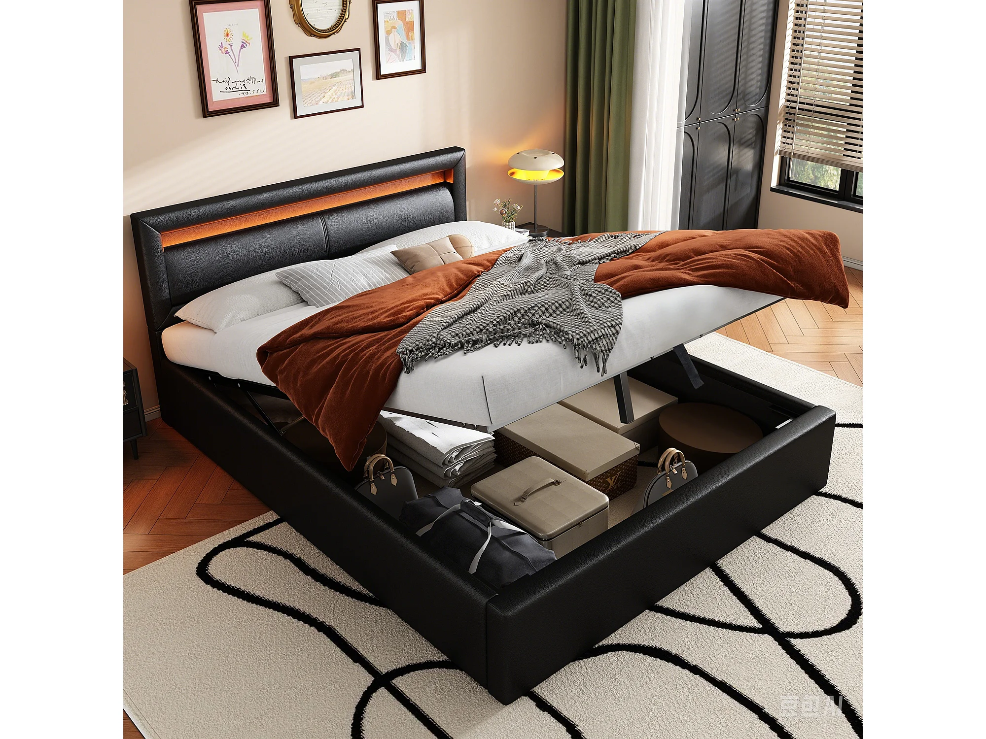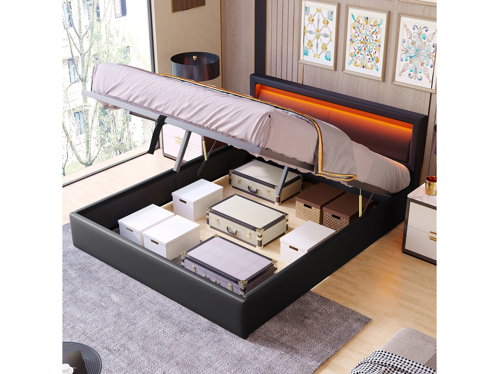 Cama de casal estofada com arrumação - 140 x 200 cm - com LEDs + estrado de ripas + arrumação hidráulica - PU - preta