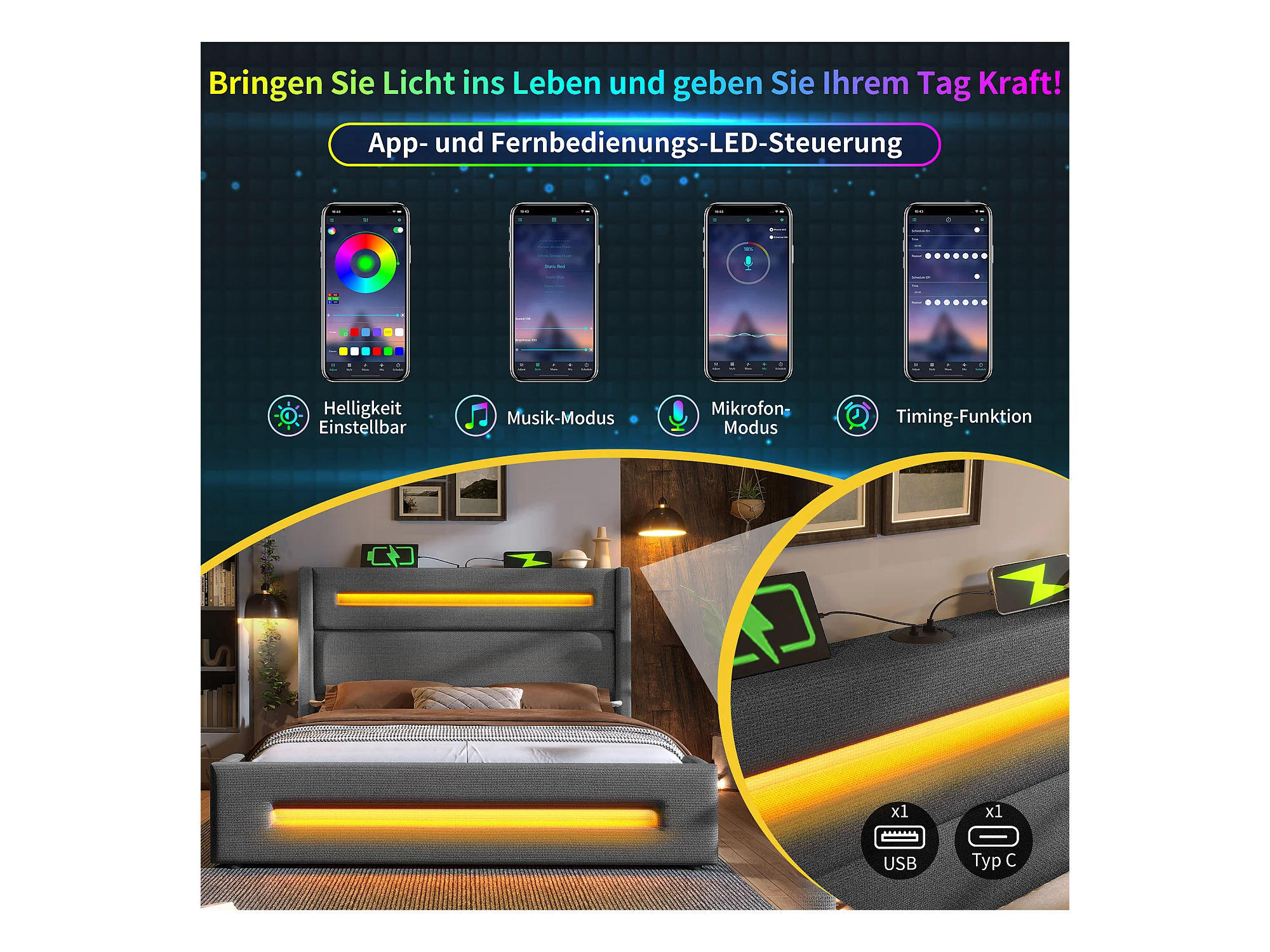 Cama de casal estofada com arrumação - 180 x 200 cm - com LEDs + arrumação hidráulica + USB - linho - cinzento